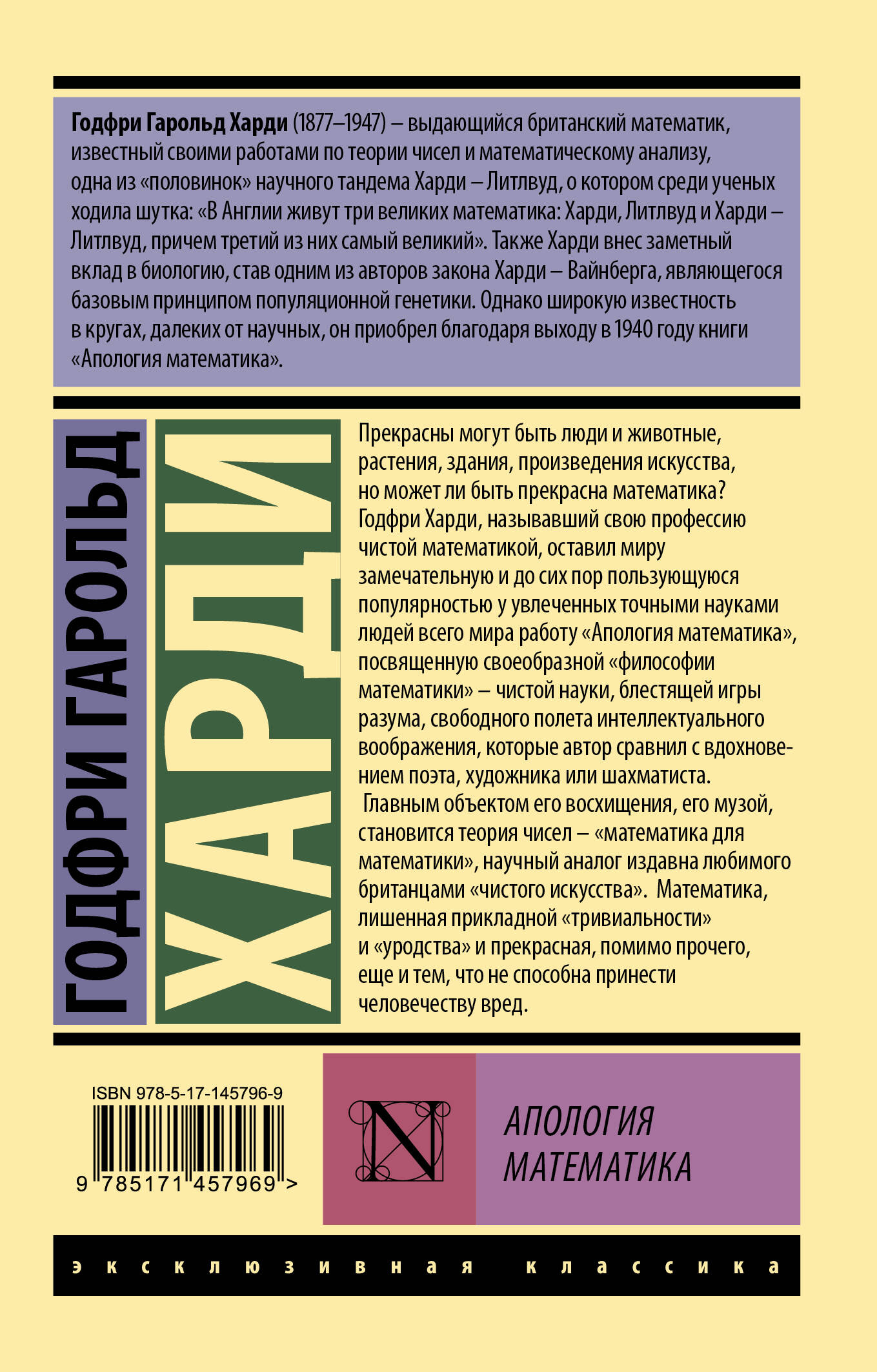 Прекрасны могут быть люди и животные, растения, здания, произведения искусства, -но может ли быть прекрасна математика? Годфри Харди, называвший свою профессию "чистой математикой", оставил миру замечательную и до сих пор пользующуюся популярностью у увлеченных точными науками людей всего мира работу "Апология математика", посвященную своеобразной "философии математики" - чистой науки, блестящей игры разума, свободного полета интеллектуального воображения, которые автор сравнил с вдохновением поэта, художника или шахматиста. Главным объектом его восхищения, его музой, становится теория чисел - "математика для математики", научный аналог издавна любимого британцами "чистого искусства". Математика, лишенная прикладной "тривиальности" и "уродства" и прекрасная, помимо прочего, еще и тем, что не способна принести человечеству вред.| Издательство | ИЗДАТЕЛЬСТВО "АСТ" |