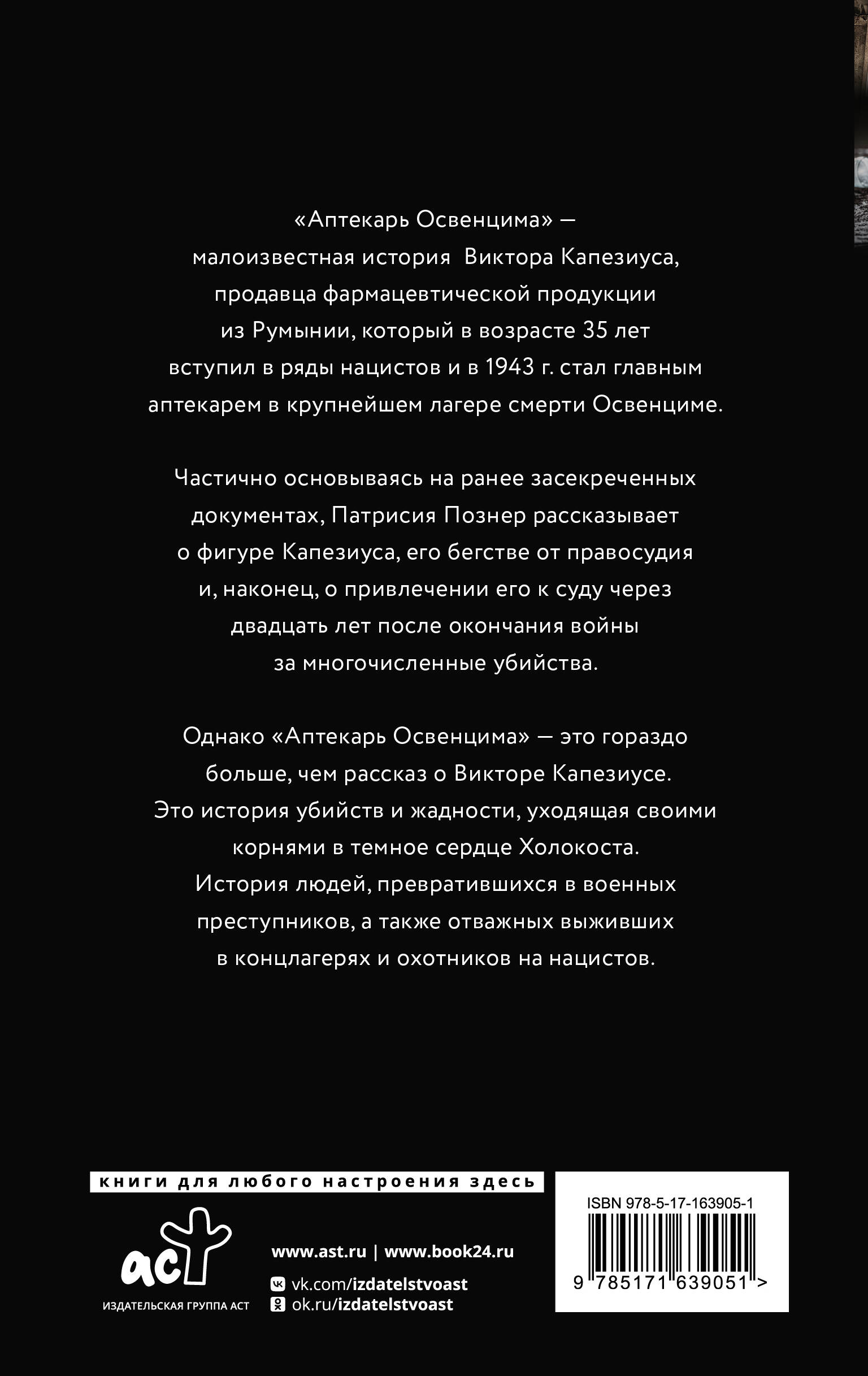 "Аптекарь Освенцима" - малоизвестная история Виктора Капезиуса, продавца фармацевтической продукции из Румынии, который в возрасте 35 лет вступил в ряды нацистов и в 1943 г. стал главным аптекарем в крупнейшем лагере смерти Освенциме. Частично основываясь на ранее засекреченных документах, Патрисия Познер рассказывает о личности Капезиуса, его бегстве от правосудия и, наконец, о привлечении его к суду через двадцать лет после окончания войны за многочисленные убийства. Однако "Аптекарь Освенцима" - это гораздо больше, чем рассказ о Викторе Капезиусе. Это история убийств и жадности, уходящая своими корнями в темное сердце Холокоста. История людей, превратившихся в военных преступников, а также отважных выживших в концлагерях и охотников на нацистов.| Издательство | Издательство "АСТ" |