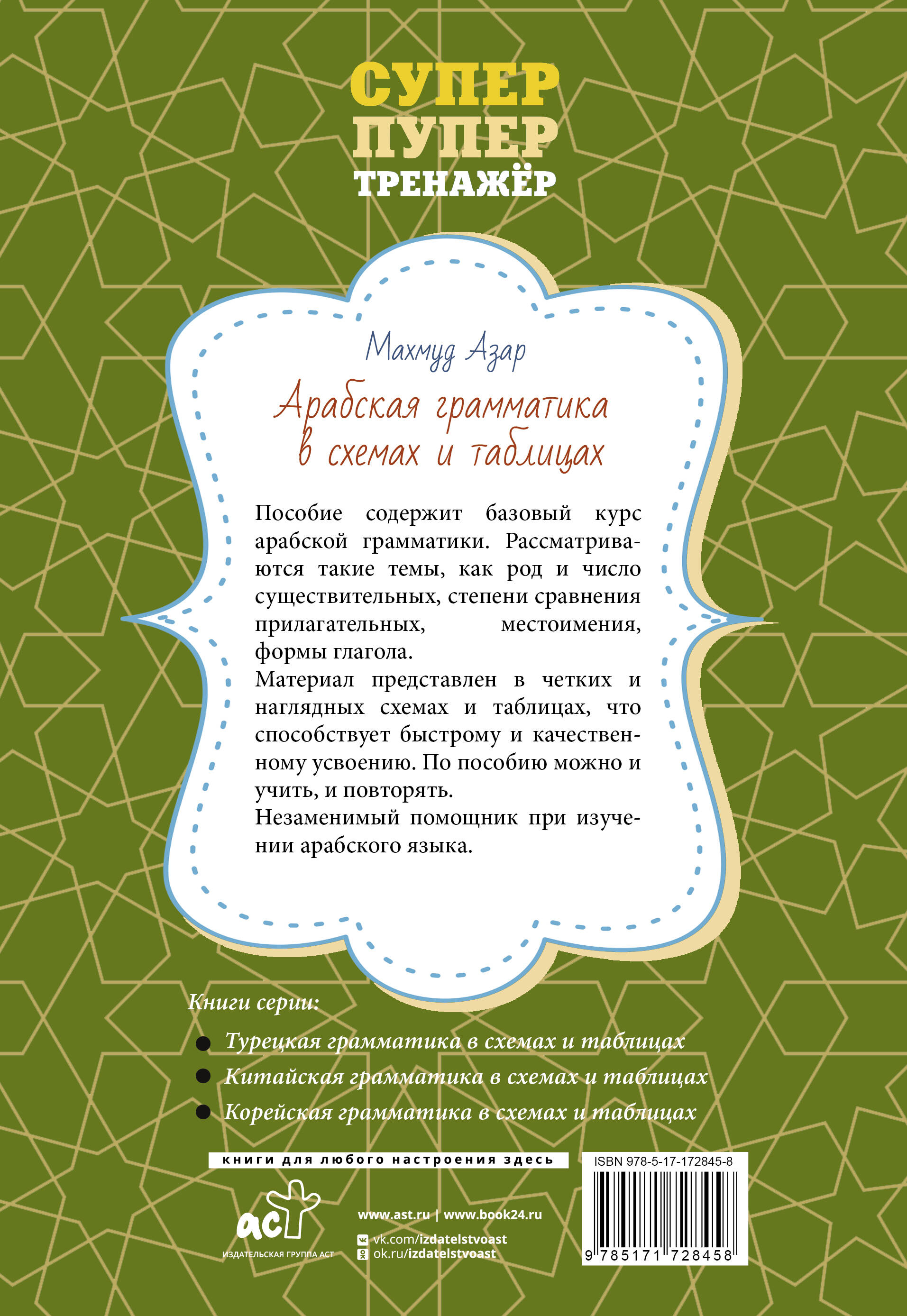 Пособие содержит базовый курс арабской грамматики. Рассматриваются такие темы, как род и число существительных, степени сравнения прилагательных, местоимения, количественные и порядковые числительные, формы глагола. Материал представлен в четких и наглядных схемах и таблицах, что способствует быстрому и качественному усвоению. По пособию можно учить и повторять. Издание предназначено для всех, кто учит арабский язык.| Издательство | Издательство "АСТ" |