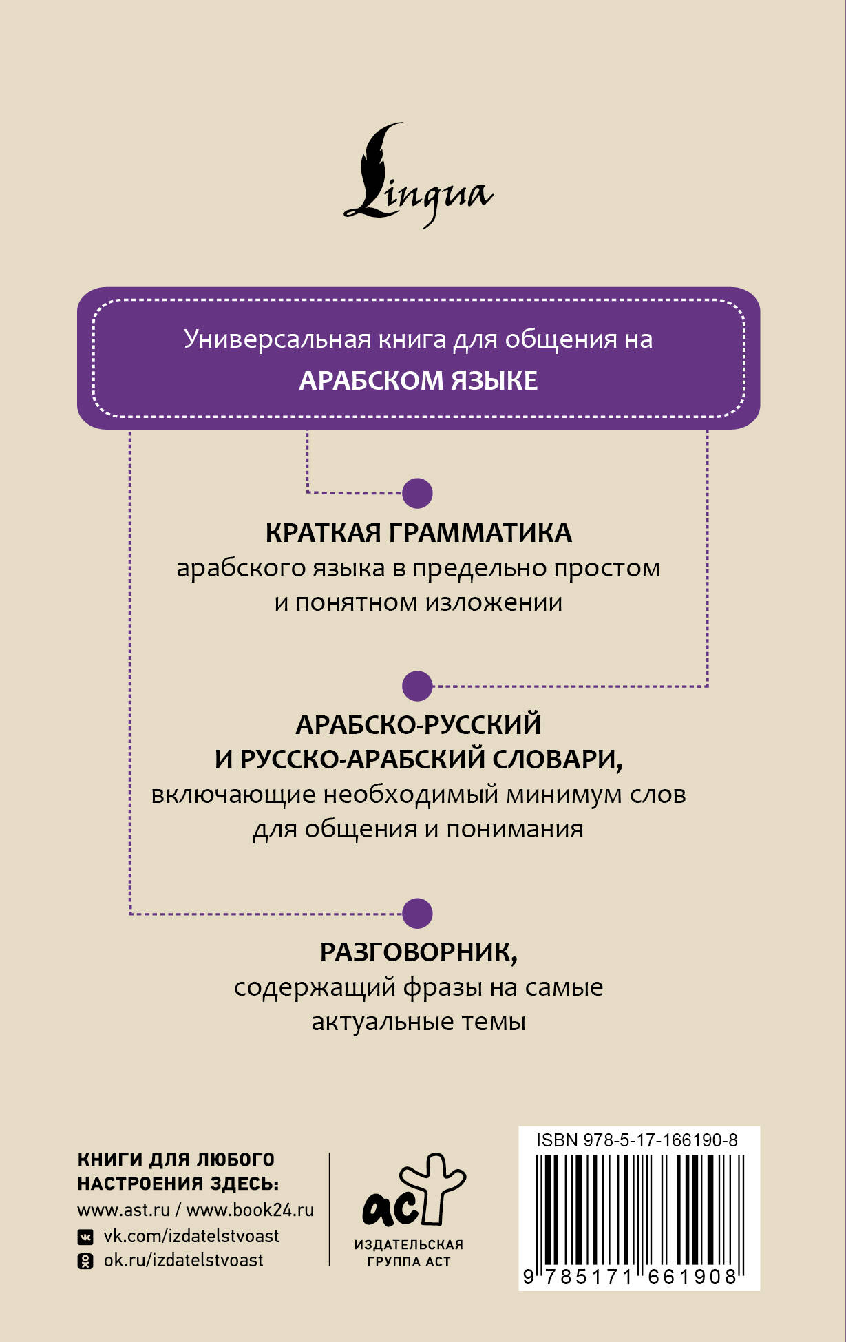 Книга представляет собой современный тип самоучителя и состоит из 4 частей, содержащих самые нужные материалы для обучения иностранному языку: разговорник, арабско-русский и русско-арабский словари, а также раздел со сведениями по грамматике арабского языка в предельно простом и понятном изложении. Самоучитель будет полезен всем, кто интересуется арабским языком или начинает его изучать. С его помощью вы сможете овладеть языком до уровня A2.| Издательство | Издательство "АСТ" |