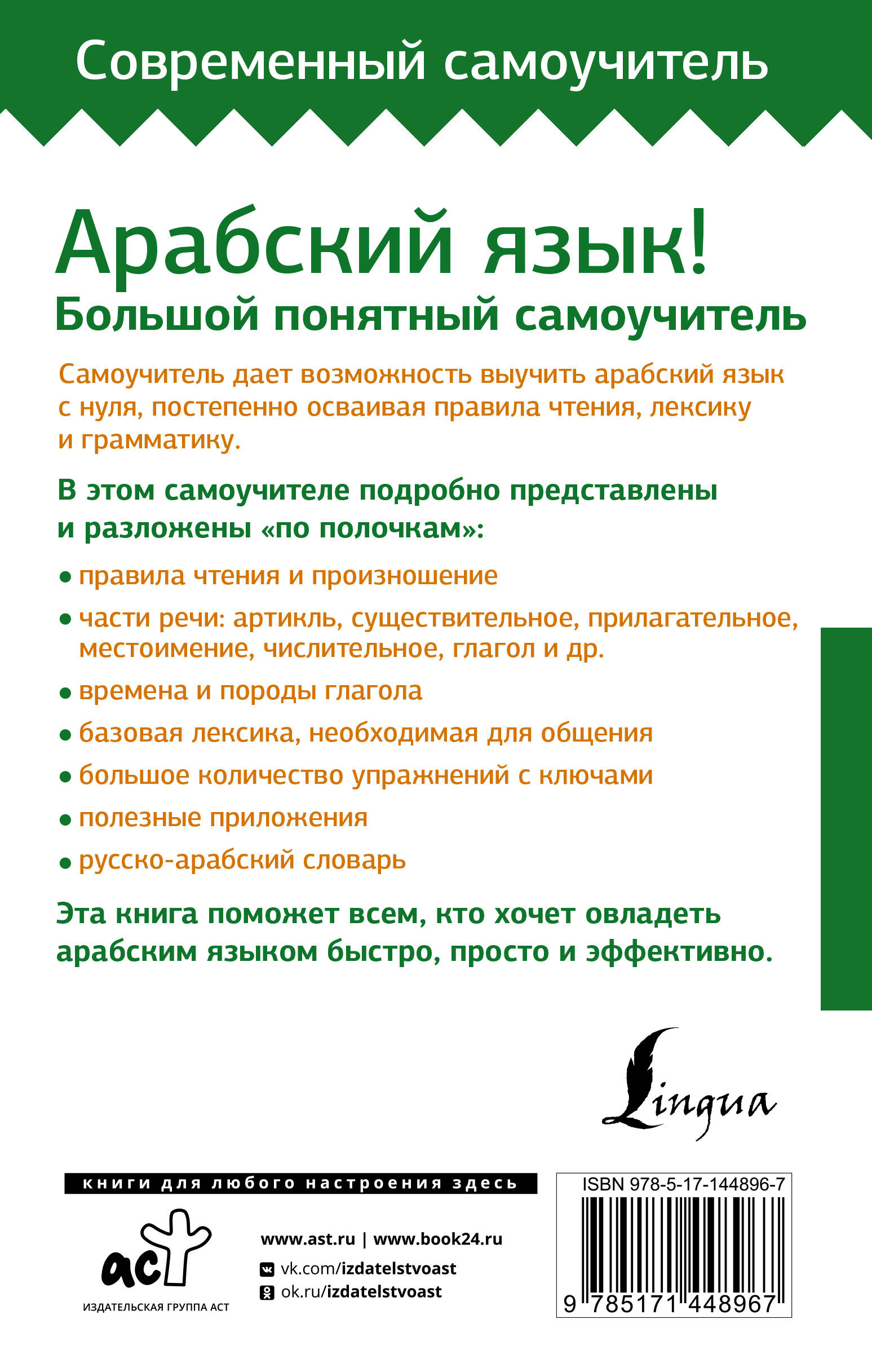 Данный самоучитель поможет читателям выучить арабский язык на начальном уровне, постепенно осваивая самое необходимое. В этой книге вы найдете правила чтения и произношения, подробный разбор частей речи, времена и породы глагола, большое количество примеров с широкоупотребительной лексикой. Материал в пособии изложен максимально понятно и доступно, для успешного закрепления пройденной темы даны упражнения с ключами. Вы также можете воспользоваться полезными приложениями и русско-арабским словарем в конце книги. Эта книга поможет всем, кто хочет овладеть арабским языком быстро, просто и эффективно, а также будет полезна для желающих приступить к чтению Священного Корана в оригинале и выучить основные суры.| Издательство | ИЗДАТЕЛЬСТВО "АСТ" |