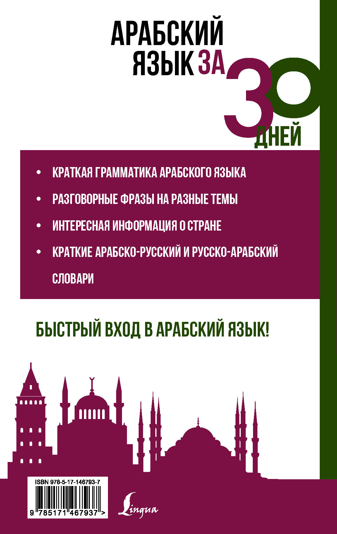 "Арабский язык за 30 дней" - это отличный помощник для тех, кто хочет выучить арабский легко и быстро. Самоучитель состоит из трех частей. Краткая грамматика знакомит с особенностями арабского письма, произношения и частями речи. Разговорник содержит самые необходимые слова и фразы для свободного общения. Арабско-русский и русско-арабский словари помогут расширить словарный запас. Самоучитель будет полезен всем, кто интересуется арабским языком или начинает его изучать.| Издательство | ИЗДАТЕЛЬСТВО "АСТ" |
