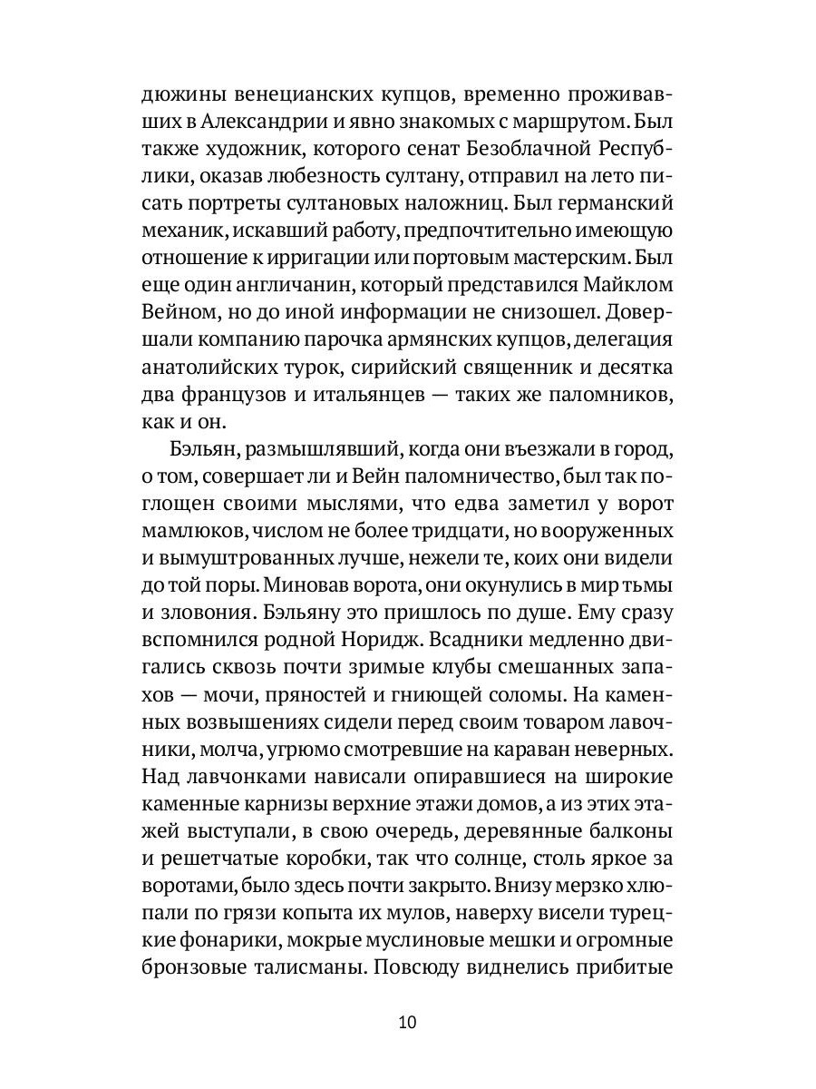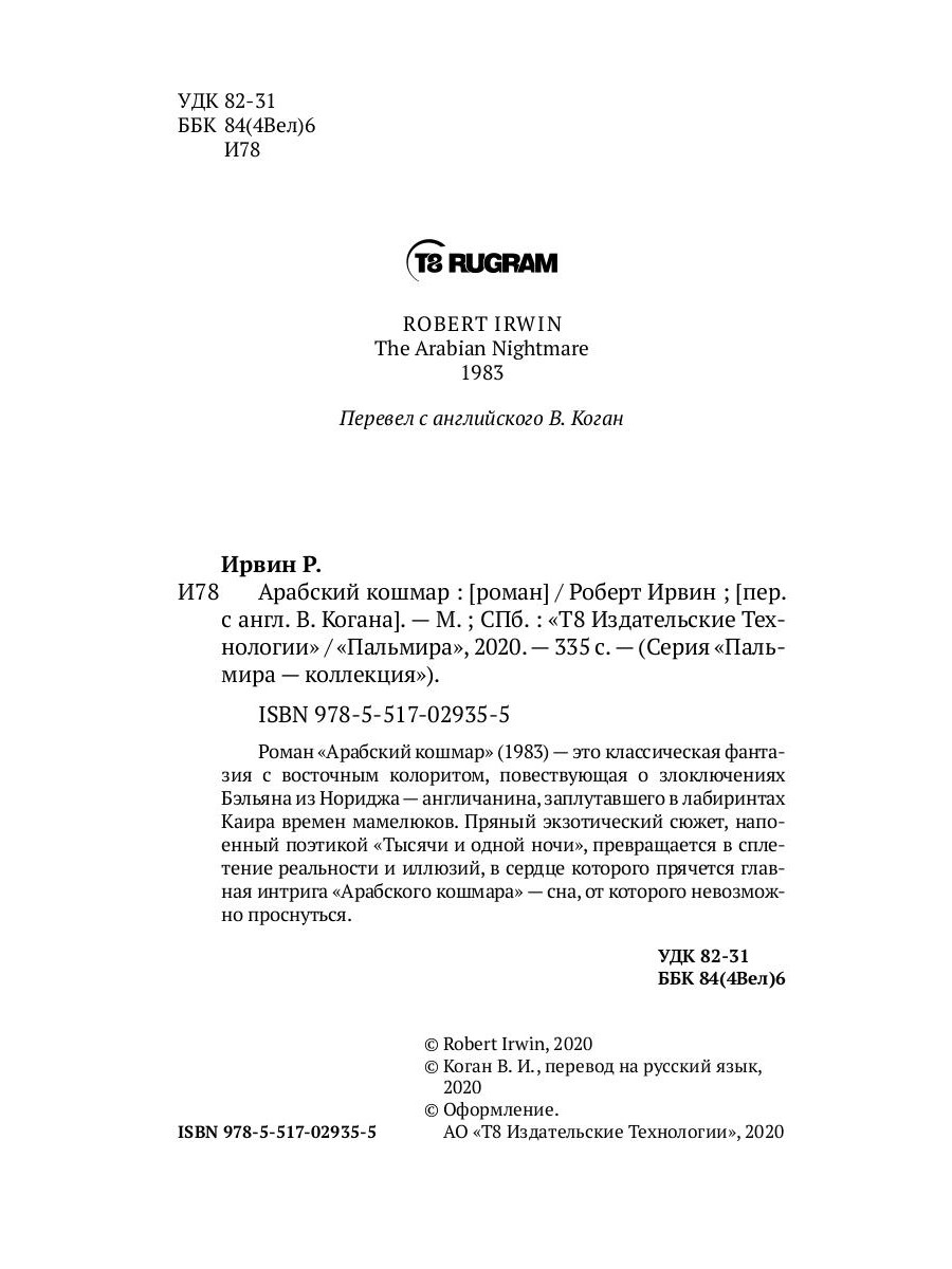 Роман «Арабский кошмар» (1983) - это классическая фантазия с восточным колоритом, повествующая о злоключениях Бэльяна из Нориджа - англичанина, заплутавшего в лабиринтах Каира времен мамелюков. Пряный экзотический сюжет, напоенный поэтикой «Тысячи и одной ночи», превращается в сплетение реальности и иллюзий, в сердце которого прячется главная интрига «Арабского кошмара» - сна, от которого невозможно проснуться.
