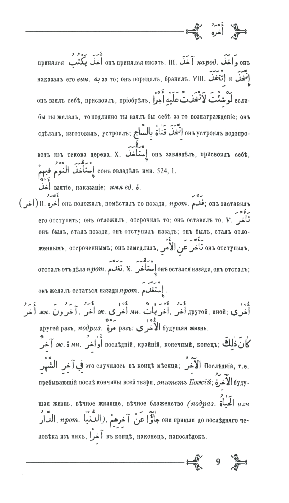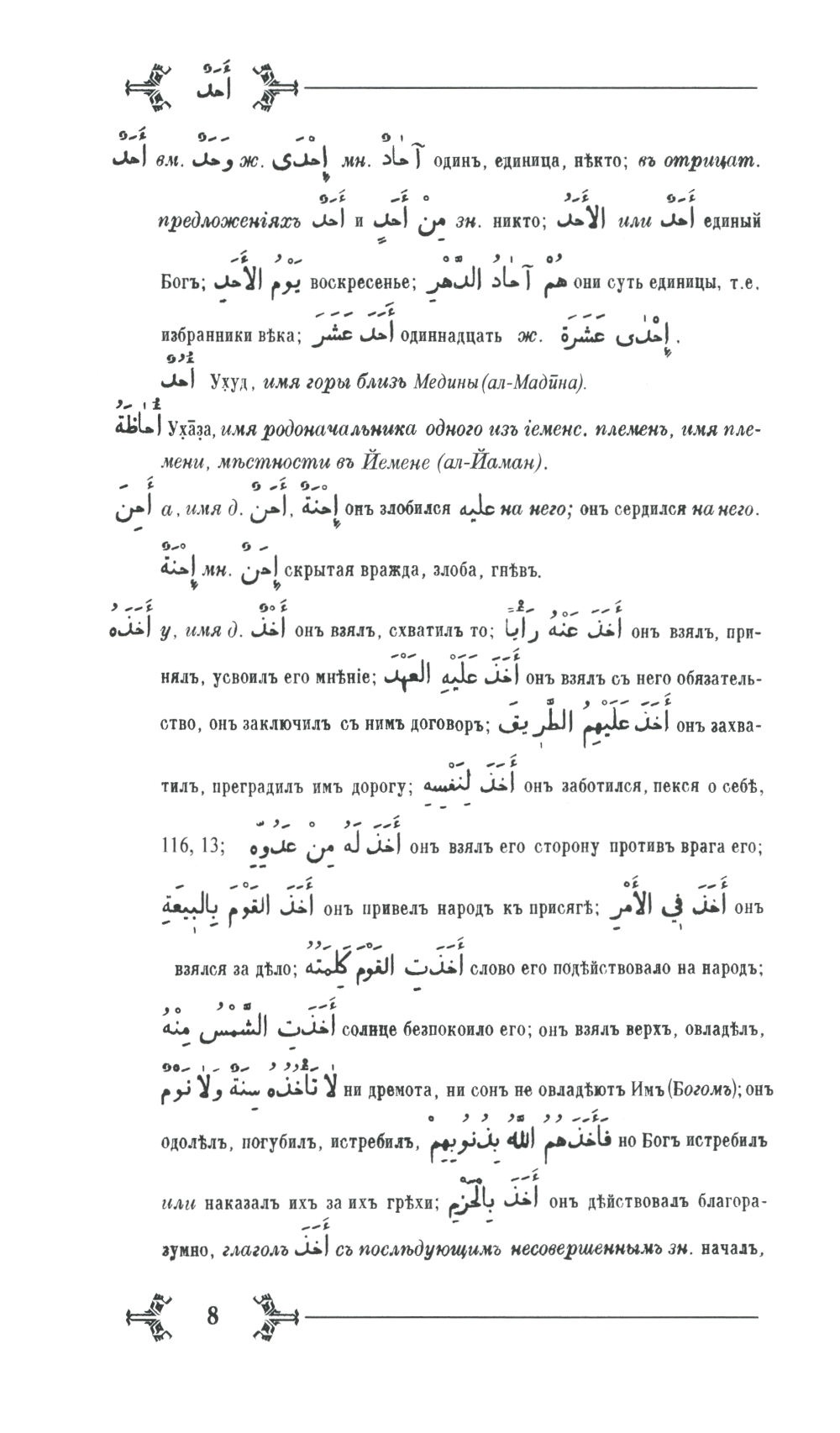 «Словарь к Арабской хрестоматии и Корану» В. Ф. Гиргаса по праву занял особое место в истории отечественной арабистики и исламоведения. Это - первый и до сих пор единственный арабско-русский словарь, составленный на основе классических арабских текстов, прежде всего Корана и мусульманских преданий (хадисов) - двух главных источников исламского вероучения и права. Словарь открыл отечественным арабистам доступ к оригинальным арабским текстам, в которых нашли отражение разные стороны духовной жизни мусульманского общества. Образный русский язык Словаря, его самобытная лексика способствовали более глубокому и конкретному восприятию духовного наследия и культуры в целом арабо-мусульманского мира. К достоинствам Словаря относится также то, что в его статьях нередко приводятся антонимы и синонимы, даются переводы целых фраз и айатов.| Издательство | Диля |