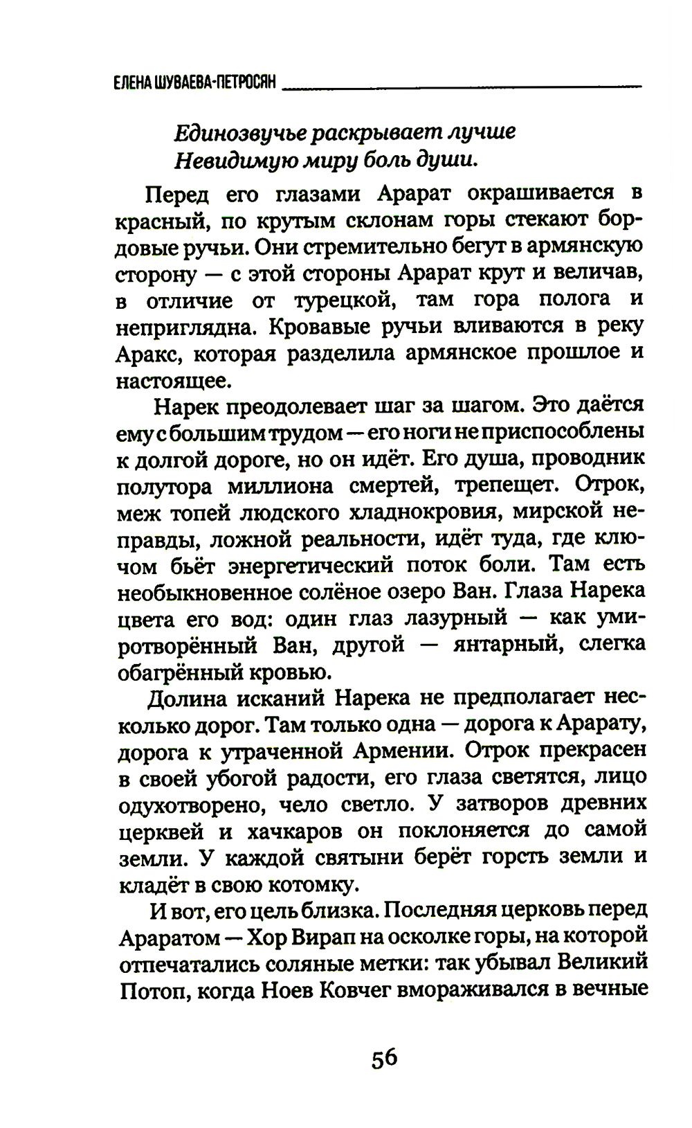 Четвертый выпуск Книжной серии ДИАЛОГ представляет сборник стихов, рассказов и притч Елены Шуваевой-Петросян «Араратское время». В книгу вошли произведения, написанные в разное время и в разных жанрах. Посвящены они Армении, армянскому народу, истории, культуре, традициям. Концепт горы Арарат в армянской культуре занимает значительное место, ассоциируясь с силой, духом, первородством, единением народа и болью. Арарат - это одновременно гордость и тоска по утраченным землям и павшим предкам. В Армении каждое утро начинается со взгляда на эту Гору и каждый день завершается закатными лучами на святых склонах, чем объясняется столь эмоциональное отношение автора к Арарату.| Издательство | Книжный мир |