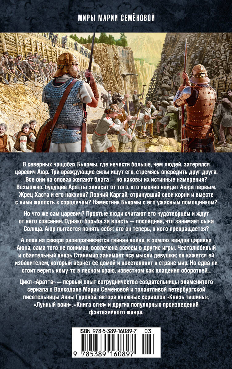 В северных чащобах Бьярмы, где нечисти больше, чем людей, затерялся царевич Аюр. Три враждующие силы ищут его, стремясь опередить друг друга. Все они на словах желают блага - но каковы их истинные намерения? Возможно, будущее Аратты зависит от того, кто именно найдет Аюра первым. Жрец Хаста и его накхини? Ловчий Каргай, отринувший свои корни и вместе с ними жалость к сородичам? Наместник Бьярмы с его ужасным помощником? Но что же сам царевич? Простые люди считают его чудотворцем и ждут от него спасения. Однако борьба за власть - последнее, что занимает сына Солнца. Аюр пытается понять себя: кто он теперь, в кого превращается? А пока на севере разворачивается тайная война, в землях вендов царевна Аюна, сама того не понимая, вовлечена совсем в другие игры. Честолюбивый и обаятельный князь Станимир занимает все мысли девушки; он кажется ей избавителем, который вернет ее домой и восстановит в стране мир. Но едва ли стоит верить кому-то в лесном краю, известном как владения оборотней... Цикл "Аратта" - первый опыт сотрудничества создательницы знаменитого сериала о Волкодаве Марии Семёновой и талантливой петербургской писательницы Анны Гуровой, автора книжных сериалов "Князь тишины", "Лунный воин", "Книга огня" и других популярных произведений фэнтезийного жанра.| Издательство | Азбука-Аттикус Издат.группа ООО |