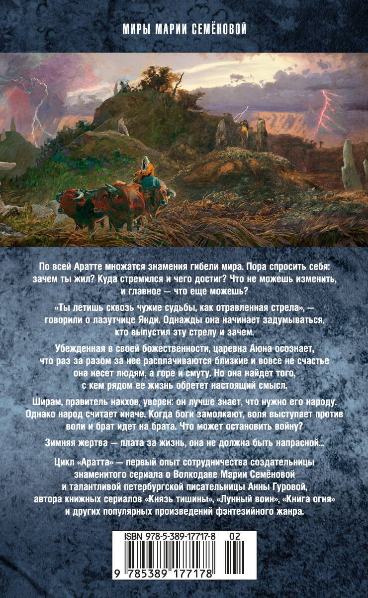 По всей Аратте множатся знамения гибели мира. Пора спросить себя: зачем ты жил? Куда стремился и чего достиг? Что не можешь изменить - и главное, что еще можешь? "Ты летишь сквозь чужие судьбы, как отравленная стрела", - говорили о лазутчице Янди. Однажды она начинает задумываться, кто выпустил эту стрелу и зачем. Убежденная в своей божественности царевна Аюна осознает, что раз за разом за нее расплачиваются близкие и вовсе не счастье она несет людям, а горе и смуту. Но она найдет того, с кем рядом ее жизнь обретет настоящий смысл. Ширам, правитель накхов, уверен: он лучше знает, что нужно его народу. Однако народ считает иначе. Когда боги замолкают, воля выступает против воли и брат идет на брата. Что может остановить войну? Зимняя жертва - плата за жизнь, она не должна быть напрасной... Цикл "Аратта" - первый опыт сотрудничества создательницы знаменитого сериала о Волкодаве Марии Семёновой и талантливой петербургской писательницы Анны Гуровой, автора книжных сериалов "Князь тишины", "Лунный воин", "Книга огня" и других популярных произведений фэнтезийного жанра.