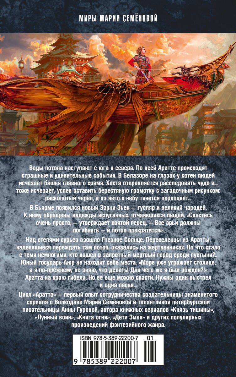Воды потопа наступают с юга и севера. По всей Аратте происходят страшные и удивительные события. В Белазоре на глазах у сотен людей исчезает башня главного храма. Хаста отправляется расследовать чудо и... тоже исчезает, успев оставить берестяную грамотку с загадочным рисунком: расколотый череп, а из него к небу тянется первоцвет... В Бьярме появился новый Зарни Зьен - гусляр и великий чародей. К нему обращены надежды испуганных, отчаявшихся людей. "Спастись очень просто, - утверждает святой певец. - Все арьи должны погибнуть - и потоп прекратится". Над степями сурьев взошло Гневное Солнце. Переселенцы из Аратты, надеявшиеся переждать там потоп, оказались на жертвенниках. Но что стало с теми немногими, кто вошел в запретный мертвый город среди пустыни?.. Юный государь Аюр не находит себе места. "Море уже угрожает столице, а я по-прежнему не знаю, что делать! Для чего же я был рожден?!" Аратта на краю гибели. Но ее еще можно спасти. Нужны один выстрел и одна песня... Цикл "Аратта" - первый опыт сотрудничества создательницы знаменитого сериала о Волкодаве Марии Семёновой и талантливой петербургской писательницы Анны Гуровой, автора книжных сериалов "Князь тишины", "Лунный воин", "Книга огня", "Дети Змея" и других популярных произведений фэнтезийного жанра.| Издательство | Издательство АЗБУКА ООО |