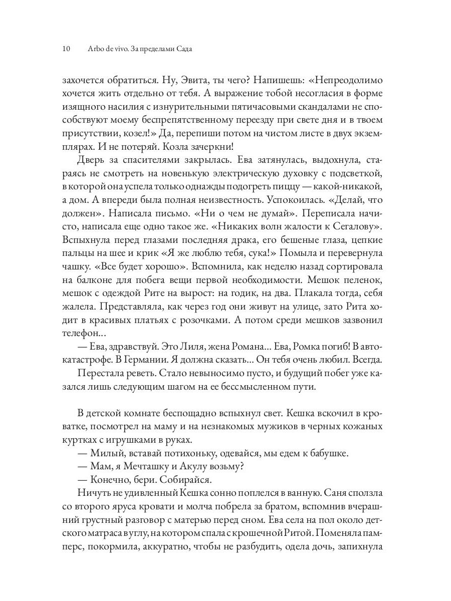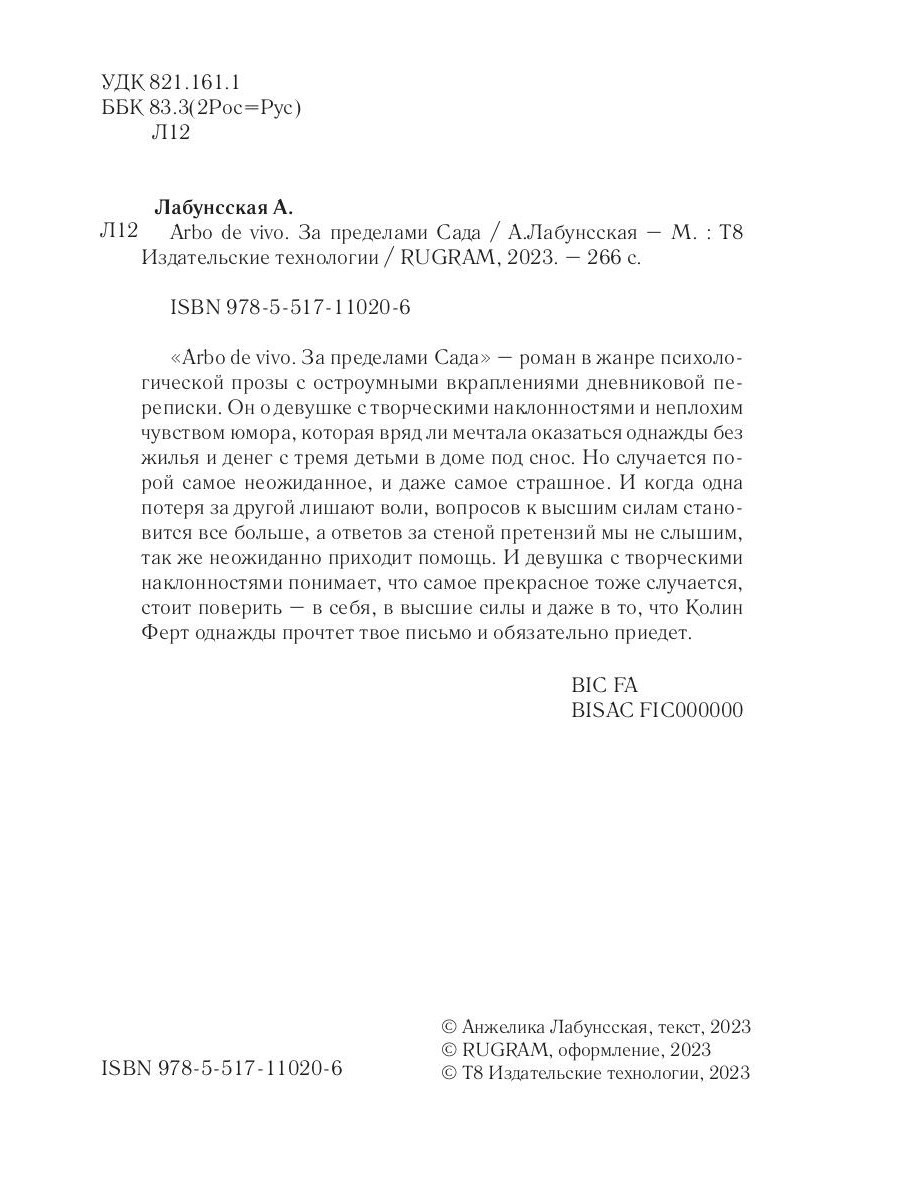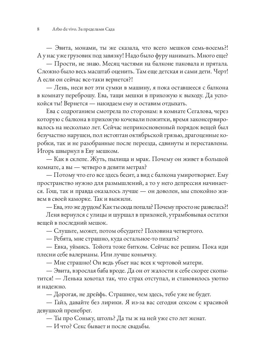 «Arbo de vivo. За пределами Сада» - роман в жанре психологической прозы с остроумными вкраплениями дневниковой переписки. Он о девушке с творческими наклонностями и неплохим чувством юмора, которая вряд ли мечтала оказаться однажды без жилья и денег с тремя детьми в доме под снос. Но случается порой самое неожиданное, и даже самое страшное. И когда одна потеря за другой лишают воли, вопросов к высшим силам становится все больше, а ответов за стеной претензий мы не слышим, так же неожиданно приходит помощь. И девушка с творческими наклонностями понимает, что самое прекрасное тоже случается, стоит поверить - в себя, в высшие силы и даже в то, что Колин Ферт однажды прочтет твое письмо и обязательно приедет.| Издательство | Т8 RUGRAM |