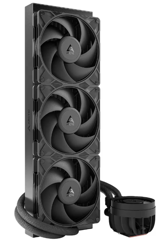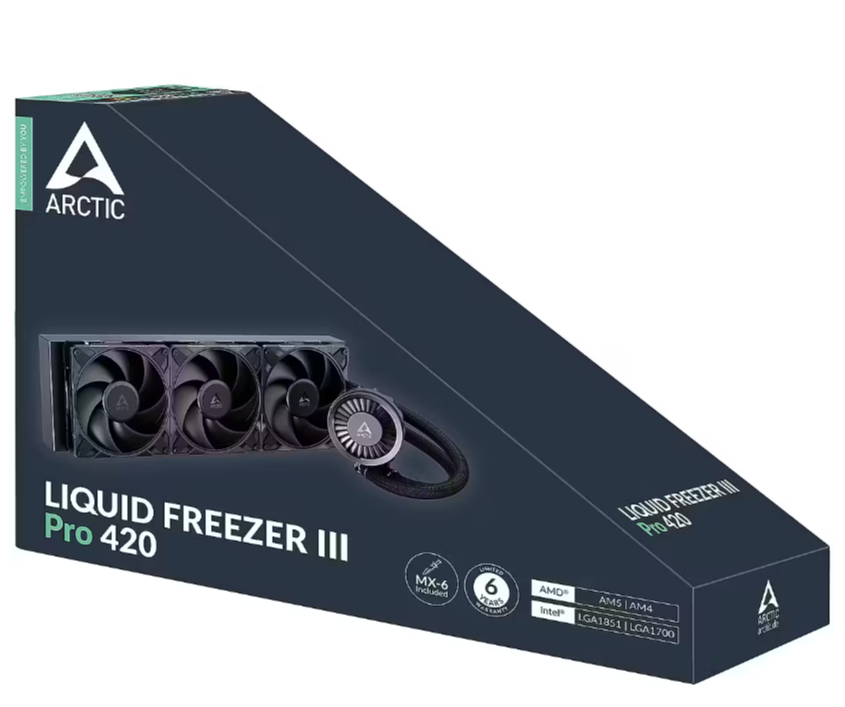 Arctic Liquid Freezer III Pro 420 высокоэффективная жидкостная система охлаждения для процессоров с радиатором 420 мм. Оснащена тремя 140-мм вентиляторами и дополнительным 60-мм вентилятором для охлаждения VRM. Радиатор толщиной 38 мм обеспечивает отличную теплоотдачу, а система проста в установке.