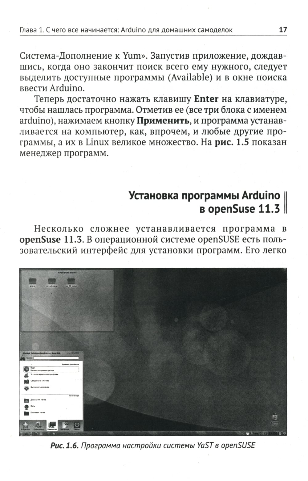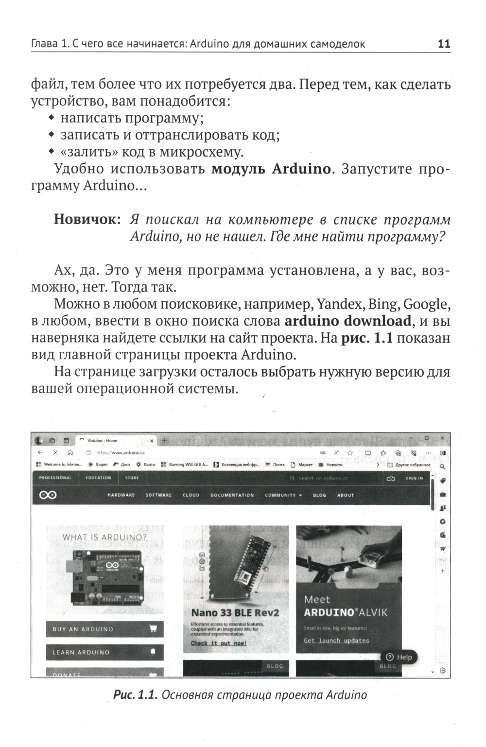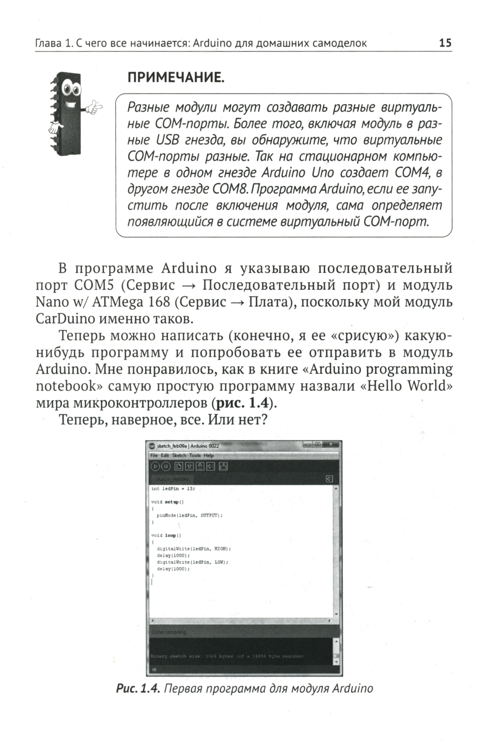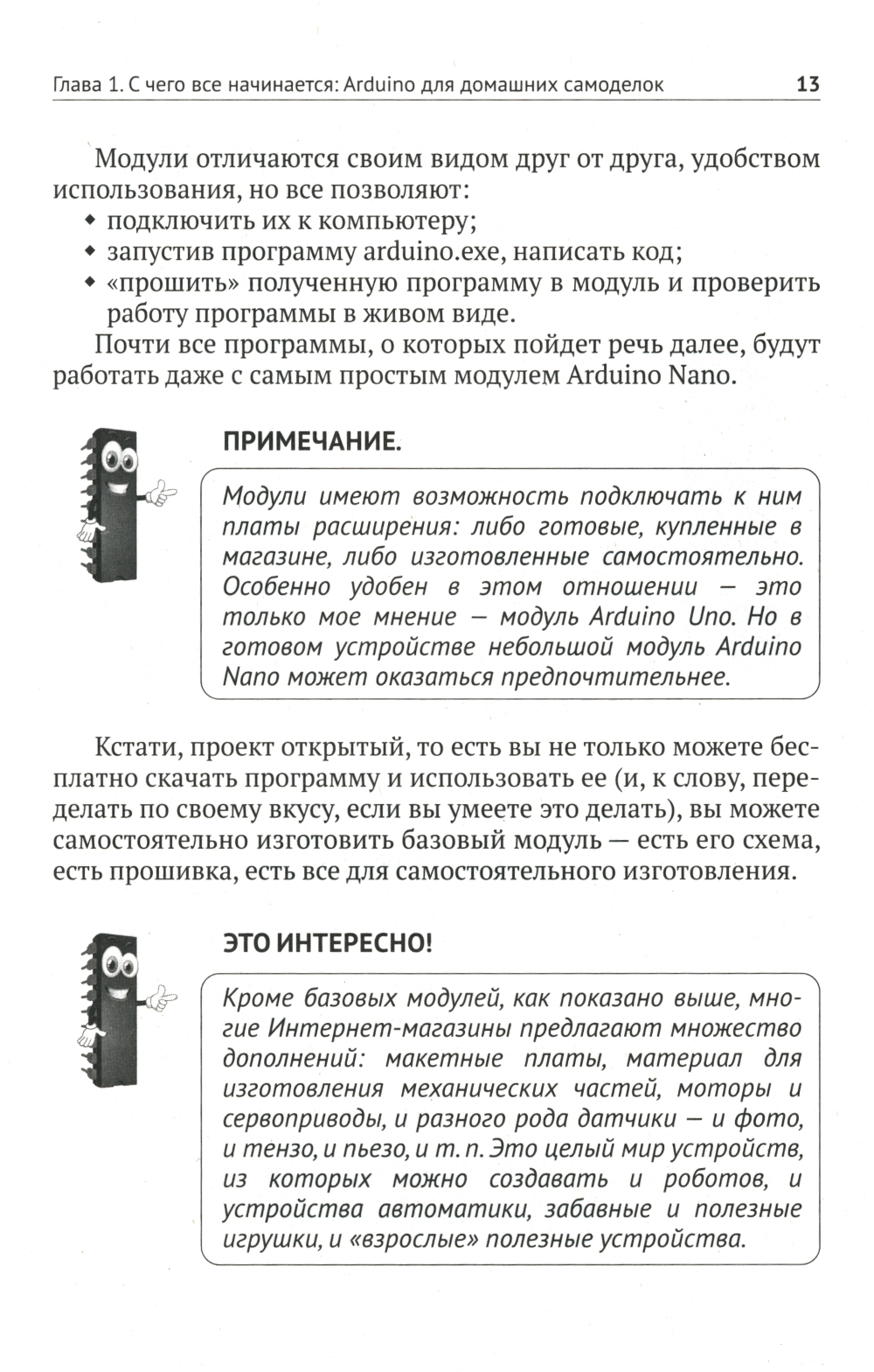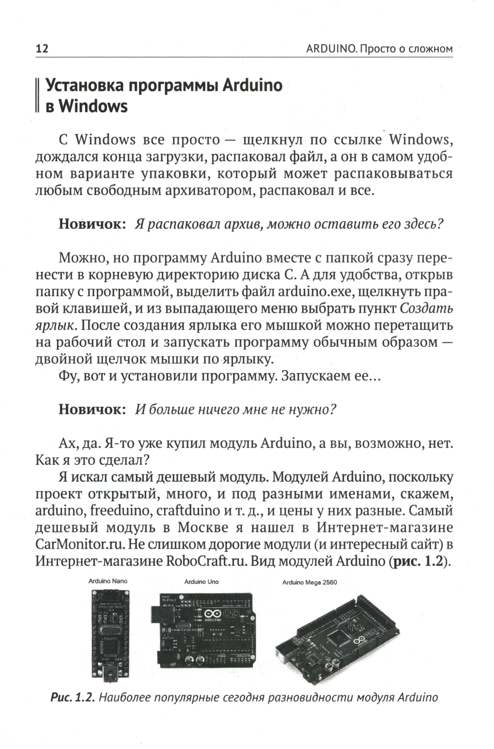 Эта книга написана для тех, кто хотел бы начать работать с микроконтроллерами. Оптимальным для этого оказывается модуль Arduino. Он не требует программатора, и проект Arduino предлагает удобную среду разработки программ для модуля Arduino. Появление проекта Arduino привлекло к нему столь пристальное внимание, что было создано много разновидностей модуля, различающихся и ценой, и возможностями. Разработано много дополнительных модулей (шилдов), позволяющих превратить, например, модуль Arduino Uno в web-сервер. Написан ряд полезных программ для модуля Arduino. С модулем Arduino можно успешно работать и в Windows, и в Linux, чему производители сегодня уделяют большое внимание. Но успех приходит только с опытом. А опыт начинается с первого шага, который вам предлагается сделать. В ходе беседы автора книги и любознательного Новичка все сложности изучения микроконтроллеров вообще и проекта Arduino, в частности, остаются позади. Книга сопровождается ВИРТУАЛЬНЫМ ДИСКОМ, который содержит проекты, о которых рассказывается в книге, сведения о среде разработки, программы для модуля Arduino, datasheets к микроконтроллерам Arduino Nano, Arduino Uno и многое другое. Обновляемый виртуальный диск размещен на сайте Издательства www.nit.com.ru. в разделе «Материалы к книгам». Книга предназначена для широкого круга любознательных читателей, увлеченных микроконтроллерами, техническим творчеством, электронными самоделками.| Издательство | Наука и техника |