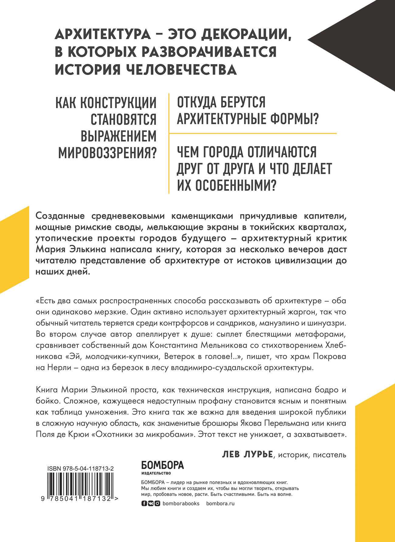 Римское градостроительство отличалось монументальностью и подарило миру всевозможные урбанистические блага, средневековые города складывались вокруг рынков, а открытие линейной перспективы в XVII и развитие транспорта в XIX столетиях полностью изменило облик городов. • Что мы понимаем под архитектурой, и насколько тесно она связана с цивилизацией? • Понимаем ли мы ее противоречивость, значение и устремления? • Чтобы испытать восторг при виде Руанского собора или колоннадой Бернини в Риме, не нужно быть профессиональным архитектором или искусствоведом. Однако архитектуре, которая формирует наше окружение, до сих пор уделяется мало внимания. В своей книге архитектурный критик Марии Элькина рассматривает эту область человеческой деятельности во всем ее великолепии и многоликости. Вы узнаете, как появлялись архитектурные формы и почему они приобретали тот или иной вид: будь то пышные входы в готические соборы, вечные колонны или необычная геометрия модернизма. Увидите, как мировоззрение отражается в архитектурных конструкциях, и попробуете разобраться в том, что делает здание произведением искусства. Новое издание выходит с обновленными автором текстами, а все примеры также проиллюстрированы графикой архитектора Сергея Чобана. Мария Элькина - архитектурный критик, лауреат премии среди самых известных людей Петербурга «ТОП-50». Окончила факультет теории и истории искусств Академии художеств в Санкт-Петербурге. Курирует выставки и пишет статьи об архитектуре и урбанизме в таких изданиях, как Republic, «Деловой Петербург», arch:speech, Strelka Magazine, Собака.ру. Сергей Чобан - архитектор, член Союза немецких архитекторов, Союза архитекторов России и Союза художников России, академик Московского отделения Международной академии архитектуры и почетный академик Российской академии художеств, обладатель архитектурных премий и участник различных архитектурных выставок.| Издательство | ООО "Издательство "Эксмо" |