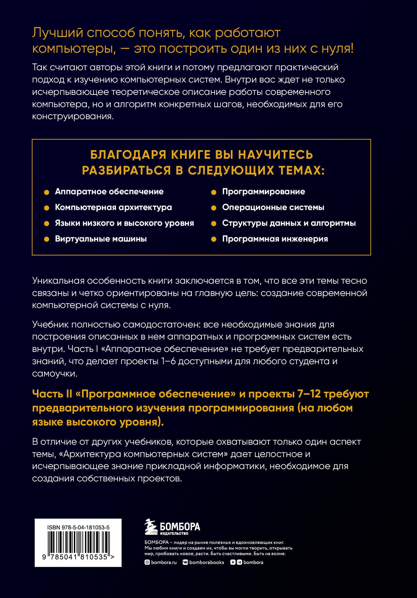 Лучший способ понять, как работают компьютеры - это построить один из них с нуля! Так считают авторы этой книги и потому предлагают практический подход к изучению компьютерных систем. Внутри вас ждет не только исчерпывающее теоретическое описание работы современного компьютера, но и алгоритм конкретных шагов, необходимых для его конструирования. Благодаря книге вы научитесь разбираться в следующих темах: • Аппаратное обеспечение • Компьютерная архитектура • Языки низкого и высокого уровня • Виртуальные машины • Компиляторы • Программирование • Операционные системы • Структуры данных и алгоритмы • Программная инженерия Уникальная особенность книги заключается в том, что все эти темы тесно связаны и четко ориентированы на главную цель: создание современной компьютерной системы с нуля. Учебник полностью самодостаточен: все необходимые знания для построения описанных в ней аппаратных и программных систем есть внутри. Часть I «Аппаратное обеспечение» не требует предварительных знаний, что делает проекты 1-6 доступными для любого студента и самоучки. Часть II «Программное обеспечение» и проекты 7-12 требуют предварительного изучения программирования (на любом языке высокого уровня). В отличие от других учебников, которые охватывают только один аспект темы, «Архитектура компьютерных систем» дает целостное и исчерпывающее знание прикладной информатики, необходимое для создания собственных проектов. «Мы написали эту книгу, поскольку у нас сложилось впечатление, что многие из тех, кто изучает информатику, не видят леса за деревьями. Типичный студент пробегает через серию курсов по программированию, теории и инженерии, не останавливаясь, чтобы оценить красоту общей картины. А картина в целом такова, что аппаратные, программные и прикладные системы тесно связаны между собой, что не очевидно, через скрытую паутину абстракций, интерфейсов и контрактных реализаций». - Ноам Нисан, Шимон Шокен