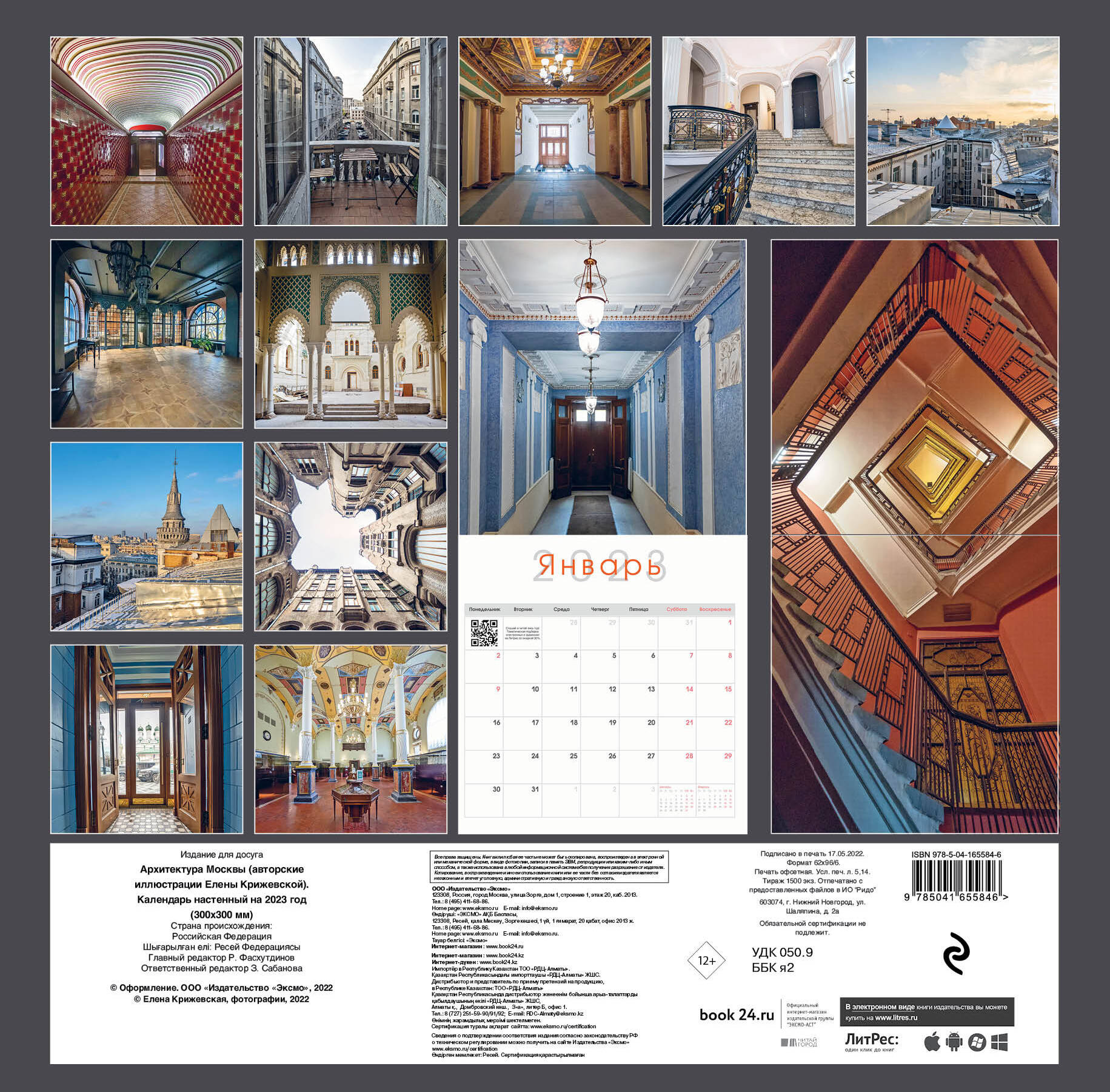 О серии: Наши настенные календари отличаются высоким качеством исполнения! Тщательно подобранные иллюстрации, напечатанные на глянцевой бумаге высочайшего качества, станут настоящим украшением дома, а в календарной сетке найдется место для ваших планов: большие клетки позволят делать записи и организовать свой год! В календаре также отмечены все государственные праздники. В серии настенных календарей издательства «ЭКСМО» каждый найдет тему по вкусу: великие художники, великолепные подборки с самыми знаменитыми произведениями искусства, легендарные кинематографические саги и игры, главные книжные авторы и бестселлеры, фотографии и иллюстрации любимых животных и многое-многое другое! О календаре: Уникальный настенный календарь с фотографиями Елены Крижевской - победителя фотовыставки «Best of Russia-2016». На ее страницу @elena.krizhevskaya, посвященную самым красивым домам столицы, подписано более 180 000 человек. Ее книги «Архитектурная Москва. Путеводитель по зданиям и стилям», «Москва изнутри. Роскошные интерьеры и архитектурные истории» и «Непарадная Москва: доходные дома в историях и фотографиях» любимы тысячами читателей и регулярно попадают в списки бестселлеров. Технические параметры: Тип календаря - настенный перекидной Год - 2023 Календарная сетка - с разбивкой по месяцам Вид скрепления - скрепка Ширина - 30 см Высота - 30 см Внутренний блок - мелованная бумага 150 г/м2 Подложка - плотный гофрокартон для поддержания формы Индивидуальная упаковка в плотный целлофановый пакет| Издательство | ООО "Издательство "Эксмо" |