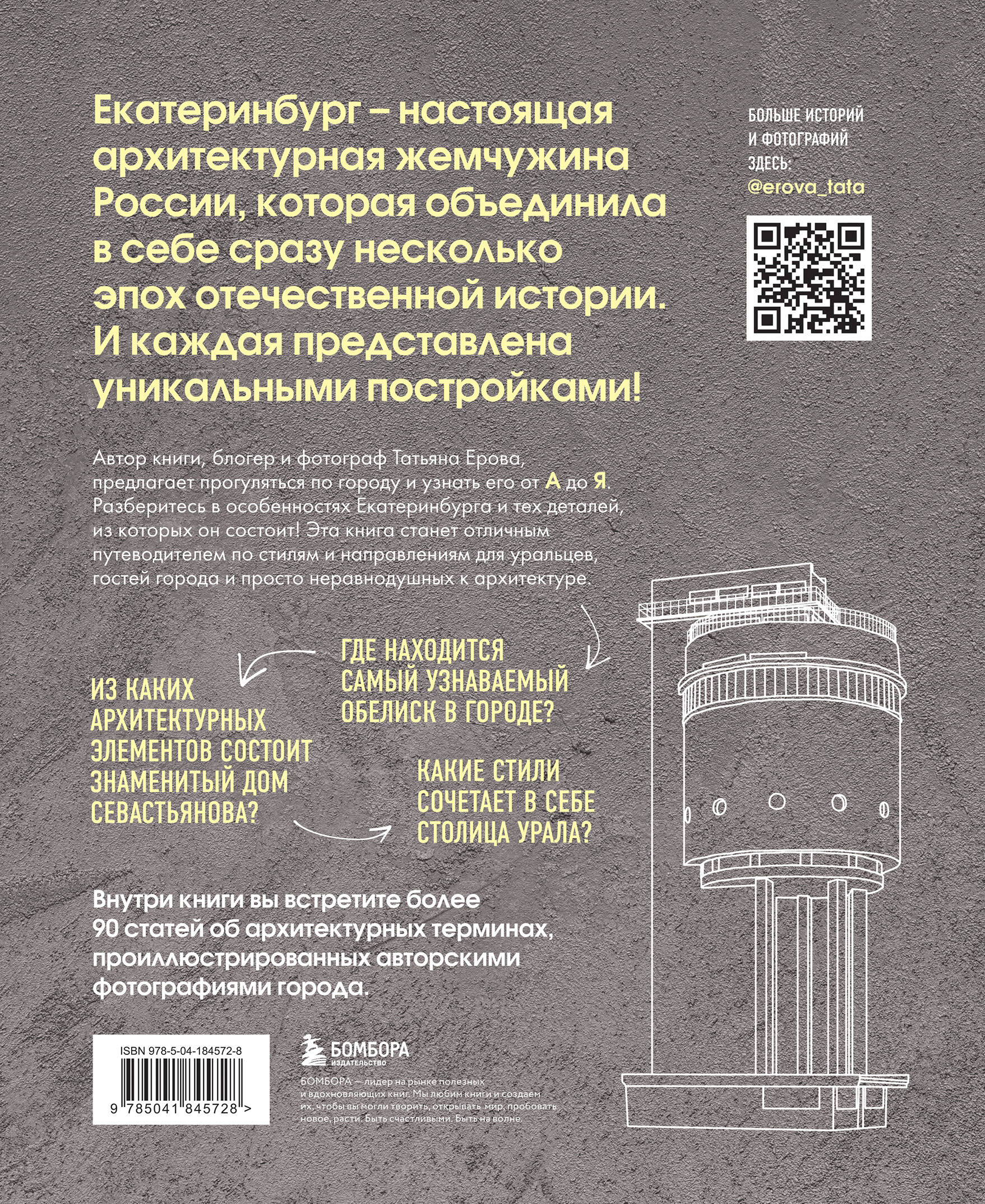 Екатеринбург - один из крупнейших городов России с неповторимой архитектурой, вобравшей в себя образцовый советский конструктивизм и русский классицизм. Город, который стоит посетить хотя бы ради того, чтобы насладиться всем разнообразием эпох и отражающих их стилей. Екатеринбург любят советовать всем, кто ценит вдумчивые прогулки с вниманием к деталям, ведь их в этом городе несчетное количество. - На какие доминанты стоит обратить внимание гостям Урала? - Где в Екатеринбурге найти жиковины (и что это такое)? - Кто изображен на самом известном обелиске города, и где он расположен? Разобраться в этих деталях, а также во всем многообразии стилей столицы Урала вам поможет новая книга фотографа и блогера Татьяны Еровой, автора «Архитектурной азбуки Санкт-Петербурга» и «Города с сотней лиц». Татьяна посвятит вас в подробности того, как устроен Екатеринбург и из каких мелочей состоят его улицы и проспекты, а также научит лучше понимать архитектуру города. Каждая мини-статья объяснит вам значение термина и раскроет признаки архитектурных стилей, продемонстрировав их на примере знаменитых особняков, музеев, храмов и других точек притяжения местных жителей и туристов. Кроме того, книга станет отличным подарком для всех влюбленных в Екатеринбург и благодаря красочным иллюстрациям даст возможность пережить впечатления от города даже вдалеке от него. Прогуляйтесь с этой книгой по столице конструктивизма и откройте для себя столицу Урала по-новому!| Издательство | ООО "Издательство "Эксмо" |