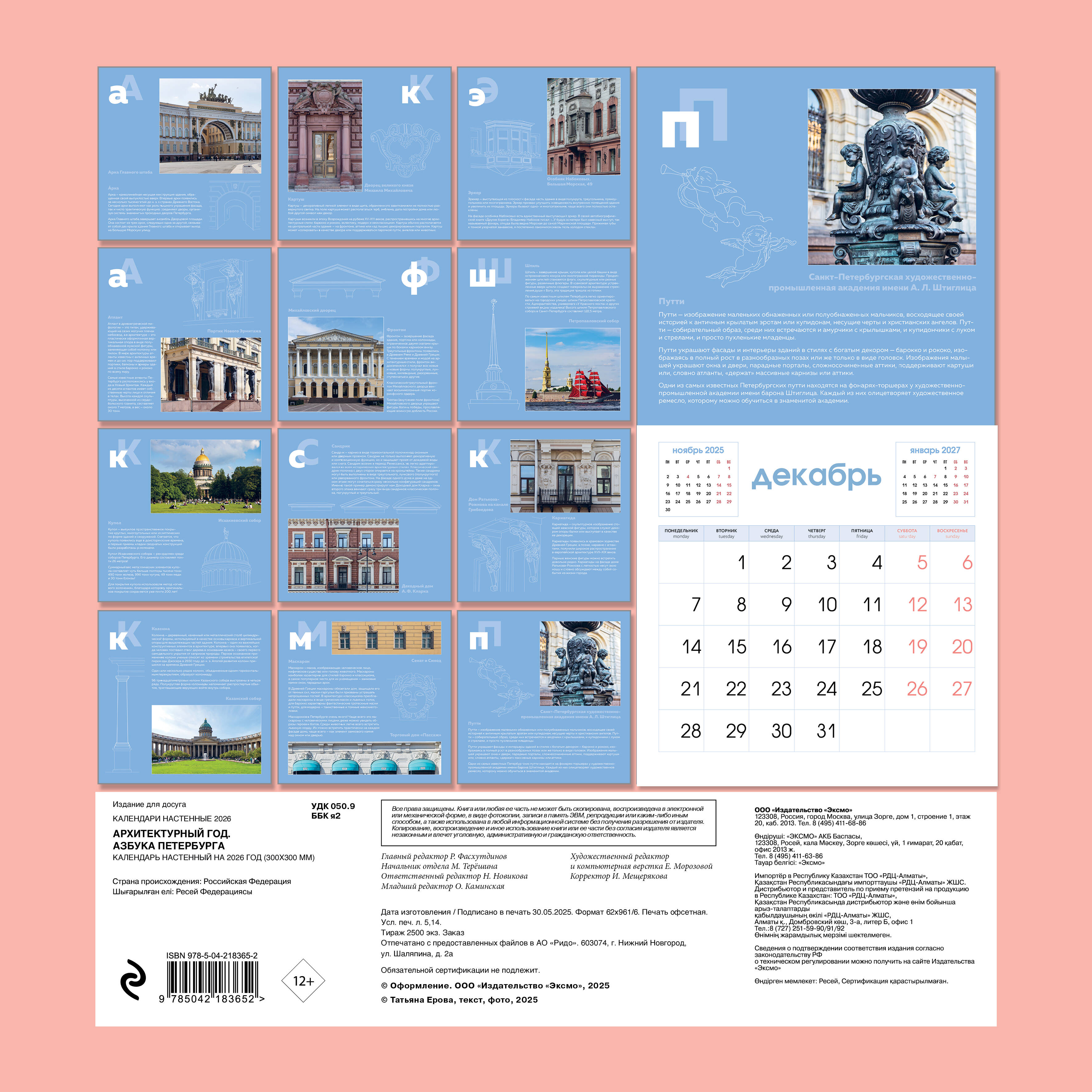 О серии: Наши настенные календари отличаются высоким качеством исполнения! Тщательно подобранные иллюстрации, напечатанные на глянцевой бумаге высочайшего качества, станут настоящим украшением дома, а в календарной сетке найдется место для ваших планов: большие клетки позволят делать записи и организовать свой год! В календаре также отмечены все государственные праздники. В серии настенных календарей издательства «ЭКСМО» каждый найдет тему по вкусу: великие художники, великолепные подборки с самыми знаменитыми произведениями искусства, легендарные кинематографические саги и игры, главные книжные авторы и бестселлеры, фотографии и иллюстрации любимых животных и многое-многое другое! О календаре: Настенный календарь «Архитектурный год» каждый месяц раскрывает значение одного архитектурного элемента, характерного для облика Петербурга: эркеры, атланты, арки, Путти и колонны . Фотографии, описания и схемы элементов сделаны автором Татьяной Еровой. Книга «Архитектурная азбука Петербурга» с такой же идеей стала бестселлером, ее тираж составляет уже 22 000 экземпляров, включая подарочную версию и карманный путеводитель. Сама же идея дала свет подобным азбукам по Москве и Екатеринбургу. Тем не менее именно архитектурный разбор Петербурга остается самым любимым у читателей. А необычный игровой формат позволяет не только любоваться видами города, но и узнавать новые термины и историю. Календарь рассчитан на 12 месяцев, в нем отмечены государственные праздники и выходные, а также есть календарная сетка на 2027 год, что позволит вам строить планы на будущий год заранее. Благодаря удобному формату вы сможете повесить календарь в любом месте, он прекрасно впишется в интерьер. Технические параметры: - Тип календаря - настенный перекидной. - Год - 2026. - Календарная сетка - с разбивкой по месяцам. - Вид скрепления - скрепка. - Ширина - 30 см. - Высота - 30 см. - Внутренний блок - мелованная бумага 115 г/м2. - Подложка - плотный гофрокартон для поддержания формы. - Индивидуальная упаковка в плотный целлофановый пакет.| Издательство | ООО "Издательство "Эксмо" |