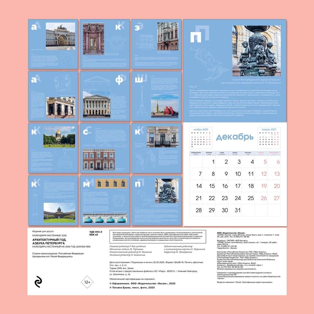 Настенный календарь «Архитектурный год» каждый месяц раскрывает значение одного архитектурного элемента, характерного для облика Петербурга: эркеры, атланты, арки, путти и колонны. Фотографии, описания и схемы элементов сделаны автором Татьяной Еровой. Книга «Архитектурная азбука Петербурга» с такой же идеей стала бестселлером, ее тираж составляет уже 22 000 экземпляров, включая подарочную версию и карманный путеводитель. Сама же идея дала свет подобным азбукам по Москве и Екатеринбургу. Тем не менее именно архитектурный разбор Петербурга остается самым любимым у читателей. А необычный игровой формат позволяют не только любоваться видами города, но и узнавать новые термины и историю. Календарь рассчитан на 12 месяцев, в нем отмечены государственные праздники и выходные, а также есть календарная сетка на 2027 год, что позволит вам строить планы на будущий год заранее. Благодаря удобному формату вы сможете повесить календарь в любом месте, он прекрасно впишется в интерьер.| Издательство | Эксмо |