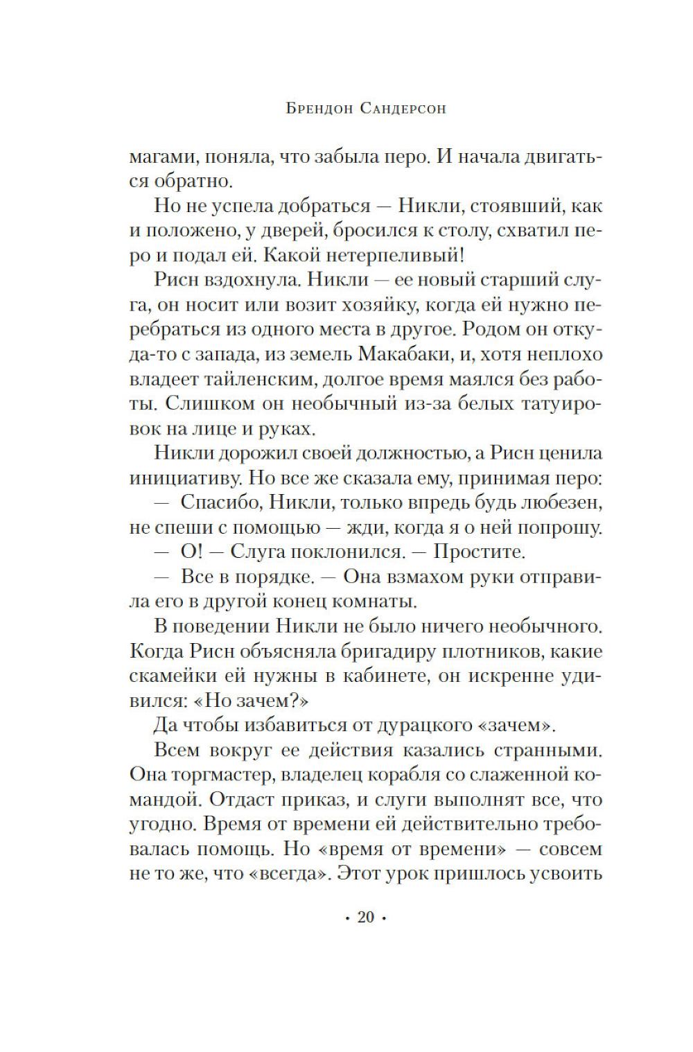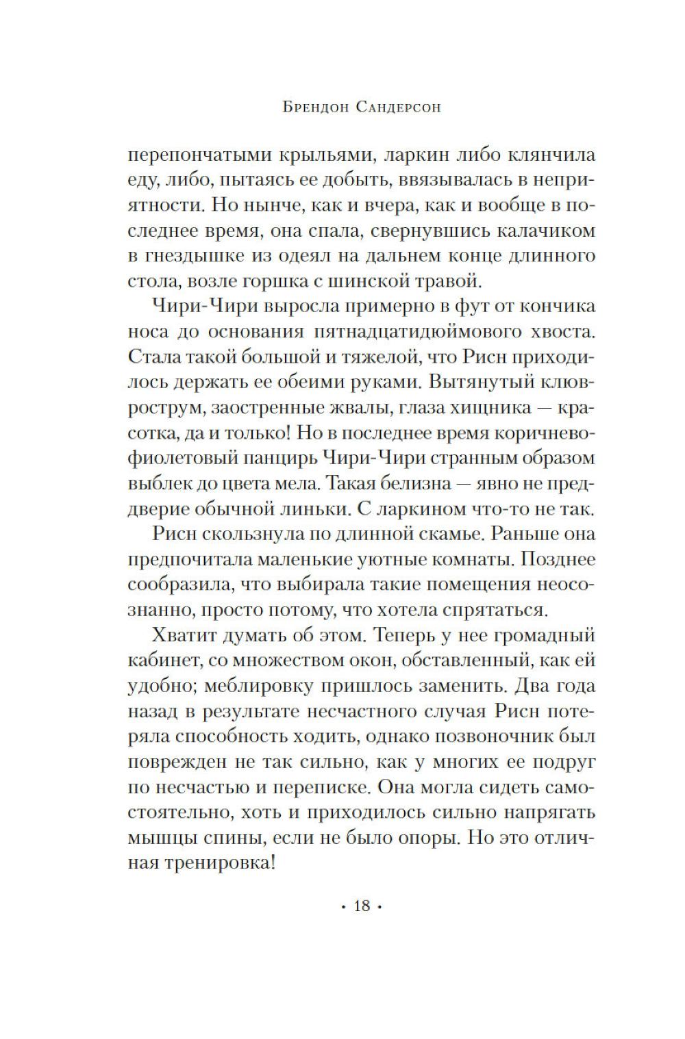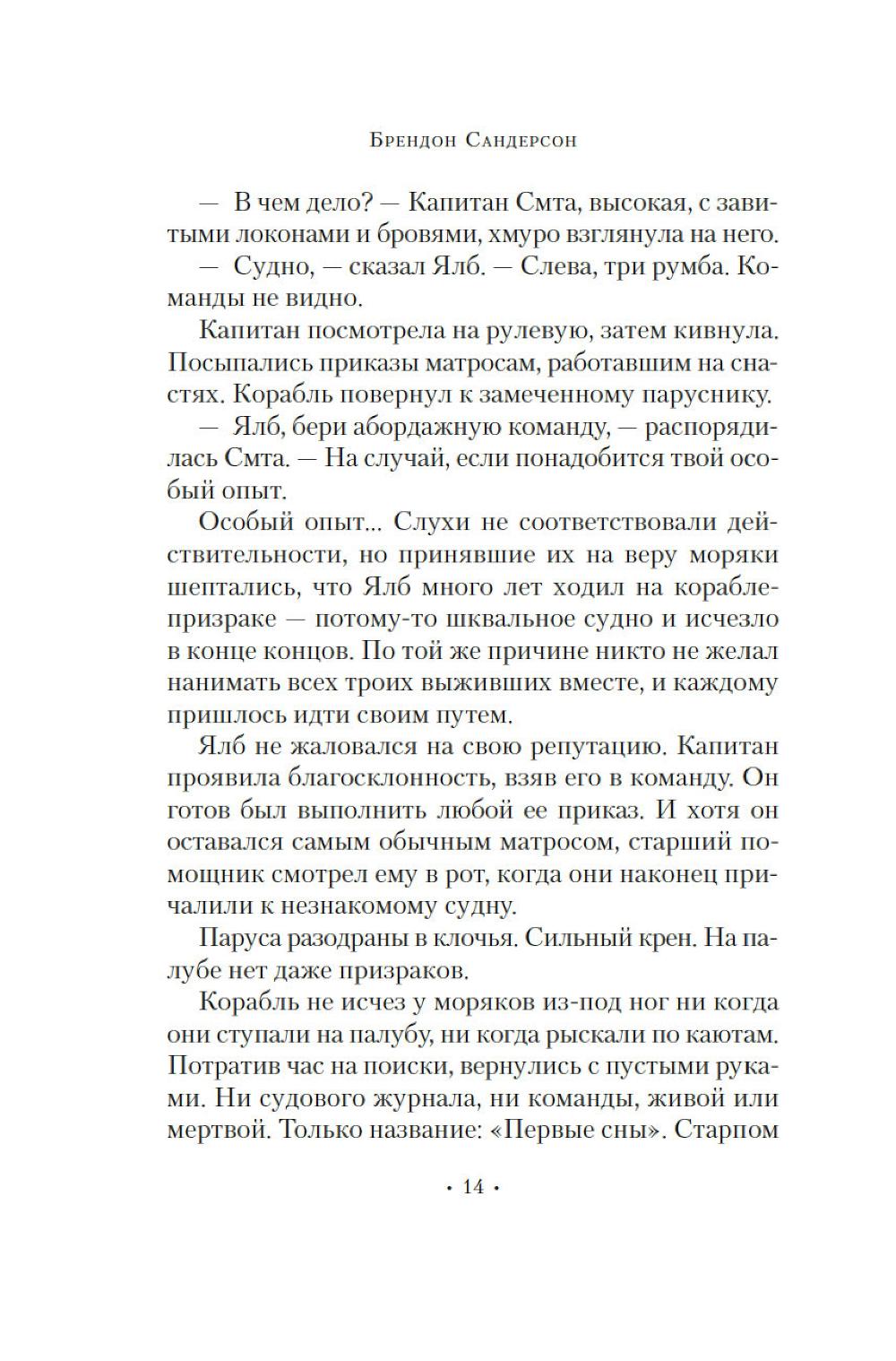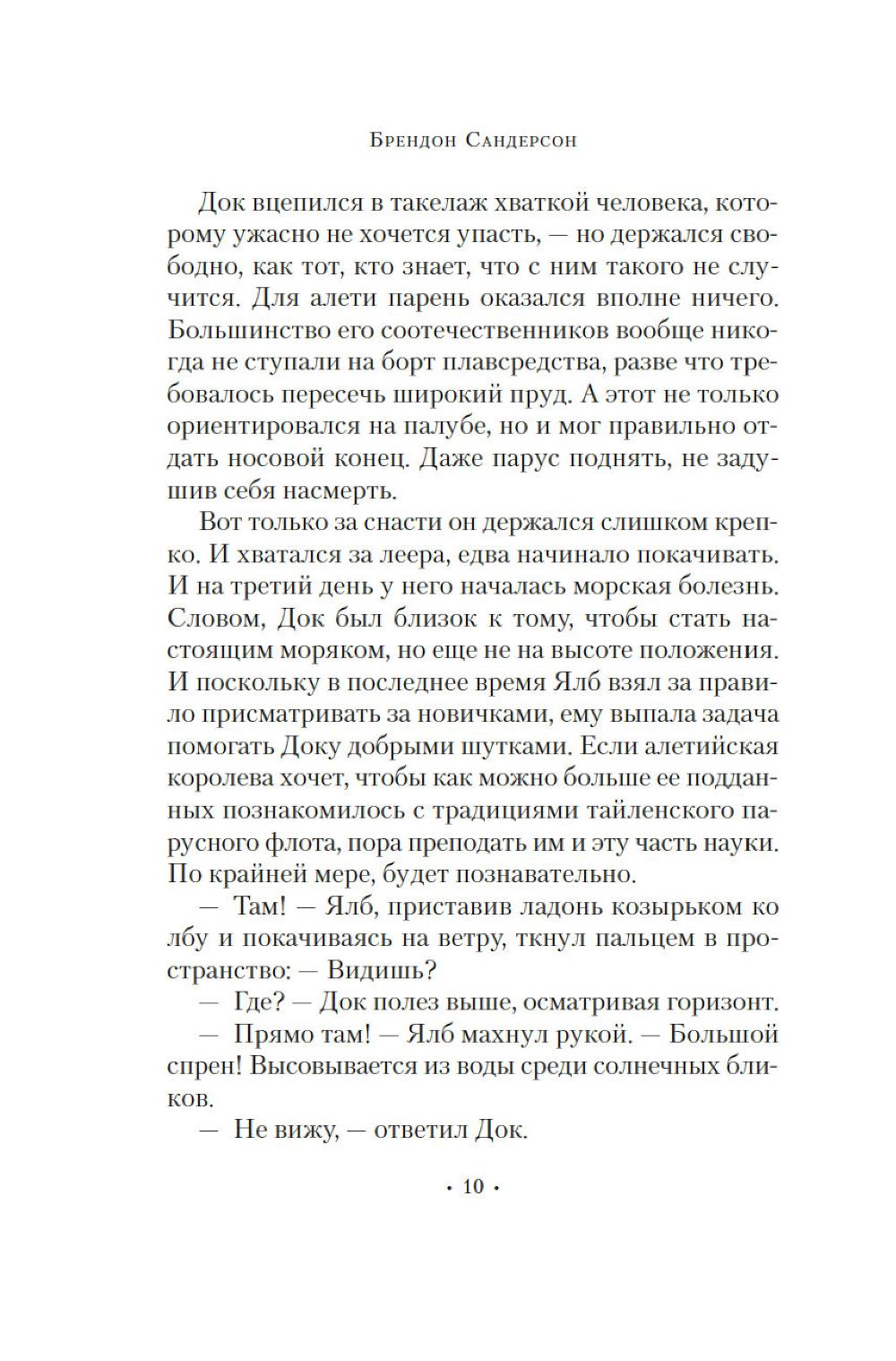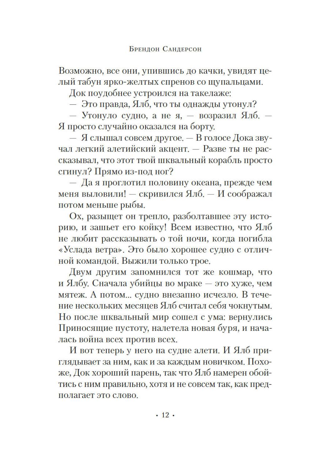 От автора «Архива Буресвета», фэнтезийного цикла № 1 в списке бестселлеров «New York Times» - спин-офф, сюжетно расположенный между «Давшим клятву» и «Ритмом войны». В океане обнаружено судно без единого человека на борту. Подозревая, что экипажу стоила жизни попытка прорваться через кольцо вечных бурь к острову Акина, королева Навани Холин решает выяснить, не оказалась ли полумифическая земля во власти врагов, и снаряжает парусную экспедицию. Судовладелица Рисн лишилась возможности ходить, зато приобрела крылатую подругу - ларкина, чей вид доселе считался вымершим. Но Чири-Чири тяжело больна, и единственная надежда исцелить ее - отвезти на родину предков, на Акину. Штормовой заслон грозит морякам верной гибелью, однако есть и иная сила - вполне разумная, в отличие от роковой стихии, - которая никак не может допустить, чтобы тайное стало явным. Впервые на русском!| Издательство | Азбука |