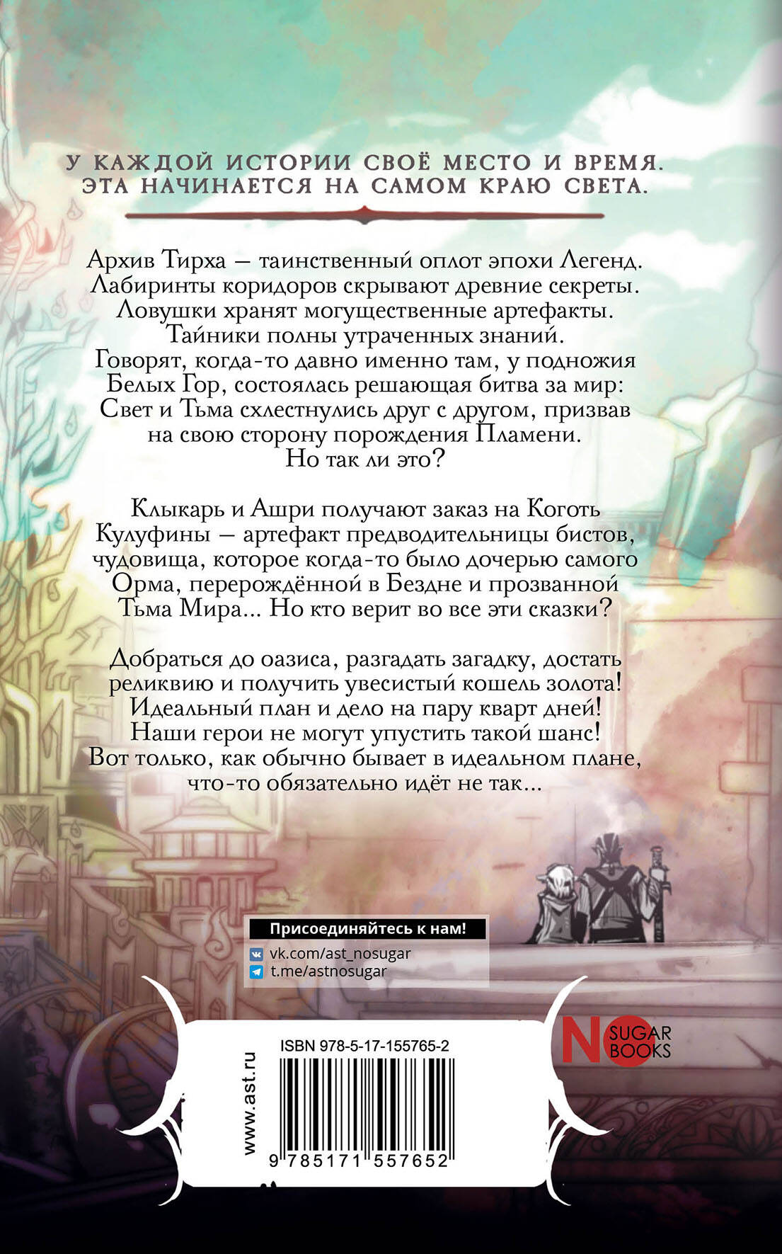 Первая книга цикла "Песок Мэйтару" от автора и художника мировых студий DC и Marvel! Архив Тирха - таинственный оплот Эпохи Легенд. Лабиринты коридоров скрывают древние секреты. Ловушки хранят могущественные артефакты. Тайники полны утраченных знаний. Говорят, когда-то давно именно там, у подножия Белых Гор, состоялась решающая битва за мир: Свет и Тьма схлестнулась друг с другом, призвав на свою сторону порождений Пламени. Но так ли это? Клыкарь и Ашри получают заказ на Коготь Кулуфины - артефакт предводительницы бистов, чудовища некогда бывшее дочерью самого Орму, перерождённой в Бездне и прозванной Тьма Мира… Но кто верит во все эти сказки? Добраться до оазиса, разгадать загадку, достать реликвию и получить увесистый кошель золота! Идеальный план и дело на пару кварт дней! Наши герои не могут упустить такой шанс! Вот только, как обычно бывает в идеальном плане, что-то обязательно идёт не так…| Издательство | ИЗДАТЕЛЬСТВО "АСТ" |