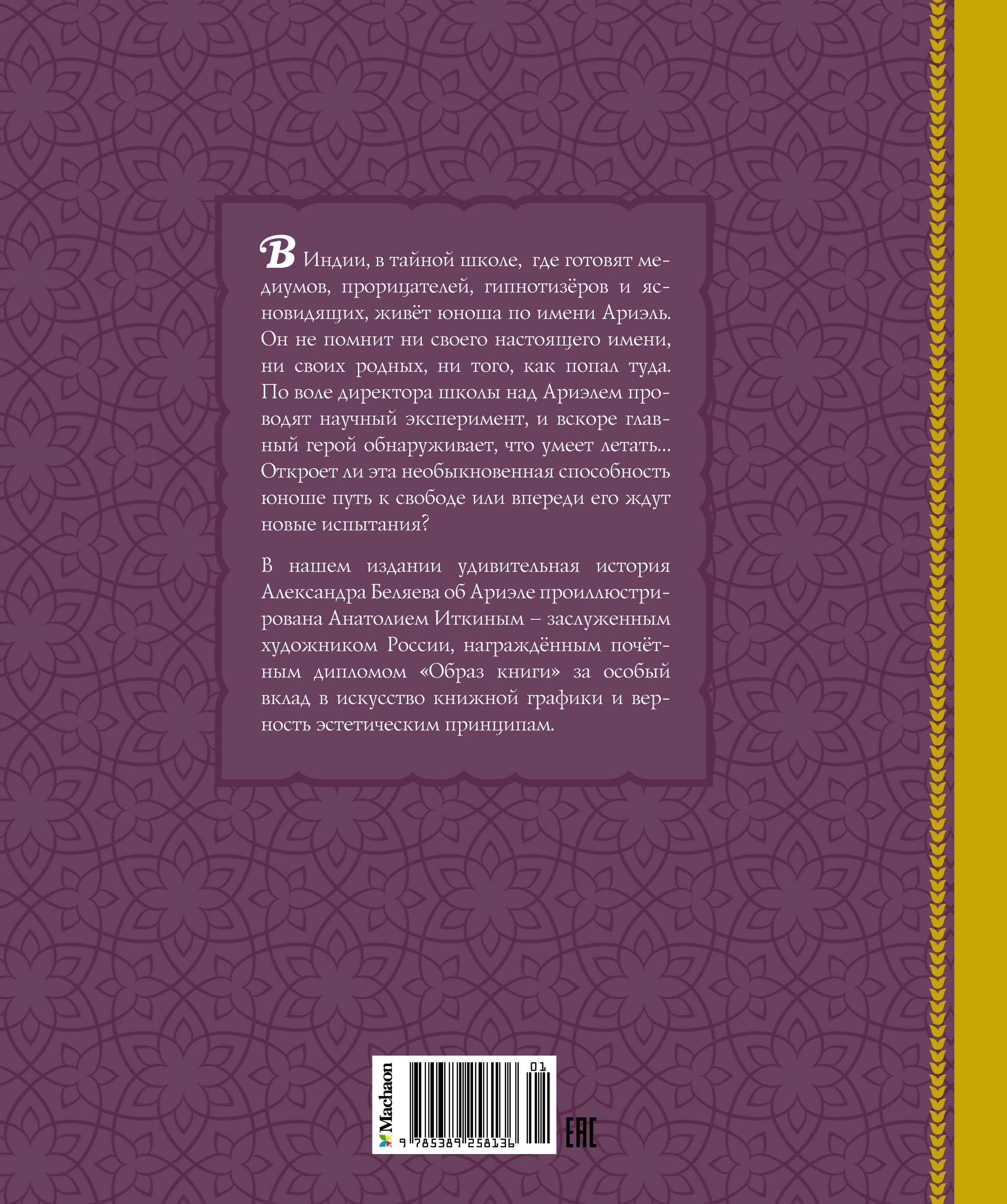 В Индии, в тайной школе, где готовят медиумов, прорицателей, гипнотизёров и ясновидящих, живёт юноша по имени Ариэль. Он не помнит ни своего настоящего имени, ни своих родных, ни того как попал туда. По воле директора школы над Ариэлем проводят научный эксперимент, и вскоре главный герой обнаруживает, что умеет летать… Откроет ли эта удивительная способность юноше путь к свободе или впереди его ждут новые испытания? В нашем издании фантастическая история Александра Беляева об Ариэле проиллюстрирована Анатолием Иткиным - заслуженным художником России, награждённым почётным дипломом "Образ книги" за особый вклад в искусство книжной графики и верность эстетическим принципам.| Издательство | Азбука-Аттикус Издат.группа ООО |