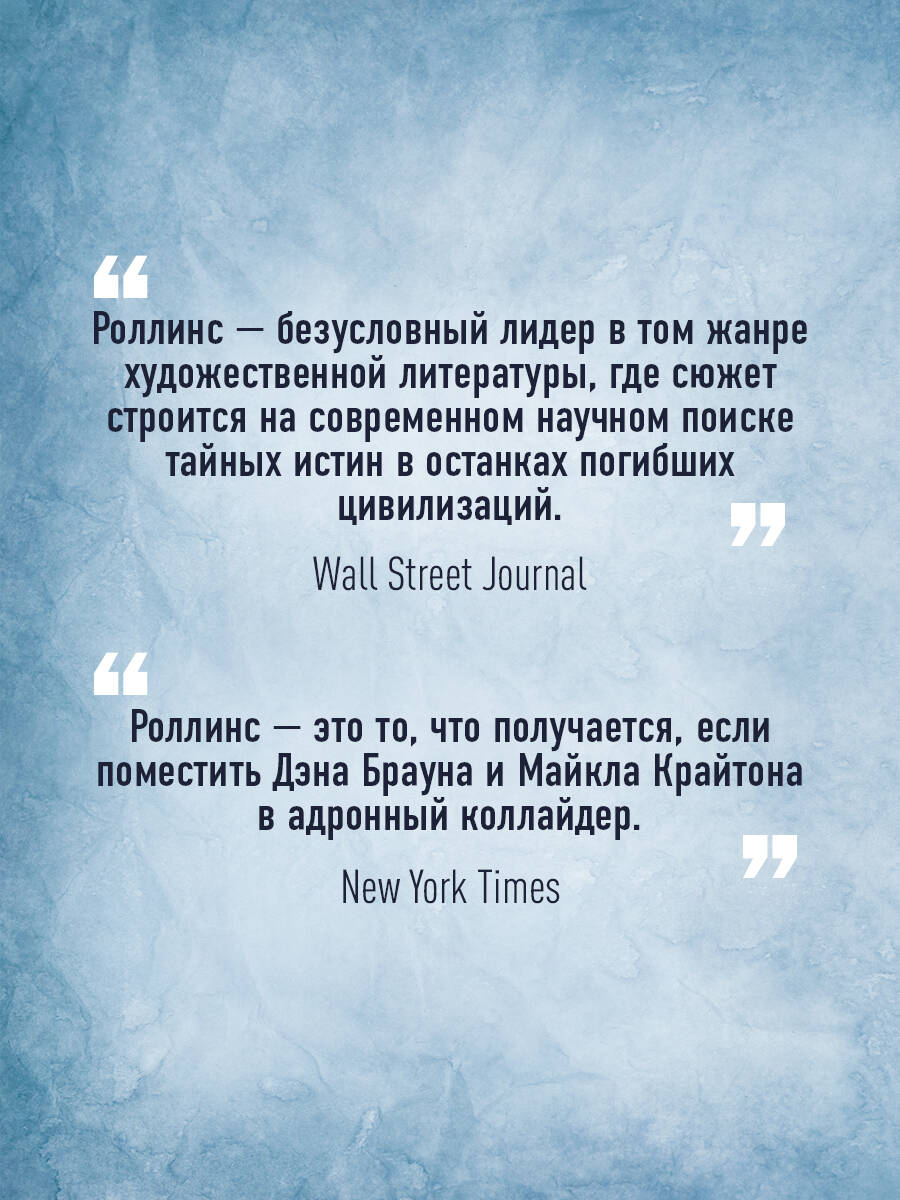 БЕСТСЕЛЛЕР NEW YORK TIMES. ПРОДОЛЖЕНИЕ КУЛЬТОВОЙ СЕРИИ ОБ ОТРЯДЕ «СИГМА». В Москве убит монсеньор Алекс Борелли, член Папской комиссии по священной археологии. Он приехал на переговоры о возвращении в Россию сотен книг, хранящихся в Ватикане. Перед смертью посланник папы успел отправить оперативному отряду «Сигма» сообщение, свидетельствующее - он напал на след Золотой библиотеки Ивана Грозного, легендарного книжного собрания, считавшегося навсегда утраченным, а на самом деле обнаруженным еще при Екатерине II, которая повелела сохранить находку в строжайшем секрете. Ее повеление не было просто монаршей прихотью. В библиотеке есть уникальный текст, содержащий не только зашифрованные указания о том, как добраться до руин уничтоженной древней северной цивилизации, но и информацию о смертоносной силе, что ее погубила. Эта сила до сих пор жива - и способна устроить катастрофу планетарного масштаба. Разгадывая невероятные головоломки, «Сигма» проделывает путь от монастырских катакомб Подмосковья через льды Белого моря на Северный полярный круг, чтобы предотвратить ужасный катаклизм. Девиз отряда - «Будь на месте первым», и его члены должны во что бы то ни стало следовать ему, ибо опасное путешествие совершают не они одни… Джеймс Роллинс - самый продаваемый автор приключенческих триллеров, создатель многочисленных бестселлеров № 1 по версии «New York Times», разошедшихся по всему миру тиражом 20 миллионов экземпляров и переведенных на 40 языков. _________________________________________________________________ «Роллинс - это то, что получается, если поместить Дэна Брауна и Майкла Крайтона в адронный коллайдер». - New York Times «Роллинс - безусловный лидер в том жанре художественной литературы, где сюжет строится на современном научном поиске тайных истин в останках погибших цивилизаций». - Wall Street Journal «Такие романы никто не пишет лучше Роллинса». - Ли Чайлд| Издательство | ООО "Издательство "Эксмо" |