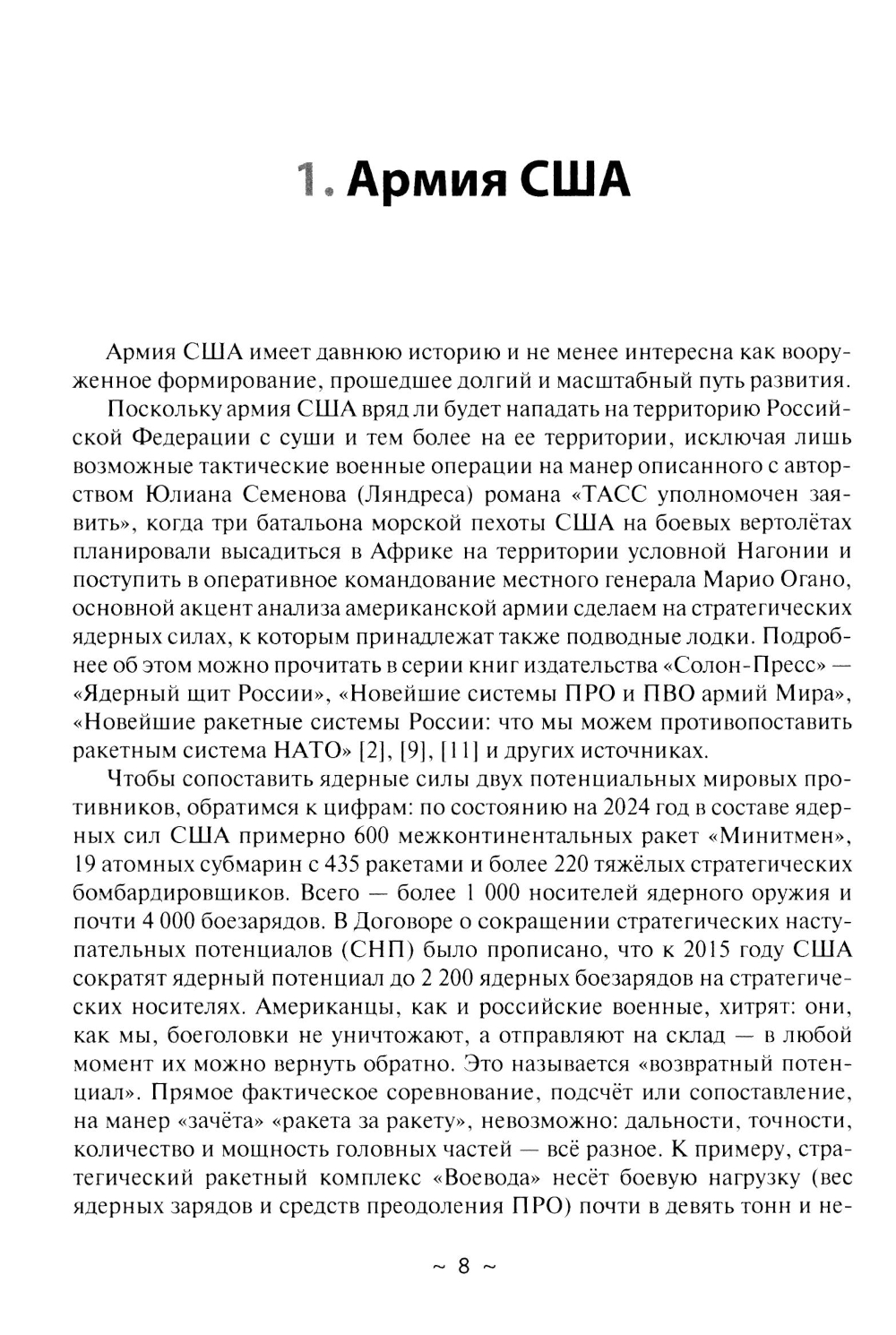 В книге приведены актуальные полезные валидные и верифицируемые сведения о вооружённых силах и вооружениях ведущих стран мира, и особенно подробно рассмотрен военный потенциал государств вероятного противника (блока НАТО). Даны познавательные сведения о структурной организации вооружённых сил с опорой на разные, в том числе оперативные, источники - указаны сильные стороны разных армий и вооружений и уязвимые места с точки зрения наступательной и оборонительной доктрины. Наглядно показан сравнительный анализ потенциалов армий разных стран и особенностей современных вооружений всех видов вооружённых сил. Книга насыщена иллюстрациями, создана как практико-производственный справочник вооружений разных видов и наиболее влиятельных стран. К каждому разделу предлагаются обоснованные выводы. Издание поможет в освоении знаний о насущной военной угрозе и способах её локализации (готовности) широкому кругу читателей. А также преподавателям школьного модуля «Элементы начальной военной подготовки» в рамках уроков основ безопасности жизнедеятельности (ОБЖ), педагогам дополнительного образования, воспитателям и всем заинтересованным лицам. От автора - военного эксперта, участника боевых действий, автора книг «Ядерный щит России», «Новейшие ракетные системы России», «Новейшие системы ПРО и ПВО стран Мира».| Издательство | Солон-пресс |
