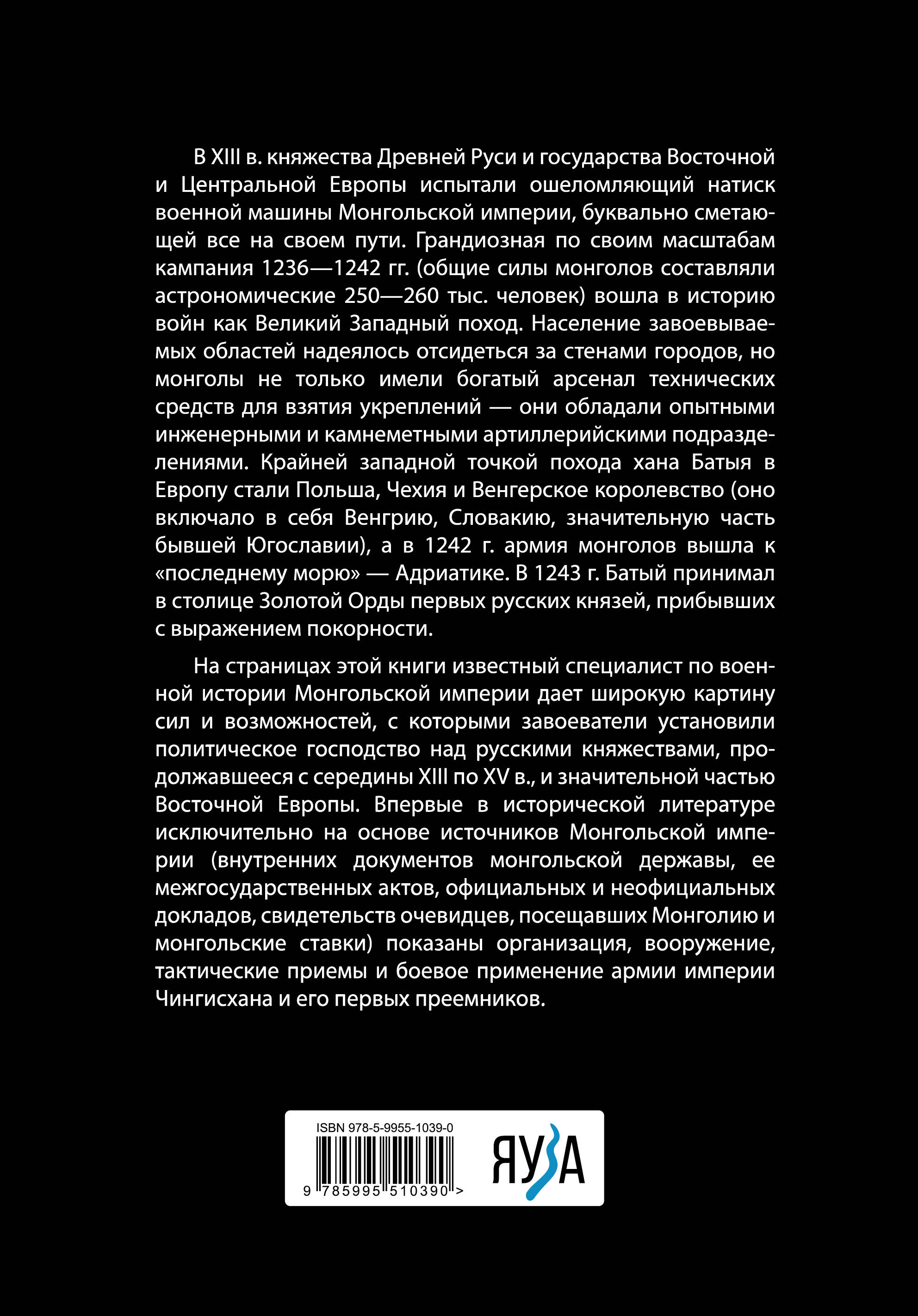 В XIII в. княжества Древней Руси и государства Восточной и Центральной Европы испытали ошеломляющий натиск военной машины Монгольской империи, буквально сметающей все на своем пути. Грандиозная по своим масштабам кампания 1236-1242 гг. (общие силы монголов составляли астрономические 250-260 тыс. человек) вошла в историю войн как Великий Западный поход. Население завоевываемых областей надеялось отсидеться за стенами городов, но монголы имели не только богатый арсенал технических средств для взятия укреплений - они обладали опытными инженерными и камнеметными артиллерийскими подразделениями. Крайней западной точкой похода хана Батыя в Европу стали Польша, Чехия и Венгерское королевство (оно включало в себя Венгрию, Словакию, значительную часть бывшей Югославии), а в 1242 г. армия монголов вышла к «последнему морю» - Адриатике. В 1243 г. Батый принимал в столице Золотой Орды первых русских князей, прибывших с выражением покорности. На страницах этой книги известный специалист по военной истории Монгольской империи дает широкую картину сил и возможностей, с которыми завоеватели установили политическое господство над русскими княжествами, продолжавшееся с середины XIII по XV в., и значительной частью Восточной Европы. Впервые в исторической литературе исключительно на основе источников Монгольской империи (внутренних документов монгольской державы, ее межгосударственных актов, официальных и неофициальных докладов, свидетельств очевидцев, посещавших Монголию и монгольские ставки) показаны организация, вооружение, тактические приемы и боевое применение армии империи Чингисхана и его первых преемников.| Издательство | Яуза-пресс ООО |