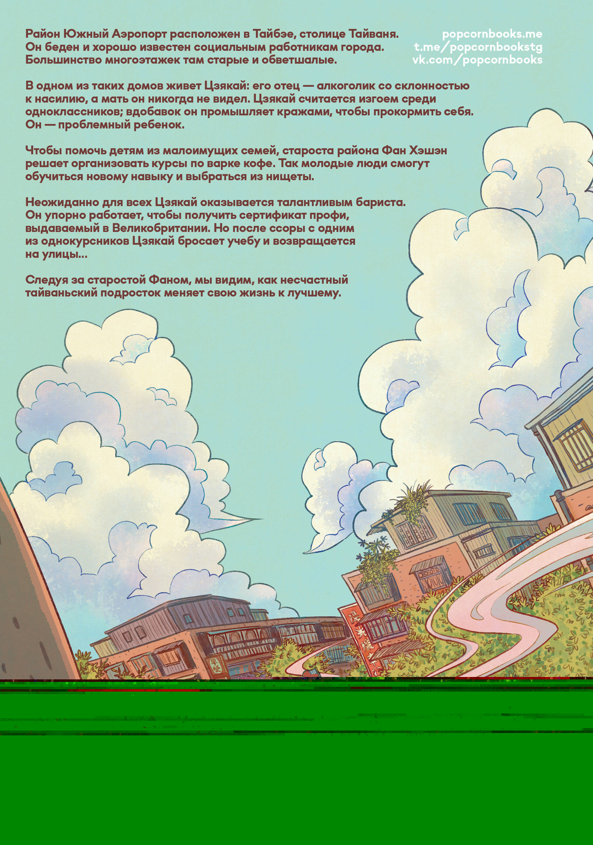 Район Южный Аэропорт расположен в Тайбэе, столице Тайваня. Он беден и хорошо известен социальным работникам города. Большинство многоэтажек там старые и обветшалые. В одном из таких домов живет Цзякай: его отец - алкоголик со склонностью к насилию, а мать он никогда не видел. Цзякай считается изгоем среди одноклассников; вдобавок он промышляет кражами, чтобы прокормить себя. Он - проблемный ребенок. Чтобы помочь детям из малоимущих семей, староста района Фан Хэшэн решает организовать курсы по варке кофе. Так молодые люди смогут обучиться новому навыку и выбраться из нищеты. Неожиданно для всех Цзякай оказывается талантливым бариста. Он упорно работает, чтобы получить сертификат профи, выдаваемый в Великобритании. Но после ссоры с одним из однокурсников Цзякай бросает учебу и возвращается на улицы… Следуя за старостой Фаном, мы видим, как несчастный тайваньский подросток меняет свою жизнь к лучшему.| Издательство | ИНДИВИДУУМ ПРИНТ ООО |