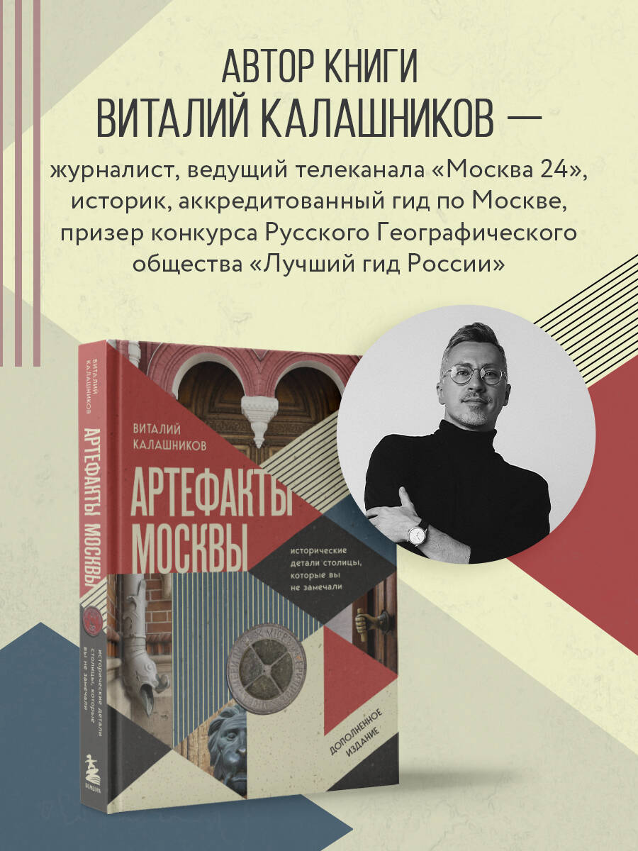 Дополненное издание уже полюбившейся книги про московские артефакты! Виталий Калашников (starina_kalashnikov) - профессиональный историк, москвовед, аккредитованный гид и ведущий телеканала «Москва 24». В 2021 году стал призером IV конкурса Русского географического общества «Лучший гид России» в номинации «Город». В первой книге «Тайны московских особняков» Виталий рассказал про 35 особняков Москвы, в которые может попасть каждый желающий. В новой книге он решил сосредоточиться на не менее интересных исторических деталях столицы. Ведь каждый день проходим мимо множества люков, фонарей, рекламных вывесок, причудливых окон... А что, если многие из них представляют собой особую историческую ценность и являются культурным наследием? Эта книга поможет вам по-новому взглянуть на Москву, и вы сами станете замечать все те сокровища прошлого, мимо которых проходили раньше! Из книги вы узнаете: • Что такое окна люксферы и какой у них принцип работы? • Для чего использовались знаменитые стекла фальконье? • Где можно найти самое старое граффити Москвы? • Какие артефакты скрываются на Красной площади? И многие другие занимательные факты из истории нашей столицы. «Ну наконец-то есть большой и дотошный материал про московские артефакты, которые десятки лет все считали мусором под ногами, а они оказались кладом капитана Флинта! Шикарно, что эту книгу написал человек, который изучил весь город своими ногами, а не сканером в библиотеке. Просто берите этот гайд и идите обожать Москву, смотреть новым взглядом на сто раз пройденные улицы и фанатеть от того, как много у нас есть секретиков и уникальных историй». - Наталья Тарнавская, главарь трудкоммуны «Вспомнить всё»