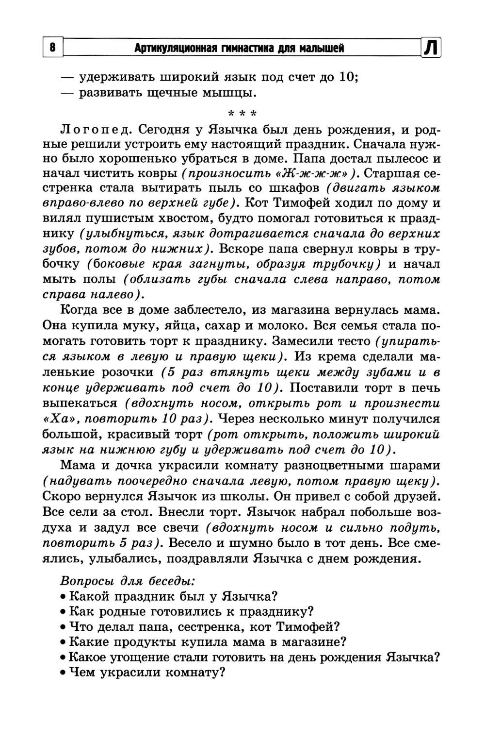 В предлагаемой читателю книге представлена авторская методика проведения артикуляционной гимнастики с детьми дошкольного возраста. С помощью веселых историй о Язычке детей знакомят со строением артикуляционного аппарата, основными видами движений органов речи. Занимательные игры и упражнения позволят не только уточнить и закрепить правильное звукопроизношение, но и развить фонематический слух. Книга адресована логопедам и воспитателям дошкольных учреждений, а также родителям, заботящимся о формировании правильной, чистой и ясной речи ребенка.