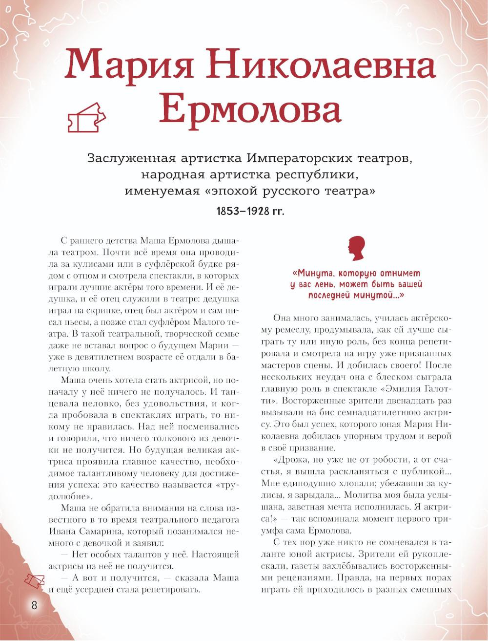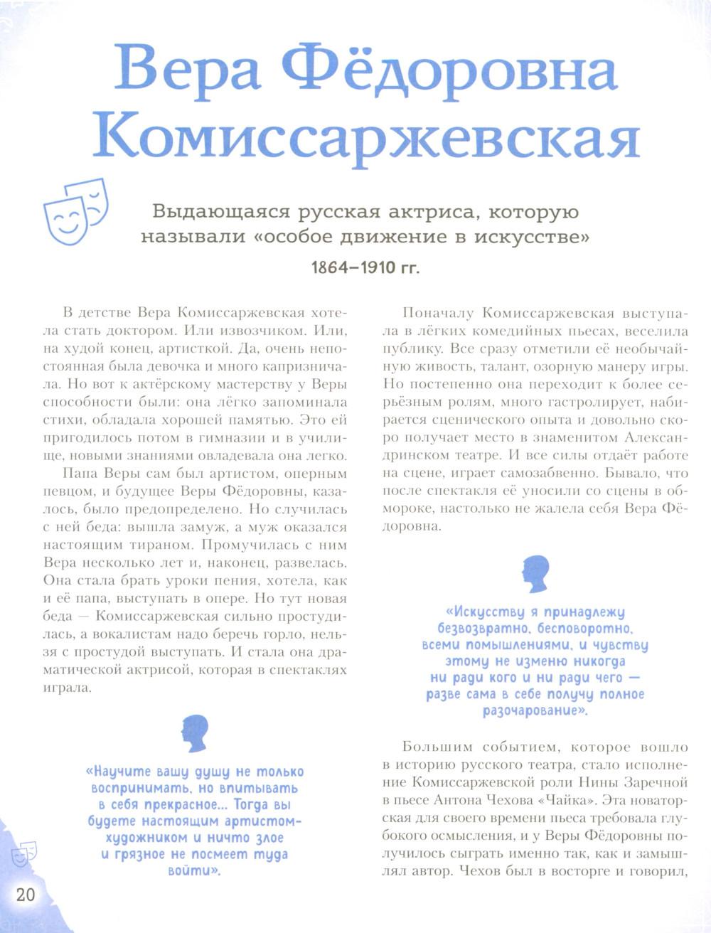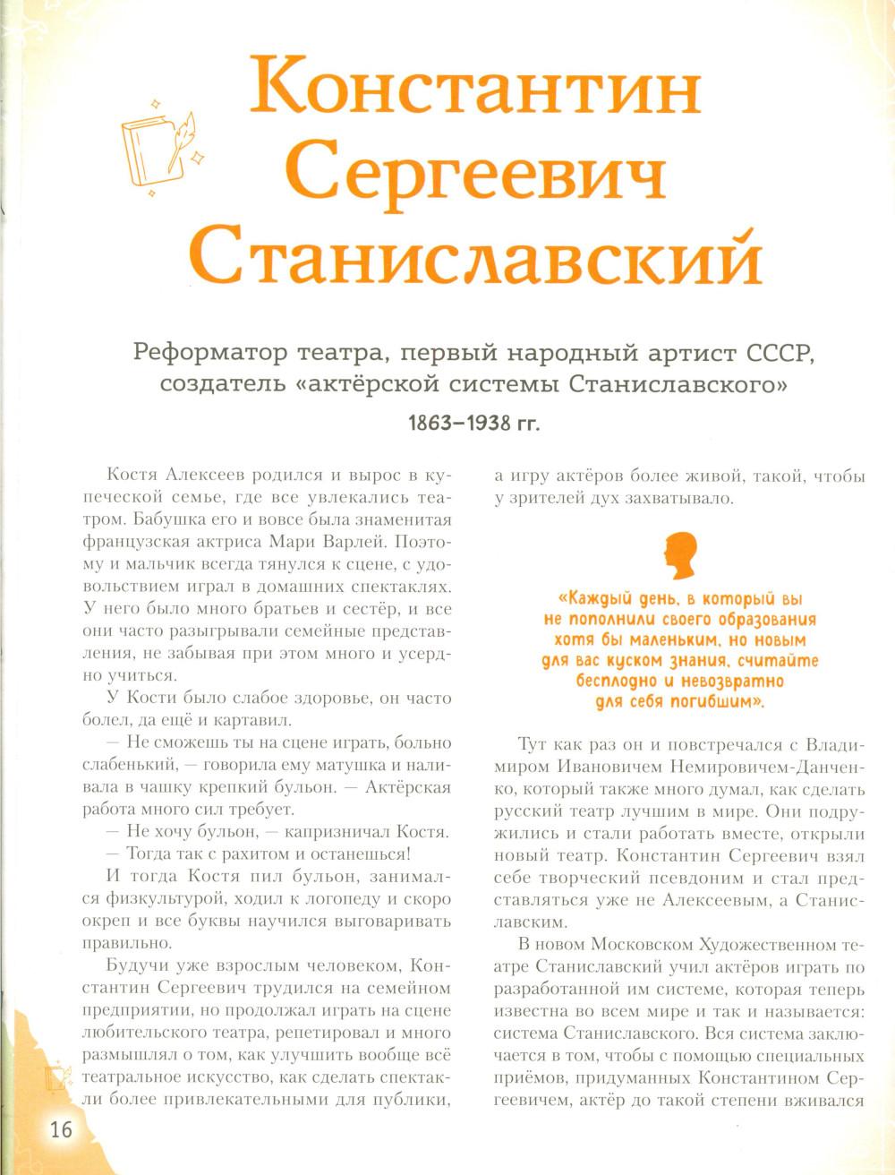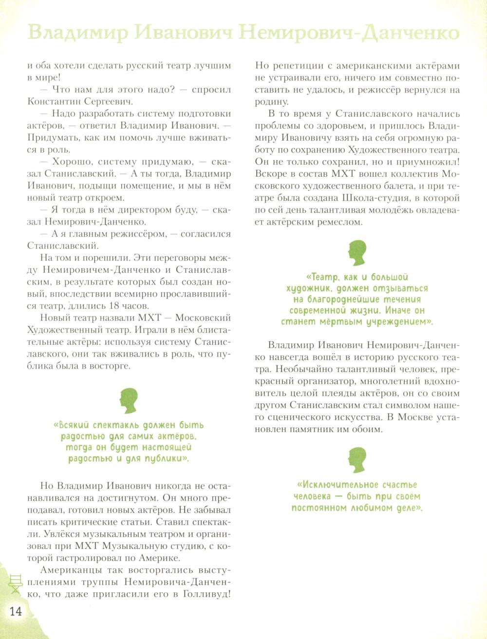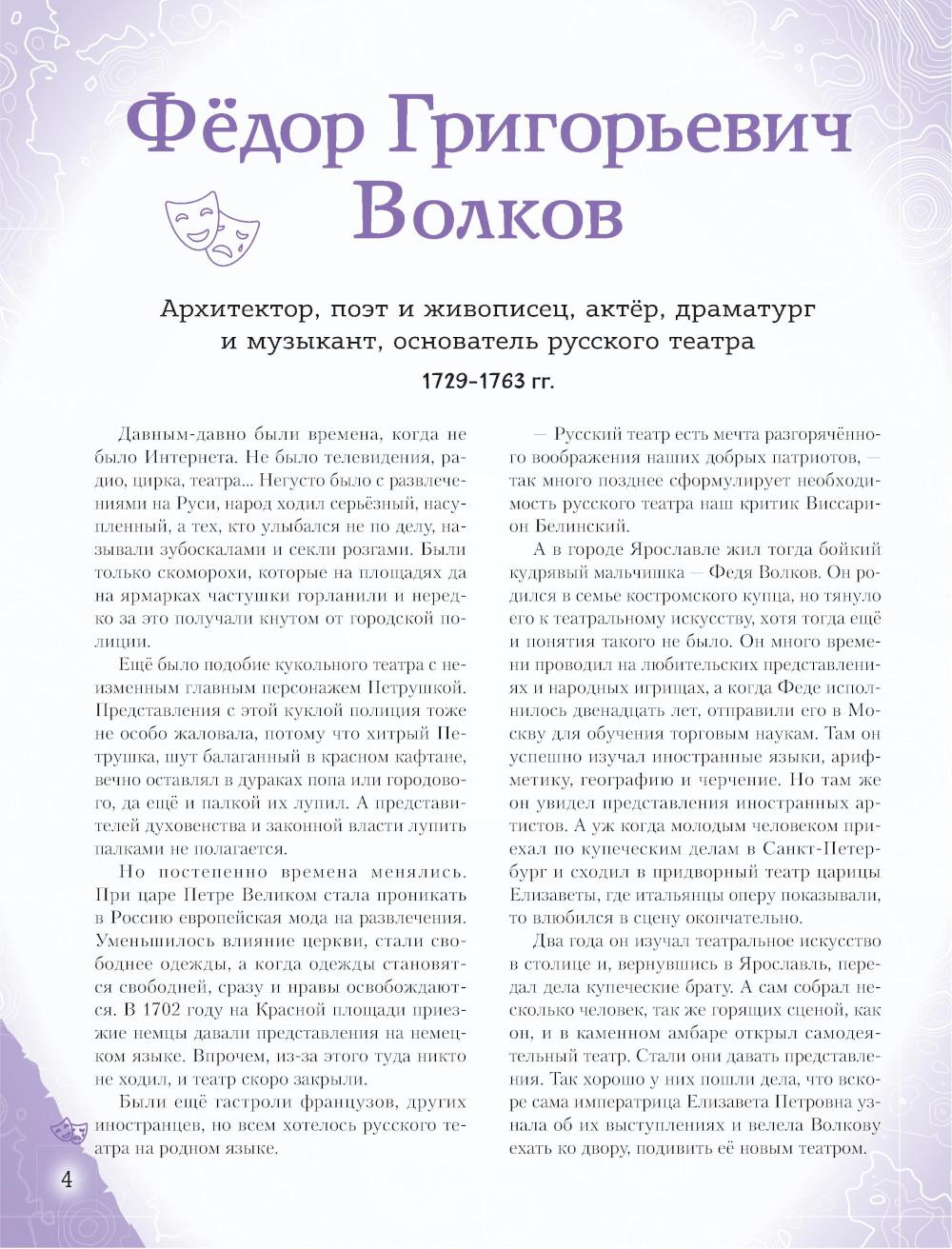 Эта книга патриотической серии «Великие люди великой страны» рассказывает о двадцати наших знаменитых соотечественниках - актёрах, режиссёрах, сценаристах, певцах, танцовщиках и других деятелях театра и кино, чьи имена навсегда останутся в истории России. Кто основал самый первый русский театр? Как цирковой клоун без профессионального образования покорил огромную страну? Какому культовому режиссёру подражают во всём мире? Захватывающие сюжеты в жанре нарративного нонфикшена, исторических «детективов» и «боевиков»! В каждом рассказе - вдохновляющая читателей на собственные свершения история успеха, невероятный пример силы воли и стойкости характера! Динамичные, запоминающиеся, современные, яркие иллюстрации созданы специально для этой книги! Книги серии получили заслуженно высокую оценку - в 2024 году они были номинированы на премию Российского общества «Знание» в категории «Лучшая просветительская книга». Издание предназначено для среднего школьного возраста, однако будет интересно и взрослым, а также станет неповторимым подарком по любому поводу для всех, кто любит Россию и гордится ею. Читайте всей семьёй и узнавайте всё самое интересное о великих людях нашей страны!