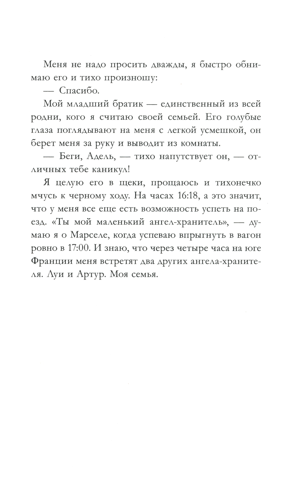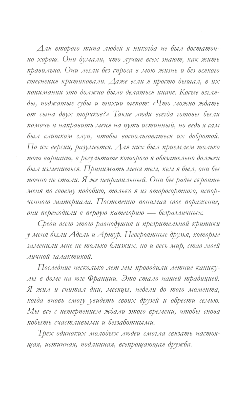 Артур, Луи и Адель познакомились однажды летом на юге Франции и с тех пор каждые каникулы проводили вместе. Беззаботные дни, звездные ночи, запах соленого моря, счастливые улыбки и... первая любовь. Только Адель не помнит этого. Несчастный случай забрал у нее все до единого воспоминания. Что останется от человека, если лишить его памяти? Адель не может жить дальше, пока не узнает правду. Что скрывает ее прошлое? Знает Артур, но он не готов рассказать. Молодой человек уверен: порой воспоминания страшнее неведения. Адель ничего не помнит, Артур помнит все, а Луи расскажет, как все было.| Издательство | Клевер-Медиа-Групп |