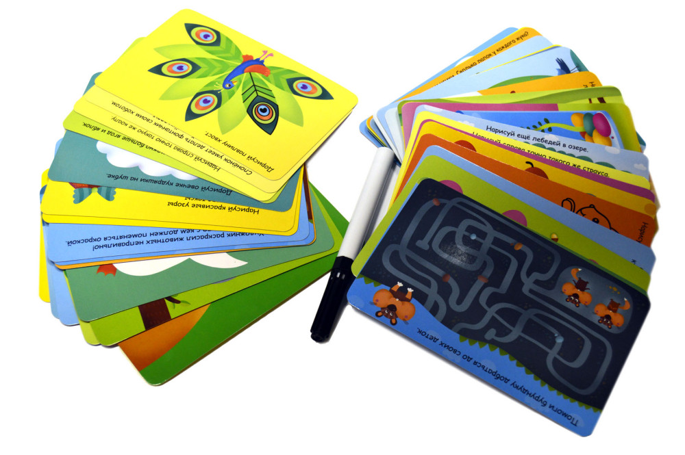 В этом наборе вы найдёте 50 многоразовых двусторонних карточек с яркими добрыми картинками животных, а также фломастер на водной основе. Так как карточки сделаны из картона, покрытые защитной пленкой, рисовать и стирать можно сколько угодно!