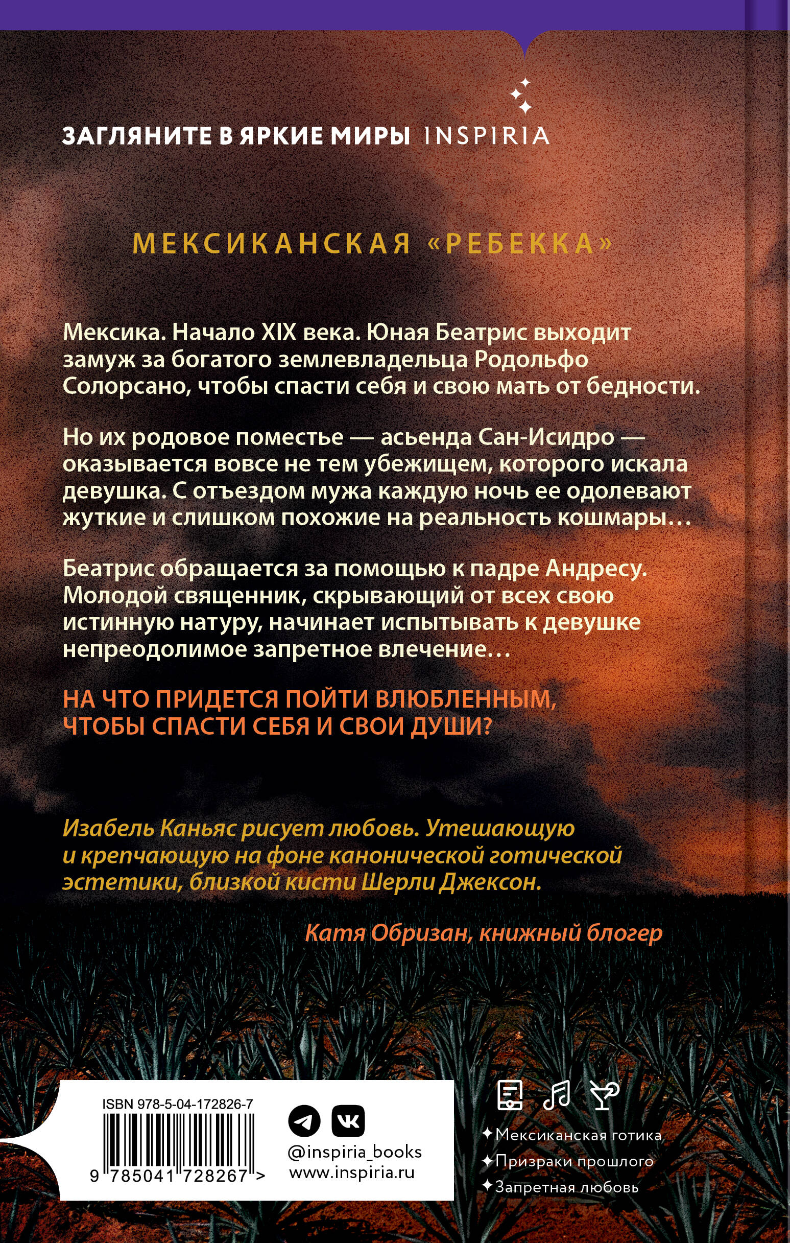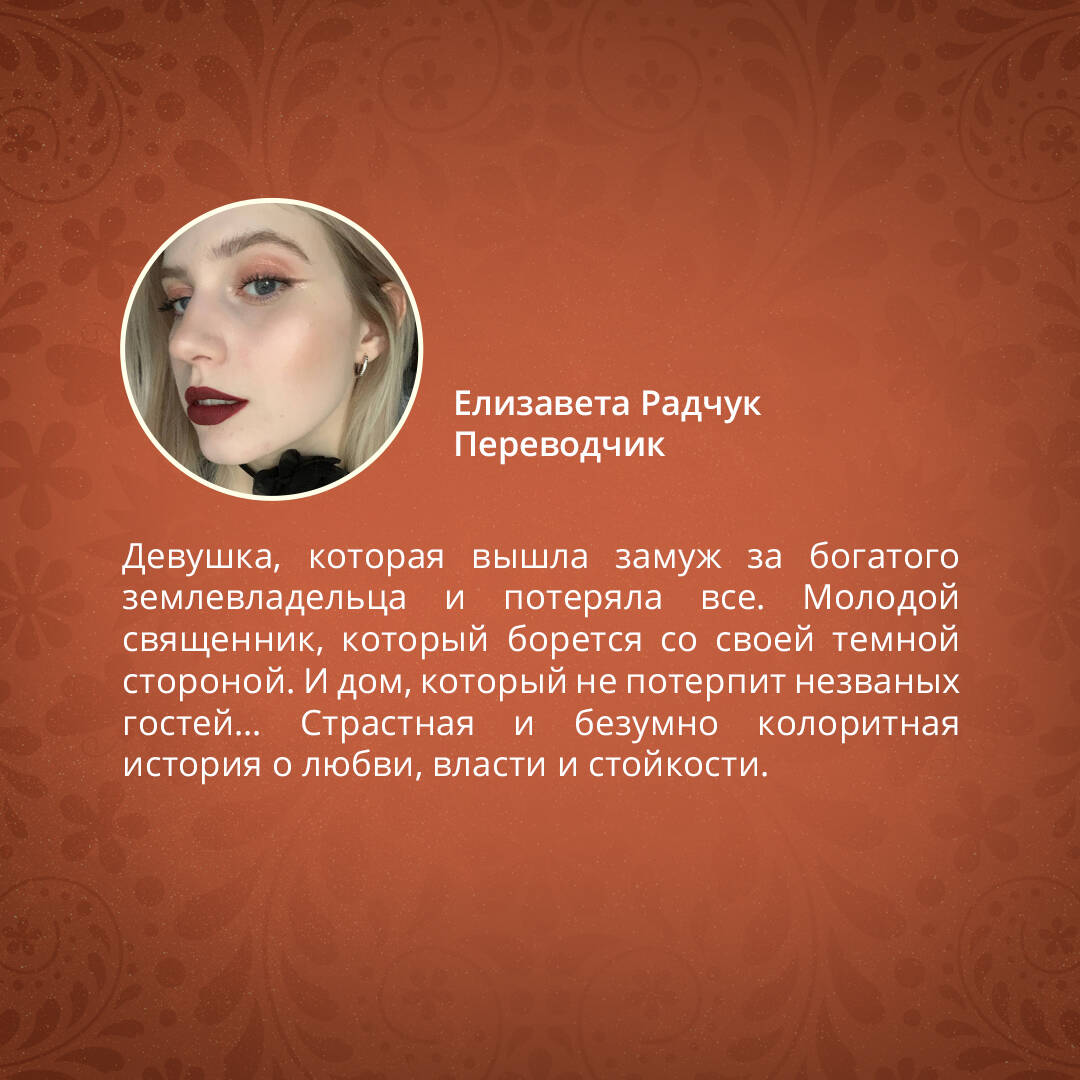 НОМИНАНТ НА ПРЕМИИ «БРЭМА СТОКЕРА», «ЛУЧШИЙ ХОРРОР 2022» И «ЛУЧШИЙ ДЕБЮТНЫЙ РОМАН 2022». ИДЕАЛЬНОЕ СОЧЕТАНИЕ «МЕКСИКАНСКОЙ ГОТИКИ», «РЕБЕККИ» И «ПРИЗРАКОВ ДОМА НА ХОЛМЕ». Мексика. Начало XIX века. Она - хозяйская жена. Он - священник, хранящий мрачную тайну. Их пути не должны были переплестись так тесно, но Зло не оставило им выбора. После окончания Войны за независимость юная Беатрис оказывается в затруднительном положении: ее отец убит, их дом сожжён, а им с матерью приходится прислуживать знатным родственникам. Все меняется, когда богатый землевладелец Родольфо Солорсано делает ей предложение. И не важно, что смерть его первой жены выглядит подозрительно. Беатрис нужен собственный дом. Но поместье - асьенда Сан-Исидро - оказалось вовсе не тем убежищем, которого искала девушка. С отъездом мужа каждую ночь ее одолевают жуткие и слишком похожие на реальность кошмары. Хуана, сестра Родольфо, смеется над страхами Беатрис. Но почему тогда она сама отказывается входить в дом с наступлением ночи? Зачем кухарка украшает дверной проем кухни странными символами и жжет копаловые благовония, изгоняющие злых духов? И что на самом деле случилось с первой доньей Солорсано? Беатрис обращается за помощью к падре Андресу. Молодой священник, скрывающий от всех свою истинную натуру ведуна, испытывает к девушке непреодолимое запретное влечение. Он должен совершить немыслимое, чтобы защитить ее и очистить асьенду от тьмы. Если они проиграют, его ждет огонь Инквизиции, а ее - вечное заточение в стенах этого дома… _________________________________________________________ «Книга сверхъестественной, леденящей душу красоты. Призраки, изгнание нечистой силы, запретная любовь - "Асьенда" переносит нас в мир, где любовь торжествует над демонами». - The New York Times «Готическая история об обреченной любви и мстительных духах». - The Washington Post «История о любви, ужасе и потусторонней угрозе». - Harper's Bazaar «Восхитительная, красивая и полностью заслуживающая сравнения с "Ребеккой", "Асьенда" - незаменимое чтение в готическом возрождении». - CrimeReads «Если вы любите жанр готического хоррора, хотите увидеть свободолюбивую героиню и историю с большим количеством остроты, то "Асьенда" может быть именно тем, что вы искали». - Mystery & Suspense «Этот исторический роман привлекает выразительным языком и погружает нас в зловещий мир. По сюжету эта история напоминает "Ребекку" Дафны дю Морье, но наполнена гораздо более мрачным ужасом… Каньяс создала притягательных персонажей Беатрис и Андреса, и да, самого дома, но остерегайтесь крови и сверхъестественной жестокости. Страницы быстро переворачиваются к безупречному и удовлетворяющему финалу». - Historical Novel Society| Издательство | ООО "Издательство "Эксмо" |