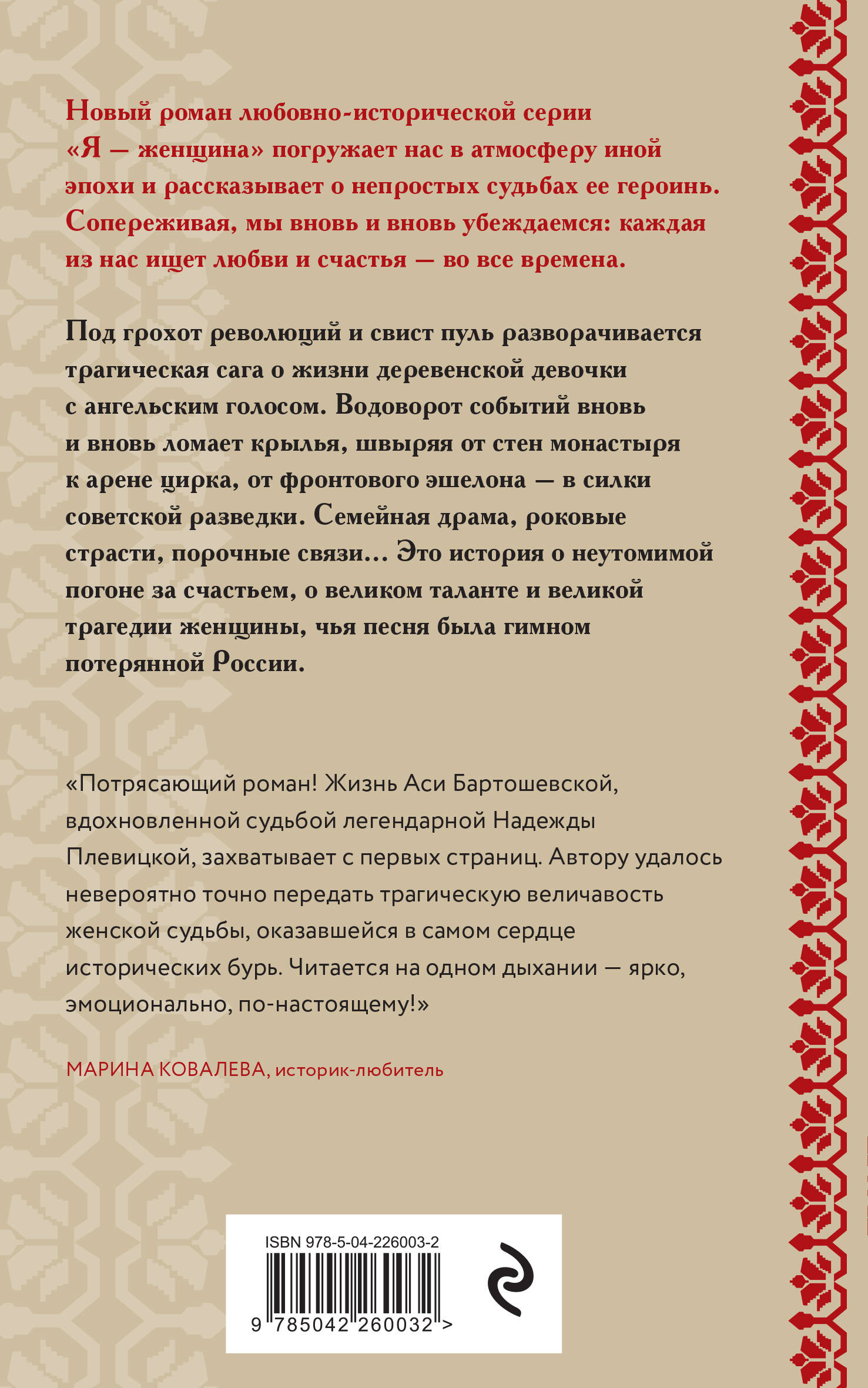 Под грохот революций и свист пуль разворачивается трагическая сага о жизни деревенской девочки с ангельским голосом. Водоворот событий вновь и вновь ломает крылья, швыряя от стен монастыря к арене цирка, от фронтового эшелона - в силки советской разведки. Семейная драма, роковые страсти, порочные связи… Это история о неутомимой погоне за счастьем, о великом таланте и великой трагедии женщины, чья песня была гимном потерянной России. «Потрясающий роман! Жизнь Аси Бартошевской, вдохновленной судьбой легендарной Надежды Плевицкой, захватывает с первых страниц. Автору удалось невероятно точно передать трагическую величавость женской судьбы, оказавшейся в самом сердце исторических бурь. Читается на одном дыхании - ярко, эмоционально, по-настоящему!» - Марина Ковалева, историк-любитель Новый роман любовно-исторической серии "Я - женщина" погружает нас в атмосферу иной эпохи и рассказывает о непростых судьбах ее героинь. Сопереживая, мы вновь и вновь убеждаемся: каждая из нас ищет любви и счастья - во все времена.| Издательство | ООО "Издательство "Эксмо" |