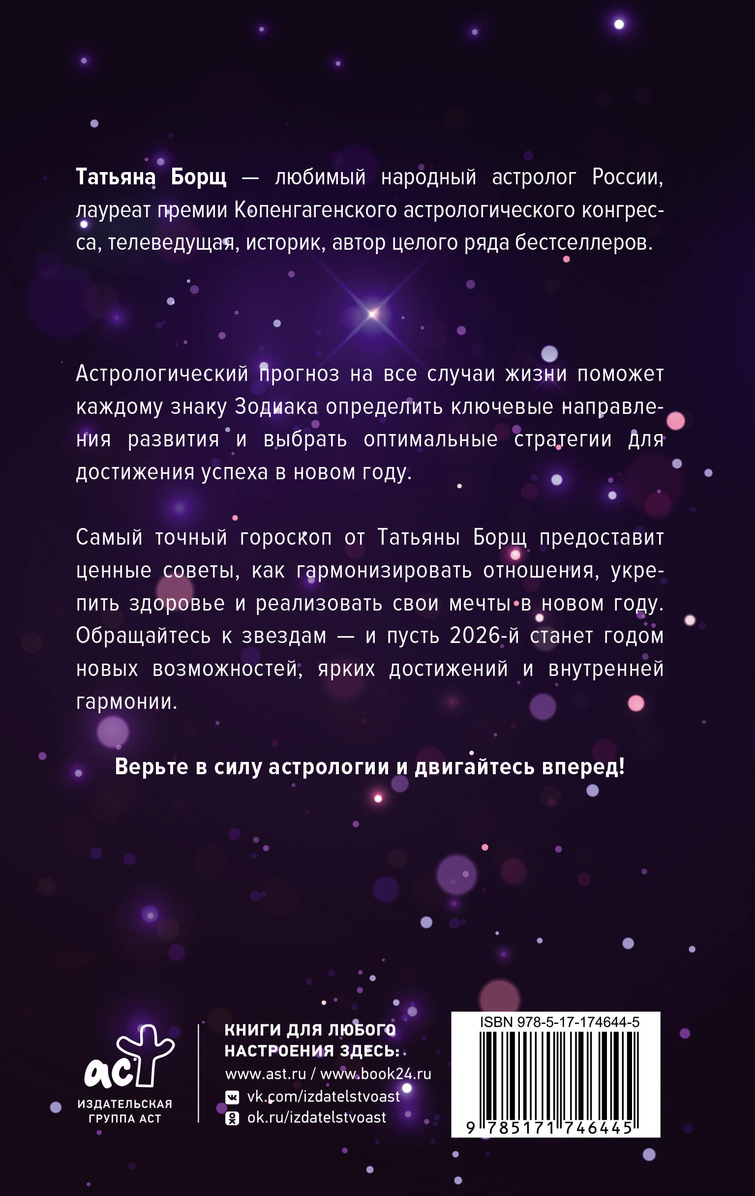 Татьяна Борщ - любимый народный астролог России, лауреат премии Копенгагенского астрологического конгресса, телеведущая, историк, автор целого ряда бестселлеров. Астрологический прогноз на все случаи жизни поможет каждому знаку Зодиака определить ключевые направления развития и выбрать оптимальные стратегии для достижения успеха в новом году. Самый точный гороскоп от Татьяны Борщ предоставит ценные советы, как гармонизировать отношения, укрепить здоровье и реализовать свои мечты в новом году. Обращайтесь к звездам - и пусть 2026-й станет годом новых возможностей, ярких достижений и внутренней гармонии. Верьте в силу астрологии и двигайтесь вперед!| Издательство | Издательство "АСТ" |
