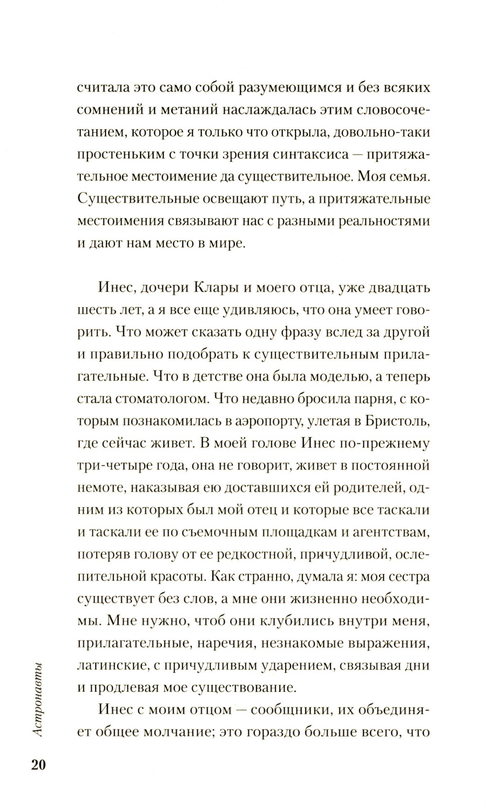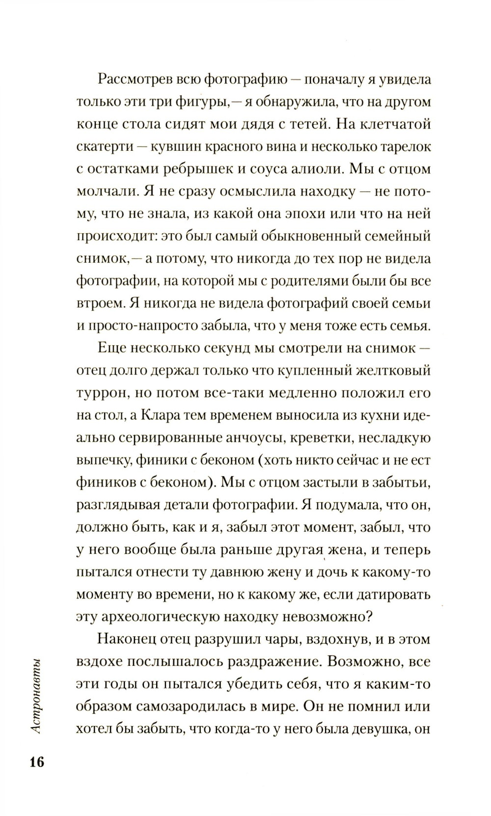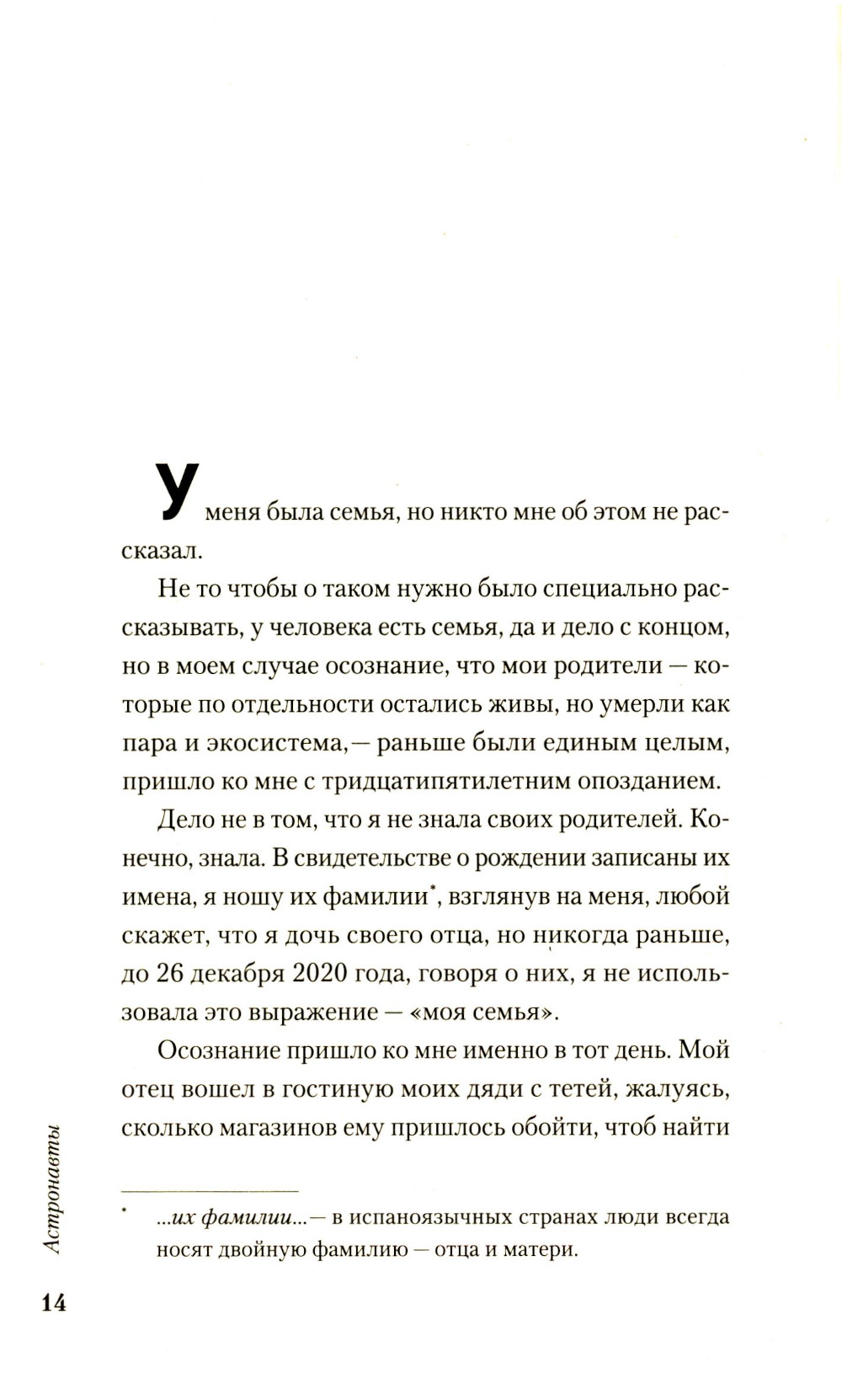 Тонкое психологическое исследование природы памяти и семейной любви, соотносимое с прозой Анни Эрно, Карла Уве Кнаусгора, Оксаны Васякиной. Однажды тридцатипятилетняя героиня романа находит фотокарточку, на которой отец и мать держат ее, совсем маленькую, на руках. Эта находка меняет все - с нее начинается длительное и напряженное путешествие в прошлое, которое напоминает героине космические миссии. Ей, вернувшейся в родной дом в Барселоне, крайне непросто - мать тяжело болеет, отец переехал в Мадрид, ее сводные брат и сестра не знакомы друг с другом... Никто не хочет ворошить семейные тайны и детские травмы. Пытаясь оглянуться назад, разобраться с прошлым, она твердит себе: астронавтам было в разы сложнее, но именно их полеты дали возможность открыть то, что, оказывается, всегда было в пределах досягаемости.| Издательство | Livebook (Лайвбук) |