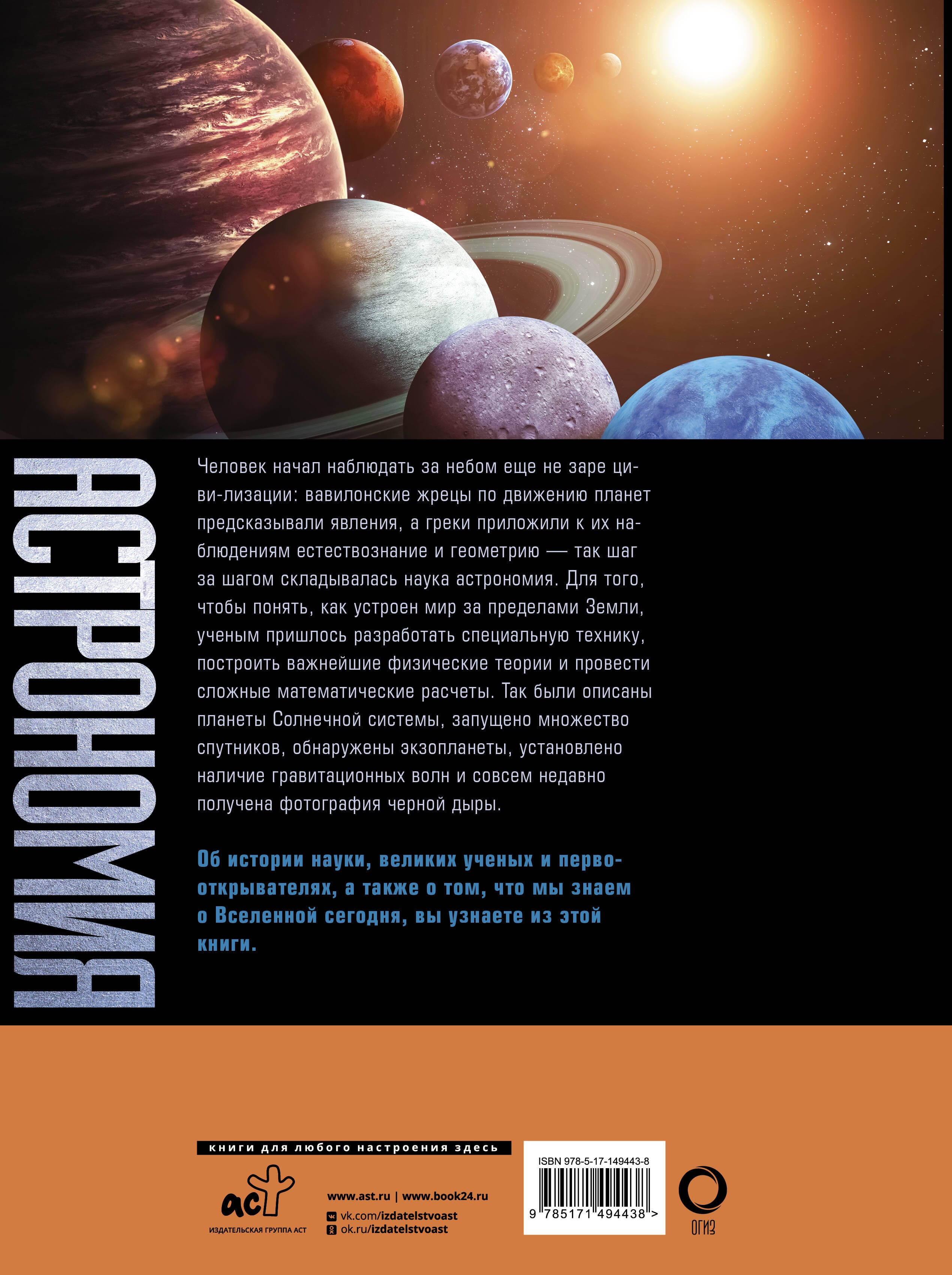 Человек начал наблюдать за небом еще на заре цивилизации: вавилонские жрецы по движению планет предсказывали явления, а греки приложили к их наблюдениям естествознание и геометрию - так шаг за шагом складывалась наука астрономия. Для того чтобы понять, как устроен мир за пределами Земли, ученым пришлось разработать специальную технику, построить важнейшие физические теории и провести сложные математические расчеты. Так были описаны планеты Солнечной системы, запущено множество спутников, обнаружены экзопланеты, установлено наличие гравитационных волн и совсем недавно получена фотография черной дыры. Об истории науки, великих ученых и первооткрывателях, а также о том, что нам известно о Вселенной сегодня, вы узнаете из этой книги.| Издательство | ИЗДАТЕЛЬСТВО "АСТ" |