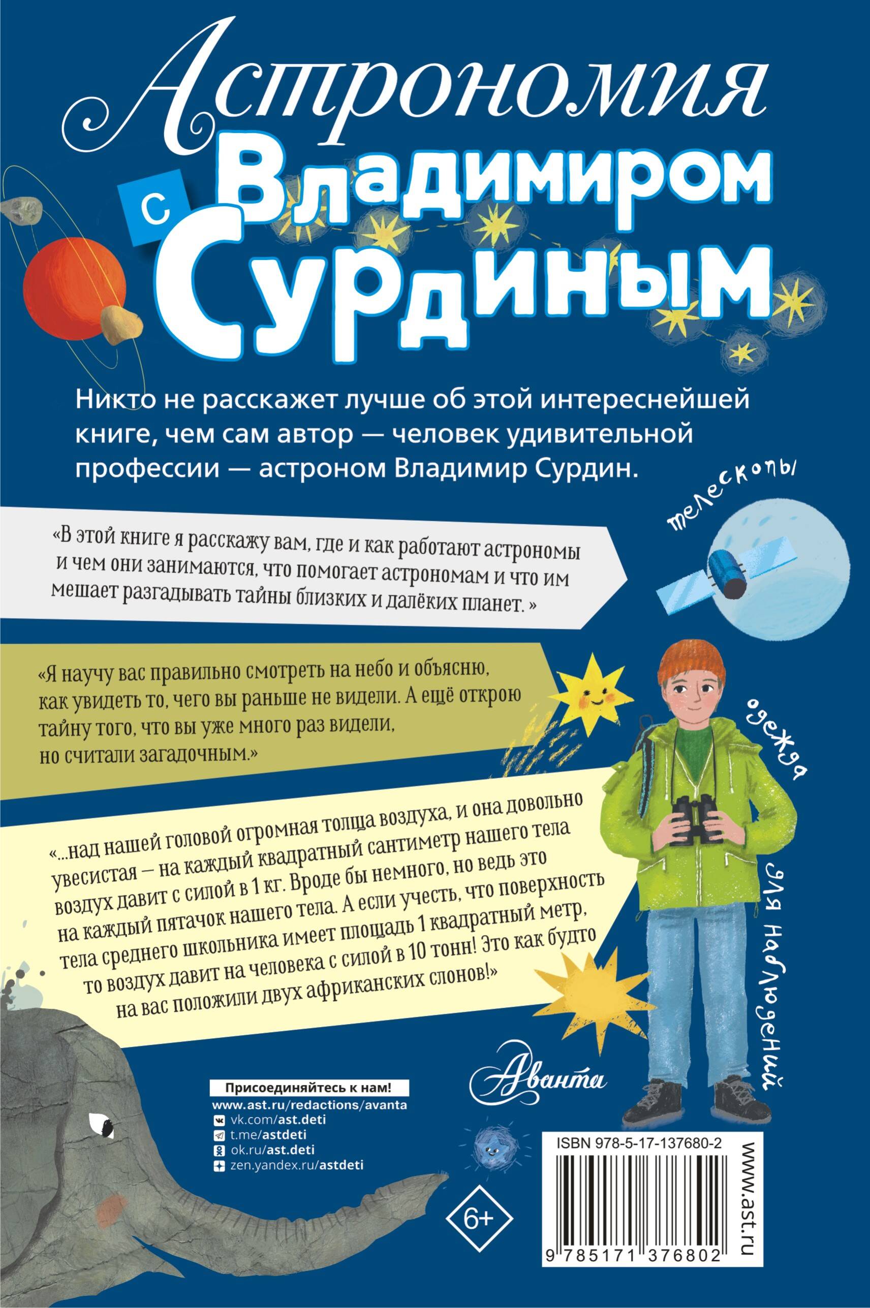 Автор книги известный астроном, преподаватель вуза, автор учебников и книг по астрономии, активный лектор, выступающий на самых разных площадках, популяризатор науки Владимир Георгиевич Сурдин. Это первая книга об астрономии Владимира Сурдина для детей. Написала очень просто и интересно. Живые яркие рисунки Виктории Китавиной, фотографии, карты звездного неба. Книга отлично подойдет для первого знакомства с астрономией. Для школьников средних классов.| Издательство | ИЗДАТЕЛЬСТВО "АСТ" |
