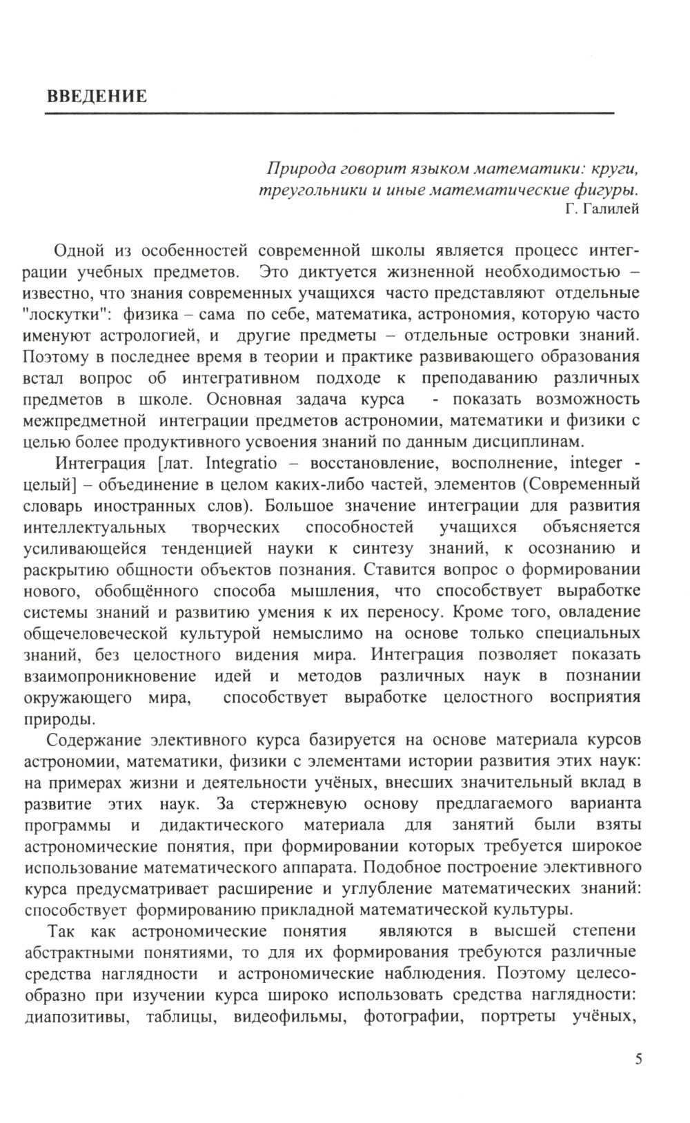 Настоящее пособие представляет собой авторский элективный курс "Астрономия в образах и цифрах", предназначенный для учащихся 8-11 классов общеобразовательных учреждений естественно-математического профиля. Курс основан на знаниях и умениях, полученных учащимися при изучении математики и физики с использованием астрономического материала. Основная задача курса - показать возможность межпредметной интеграции астрономии, математики и физики. В практической реализации знаний - показать возможность применения элементарных сведений из математики и физики для описания небесных тел и явлений. Приводятся обширный познавательный материал, анализ различных астрофизических явлений, задания для проведения наблюдений и методика проведения их, а также различные виды задач, для решения которых необходимы элементарные знания как по математике, так и по физике; показан путь расширения и углубления этих знаний. Кроме того, даются готовые разработки нестандартных занятий и заданий - в форме игры, викторины, конференции, астрофизического турнира, математического КВН, тематических кроссвордов для закрепления изученной информации, задания для проведения самостоятельных наблюдений и изготовления наглядных пособий для творческих конференций учащихся. Данный элективный курс направлен, прежде всего, на развитие познавательного интереса и на организацию самостоятельной практической деятельности учащихся. Пособие адресовано учителям, студентам педагогических вузов, а также будет полезно учащимся для подготовки к различного рода олимпиадам по астрономии, физике и математике.