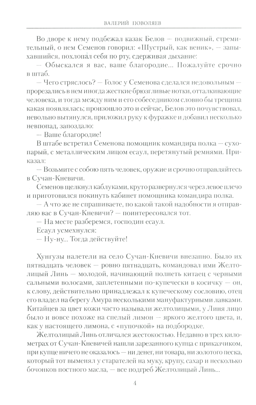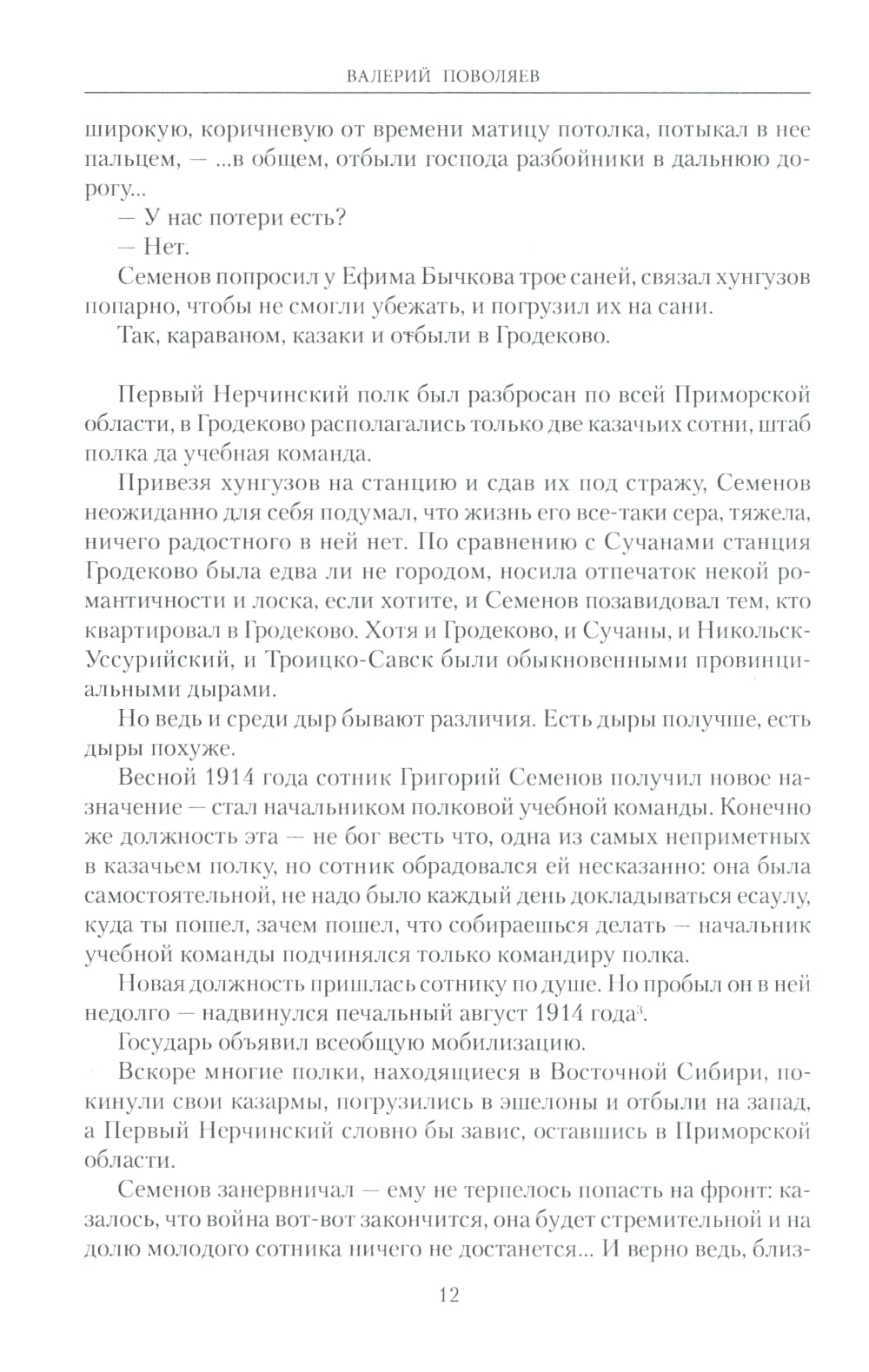 Новый роман известного современного писателя Валерия Поволяева «Атаман» посвящен жизнеописанию одного из наиболее выдающихся лидеров российского казачества генерал-лейтенанта Григория Михайловича Семенова (1890-1946). Этот весьма незаурядный человек и талантливый полководец не только прекрасно зарекомендовал себя на полях сражений Первой мировой, но и сумел организовать хорошо продуманное антибольшевистское сопротивление в Забайкалье в жестокие годы Гражданской войны.