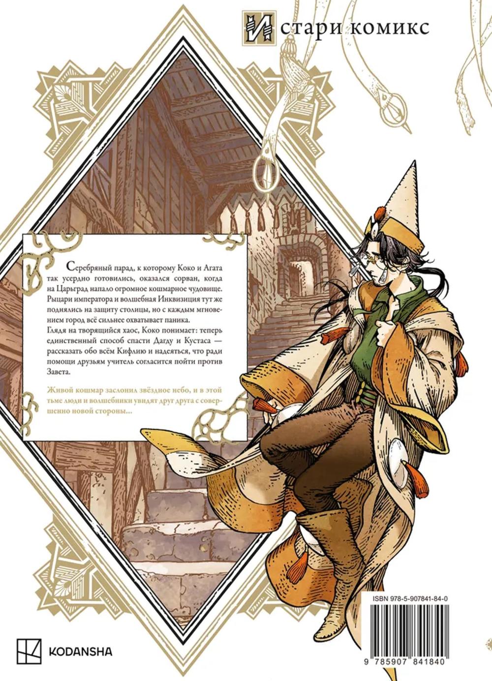 Серебряный парад, к которому Коко и Агата так усердно готовились, оказался сорван, когда на Царьград напало огромное кошмарное чудовище. Рыцари императора и волшебная Инквизиция тут же поднялись на защиту столицы, но с каждым мгновением город всё сильнее охватывает паника. Глядя на творящийся хаос, Коко понимает: теперь единственный способ спасти Дагду и Кустаса - рассказать обо всём Кифлию и надеяться, что ради помощи друзьям учитель согласится пойти против Завета. Живой кошмар заслонил звёздное небо, и в этой тьме люди и волшебники увидят друг друга с совершенно новой стороны...| Издательство | ИД Истари Комикс |