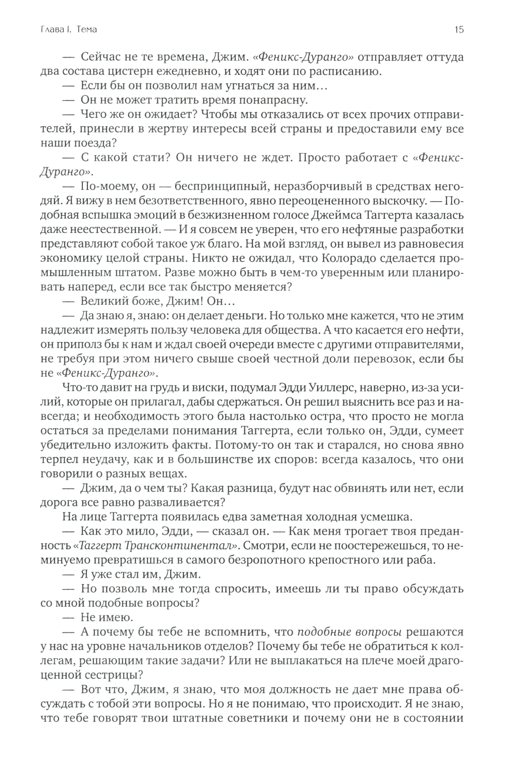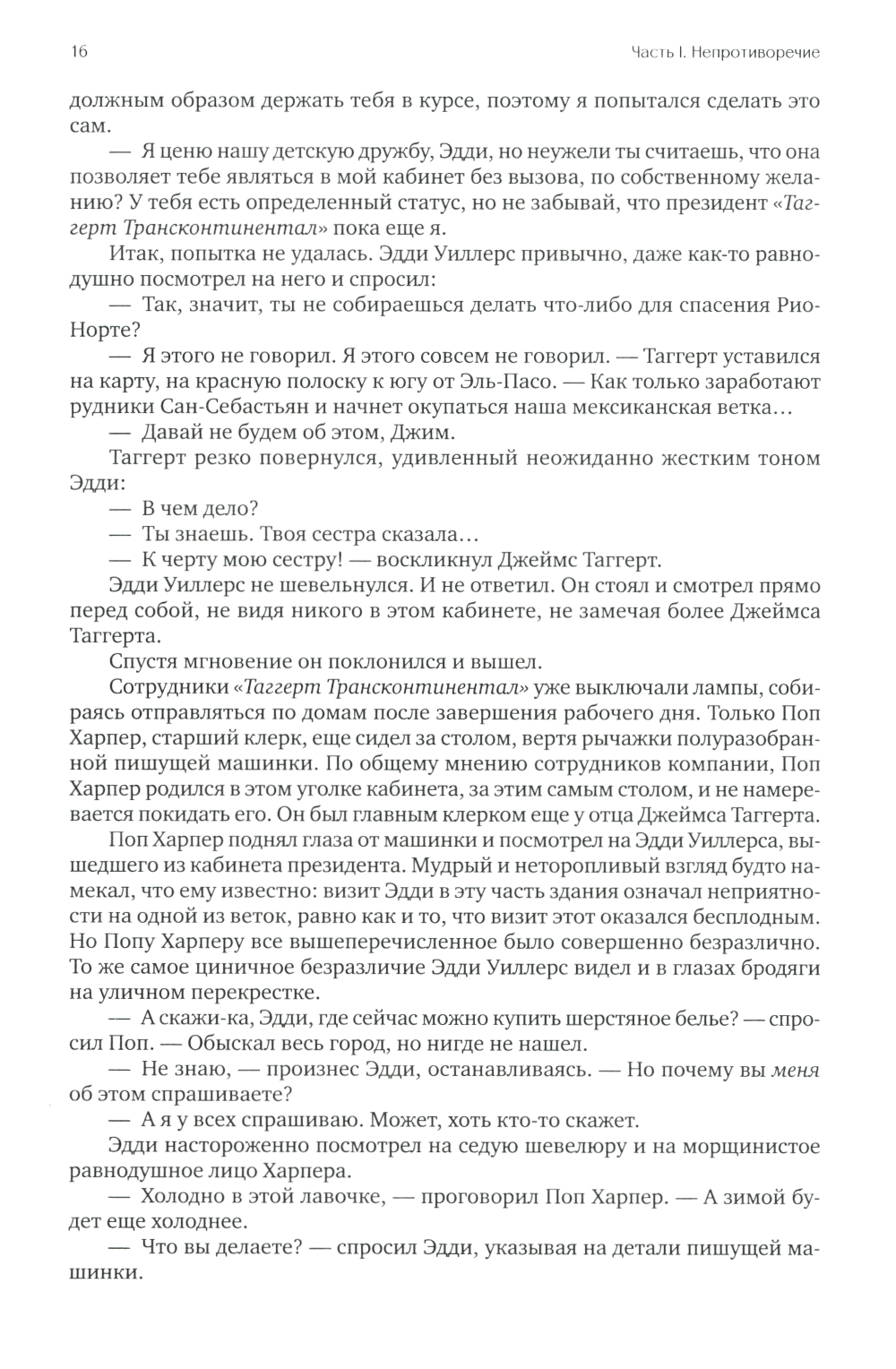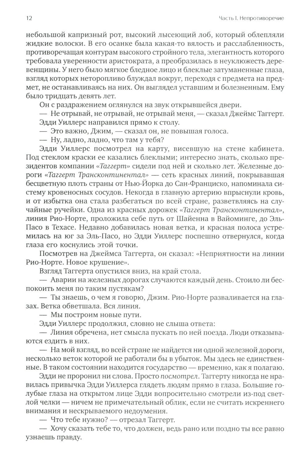 К власти в США приходят социалисты и правительство берет курс на «равные возможности», считая справедливым за счет талантливых и состоятельных сделать богатыми никчемных и бесталанных. Гонения на бизнес приводят к разрушению экономики, к тому же один за другим при загадочных обстоятельствах начинают исчезать талантливые люди и лучшие предприниматели. Главные герои романа стальной король Хэнк Риарден и вице-президент железнодорожной компании Дагни Таггерт тщетно пытаются противостоять трагическим событиям. Вместо всеобщего процветания общество погружается в апатию и хаос.| Издательство | Альпина Паблишер |