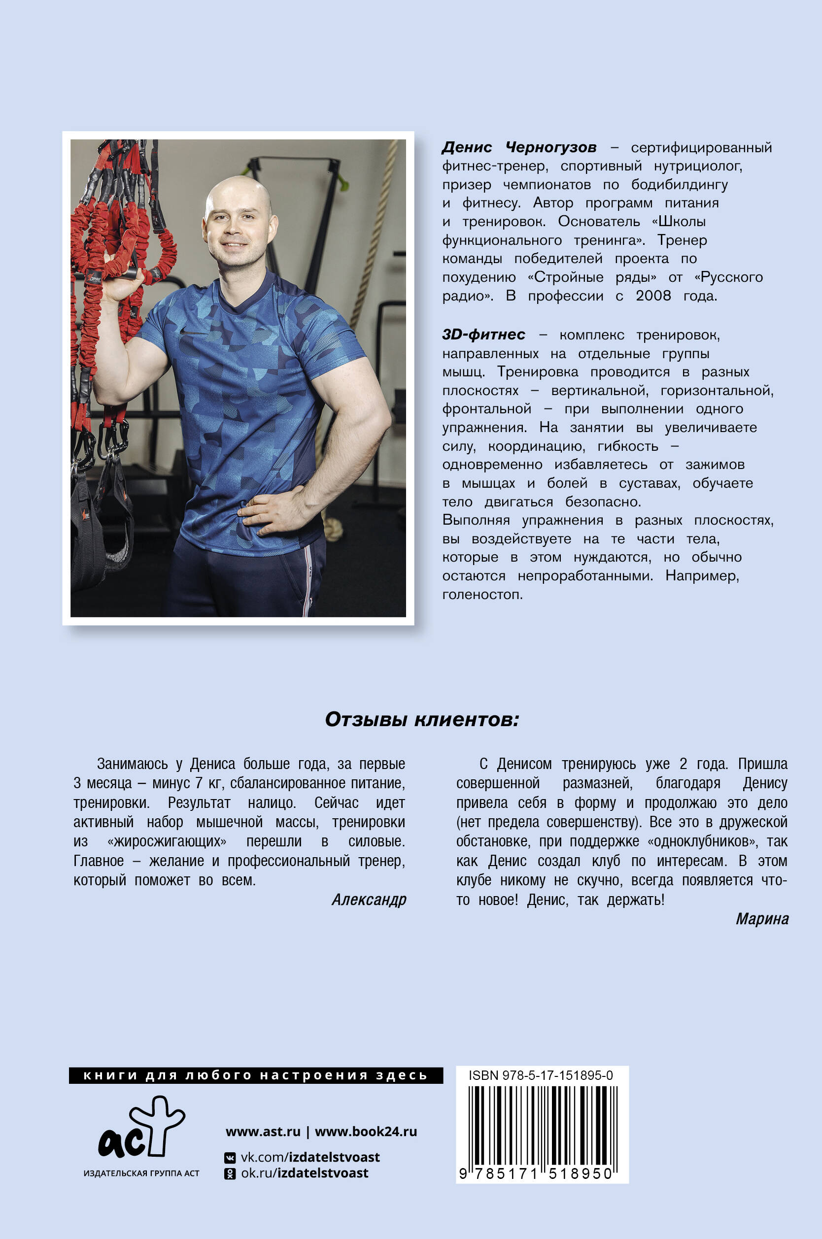 Боль в спине? Колени хрустят? Шея не гнется? Вам поможет 3D-фитнес! Выполняя упражнения в разных плоскостях, вы воздействуете на те части тела которые в этом нуждаются, но обычно остаются не проработанными. На занятии вы увеличиваете силу, координацию, гибкость - одновременно избавляетесь от зажимов мышцах, болей в суставах, даете телу двигаться безопасно. Денис Черногузов - сертифицированный фитнес-тренер, поможет вам освоить этот метод тренировок. Он является основателем «Школы функционального тренинга». В профессии с 2008 года.| Издательство | ИЗДАТЕЛЬСТВО "АСТ" |