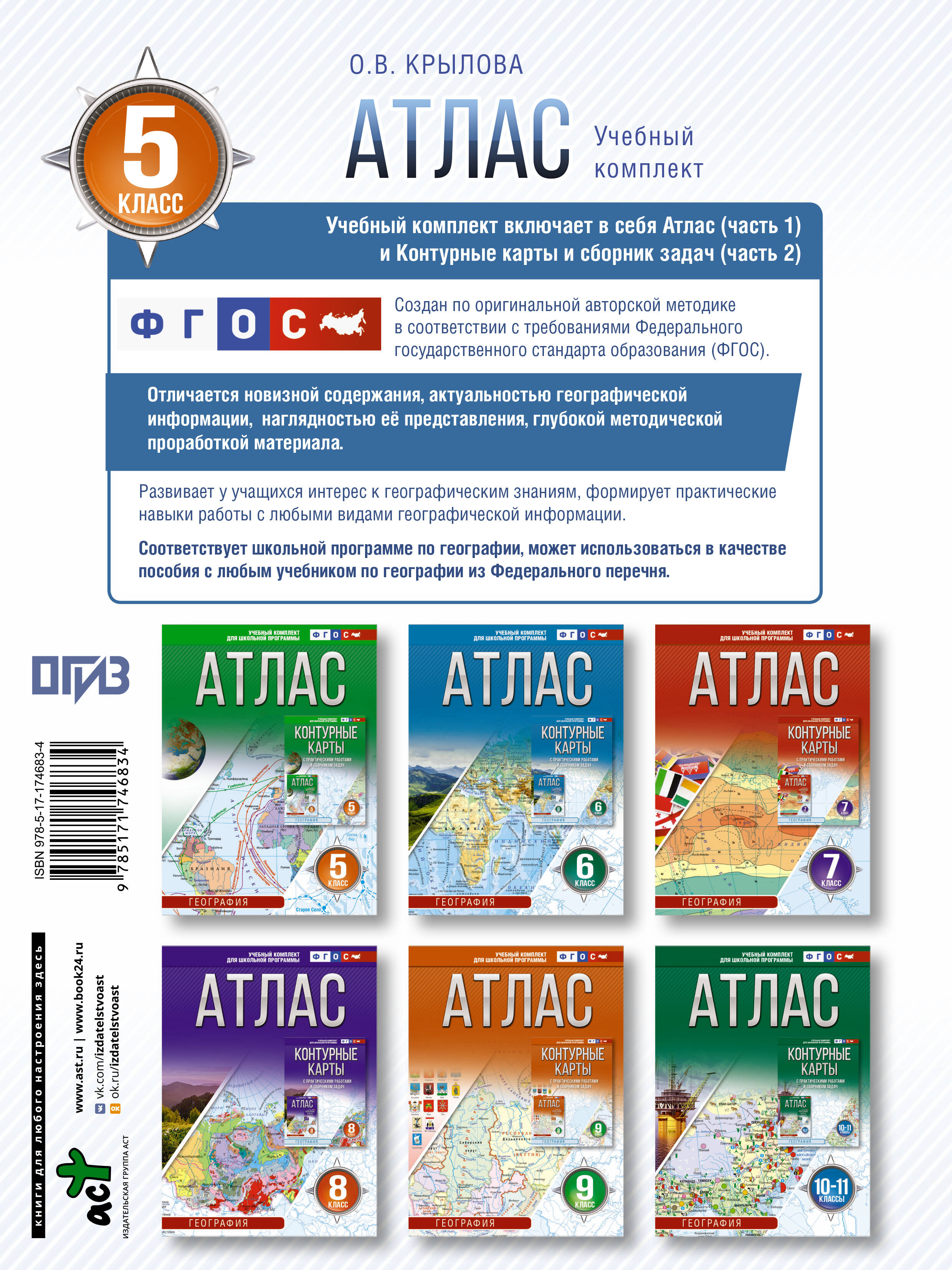 Атлас по географии для 5-го класса (автор - О.В. Крылова) имеет главную цель - привить учащимся интерес к географическим знаниям. Содержание атласа направлено на усвоение учащимися основ знаний о Вселенной и планете Земля, а также на формирование у них первоначальных картографических умений: определять стороны горизонта и взаиморасположение географических объектов, составлять элементарные географические описания, сравнивать и классифицировать. Созданный по оригинальной авторской методике в соответствии с "Концепцией развития географического образования в Российской Федерации", атлас характеризуется новизной содержания, универсальностью, нацеленностью на развитие творческого начала у школьников. Атлас соответствует требованиям ФГОС и одобрен методистами. Россия в атласе представлена в новых границах: с Донецкой и Луганской народными республиками, Запорожской и Херсонской областями, Республикой Крым и Севастополем.| Издательство | Издательство "АСТ" |