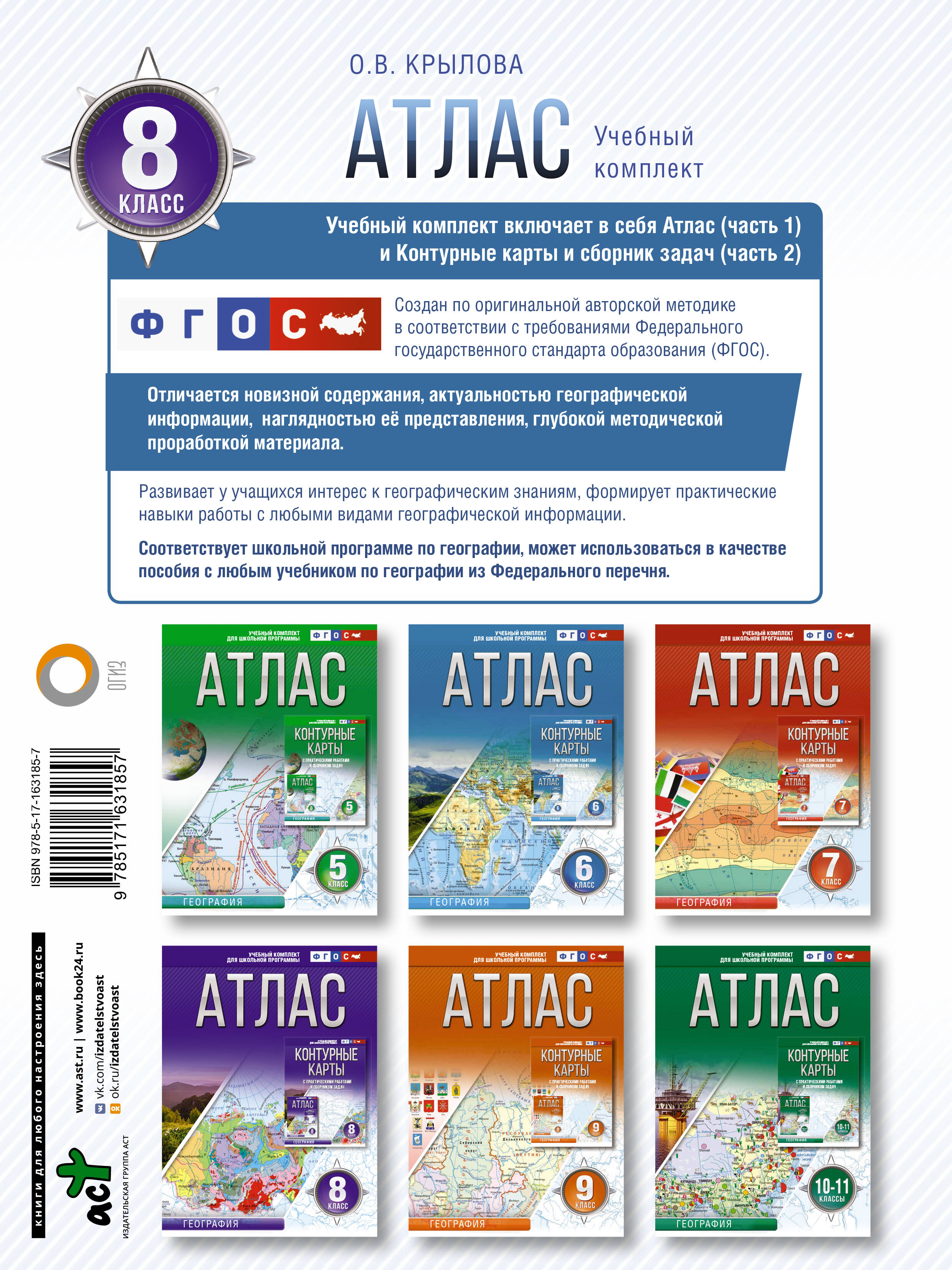 Атлас по географии для 8-го класса (автор - О.В. Крылова) разработан в соответствии с «Концепцией развития географического образования в Российской Федерации» и направлен на формирование знаний о географическом, природном, культурном, этнографическом и социально экономическом разнообразии России. Картографические и текстовые материалы, а также многочисленные иллюстрации атласа способствуют формированию географической культуры обучающихся, расширяют их географические знания о родной стране и своей «малой Родине» и должны помочь учащимся овладеть универсальными учебными действиями в соответствии с требования ФГОС.Атлас подходит ко всем школьным программам и учебникам по географии, соответствует требованиям ФГОС и одобрен методистами. Россия в атласе представлена в новых границах: с Донецкой и Луганской народными республиками, Запорожской и Херсонской областями, Республикой Крым и Севастополем.| Издательство | Издательство "АСТ" |