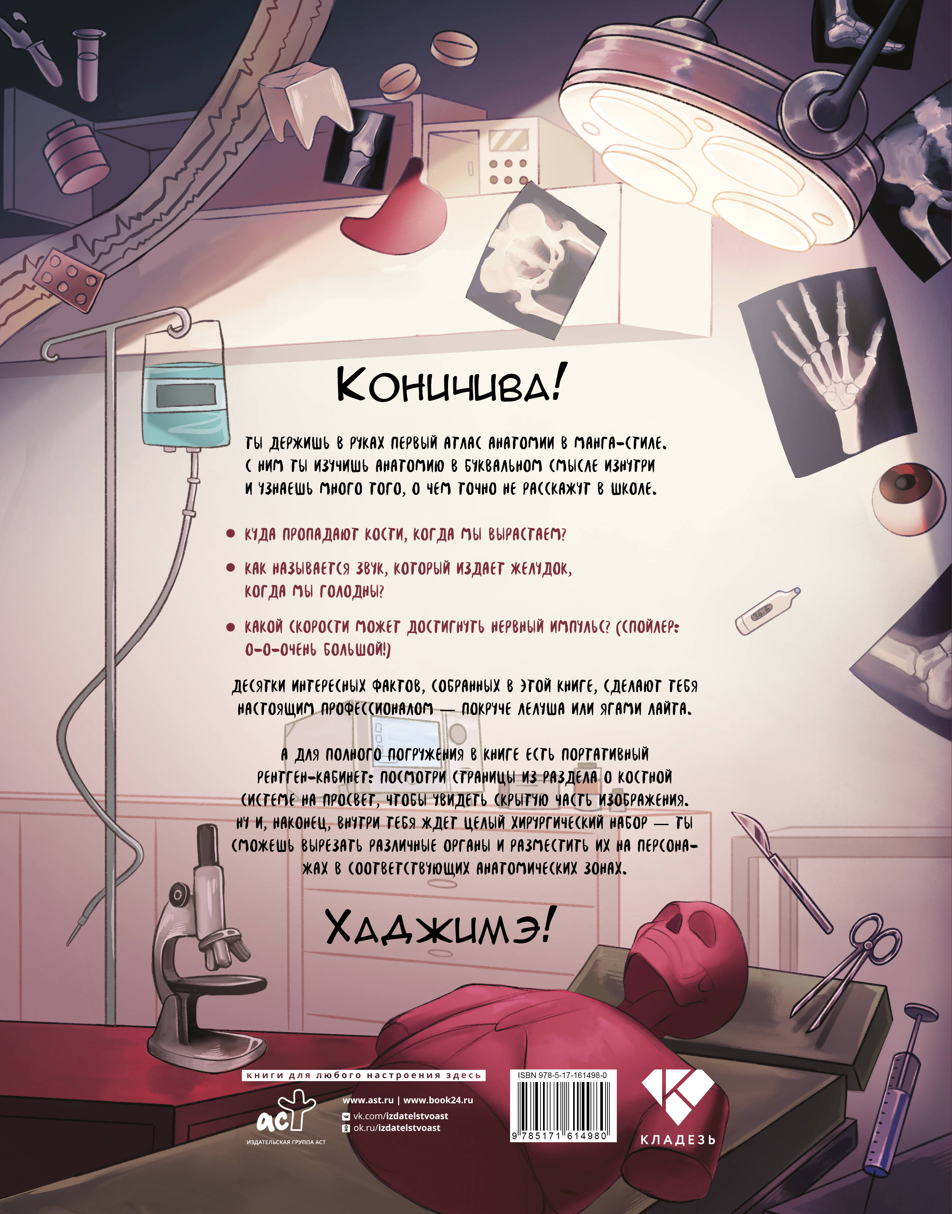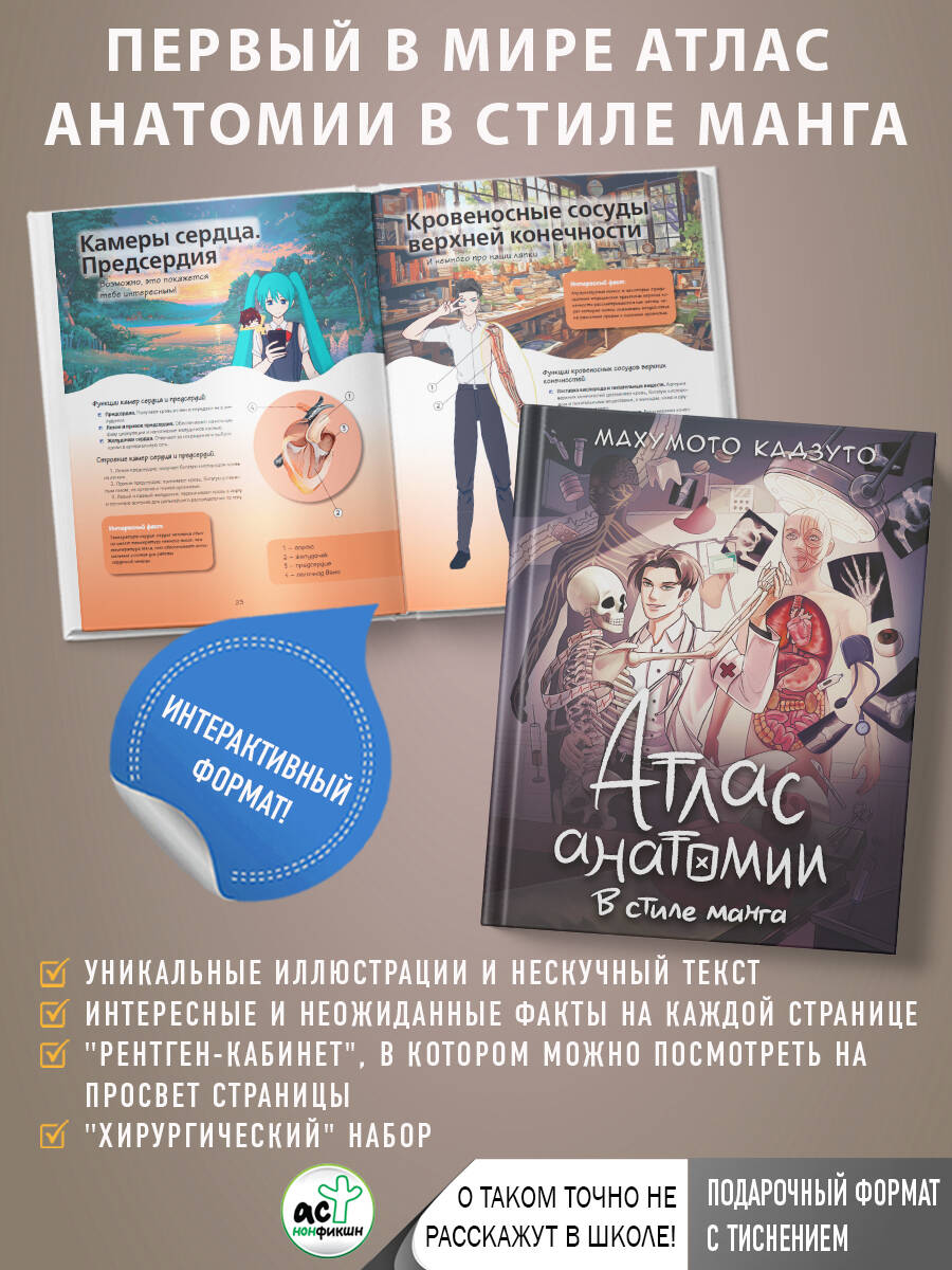 Коничива! Ты держишь в руках первый атлас анатомии в манга-стиле. С ним ты изучишь анатомию в буквальном смысле изнутри и узнаешь много того, о чем точно не расскажут в школе. • Куда пропадают кости, когда мы вырастаем? • Как называется звук, который издает желудок, когда мы голодны? • Какой скорости может достигнуть нервный импульс? (Спойлер: о-о-очень большой!) Десятки интересных фактов, собранных в этой книге, сделают тебя настоящим профессионалом - покруче Лелуша или Ягами Лайта. А для полного погружения в книге есть портативный рентген-кабинет: посмотри страницы из раздела о костной системе на просвет, чтобы увидеть скрытую часть изображения. Ну и, наконец, внутри тебя ждет целый хирургический набор - ты сможешь вырезать различные органы и разместить их на персонажах в соответствующих анатомических зонах. Хаджимэ!| Издательство | Издательство "АСТ" |