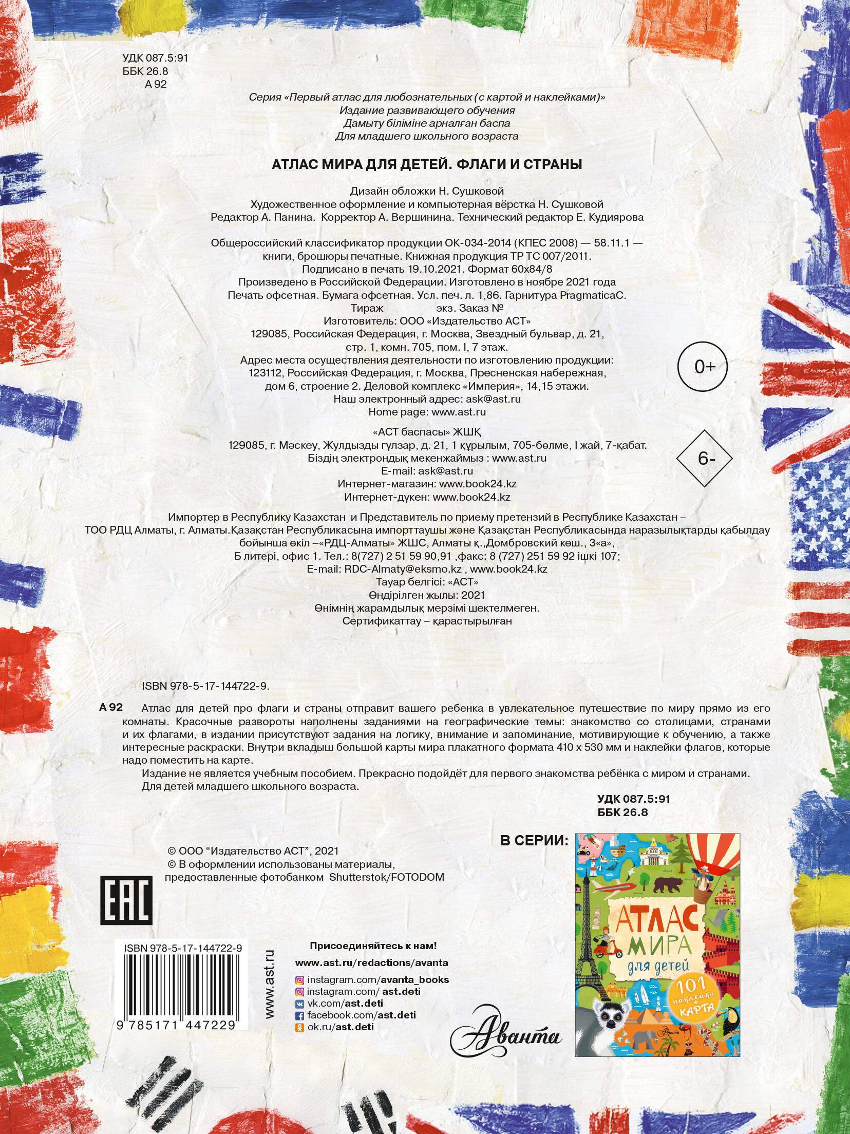 Атлас для детей про флаги и страны отправит вашего ребенка в увлекательное путешествие по миру прямо из его комнаты. Красочные развороты наполнены заданиями на географические темы: знакомство со столицами, странами и их флагами, в издании присутствуют задания на логику, внимание и запоминание, мотивирующие к обучению, а также интересные раскраски. Внутри вкладыш большой карты мира плакатного формата 410 х 530 мм и наклейки флагов, которые надо поместить на карте. Издание отлично подойдет для первого знакомства с миром и странами и не является учебным пособием. Для детей младшего школьного возраста.