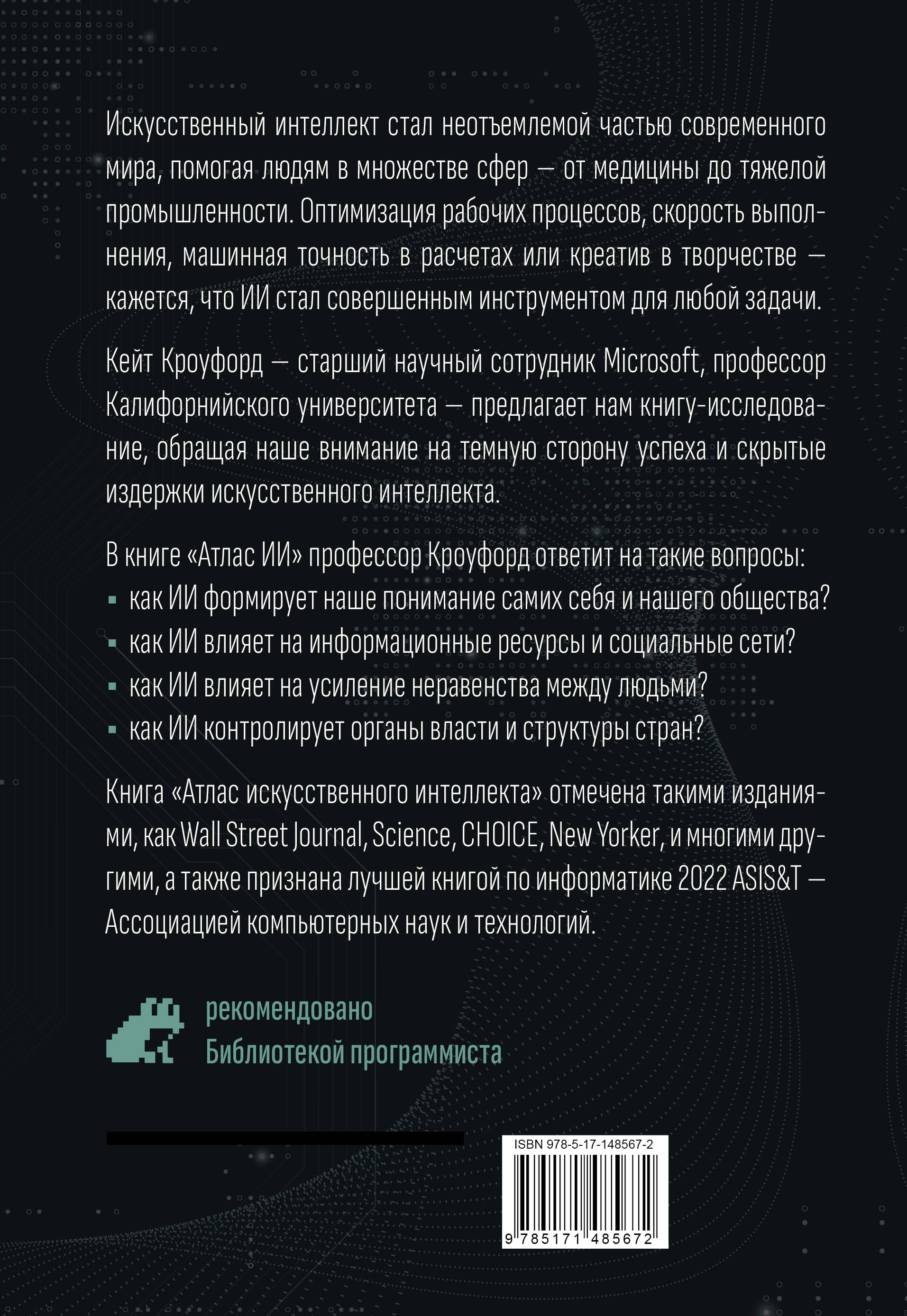 Искусственный интеллект стал неотъемлемой частью современного мира, помогая людям в множестве сфер - от медицины до тяжелой промышленности. Оптимизация рабочих процессов, скорость выполнения, машинная точность в расчетах или креатив в творчестве - кажется, что ИИ стал совершенным инструментом для любой задачи. Кейт Кроуфорд - старший научный сотрудник Microsoft, профессор Калифорнийского университета - предлагает нам книгу-исследование, обращая наше внимание на темную сторону успеха и скрытые издержки искусственного интеллекта. В книге "Атлас ИИ" профессор Кроуфорд ответит на такие вопросы: - как ИИ формирует наше понимание самих себя и нашего общества? - как ИИ влияет на информационные ресурсы и социальные сети? - как ИИ влияет на усиление неравенства между людьми? - как ИИ контролирует органы власти и структуры стран? Книга "Атлас искусственного интеллекта" отмечена такими изданиями как Wall Street Journal, Science, CHOICE, New Yorker и многими другими, а также признана лучшей книгой по информатике 2022 ASIS&T - ассоциации компьютерных наук и технологий.| Издательство | Издательство "АСТ" |