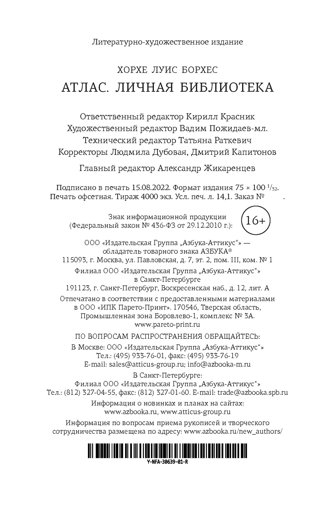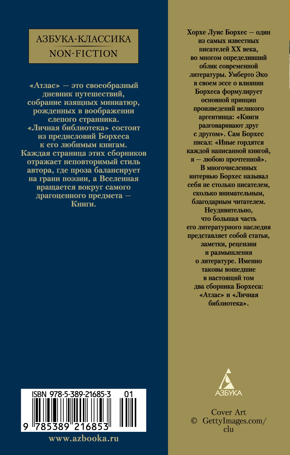 Хорхе Луис Борхес - один из самых известных писателей ХХ века, во многом определивший облик современной литературы. Умберто Эко в своем эссе о влиянии Борхеса формулирует основной принцип произведений великого аргентинца: «Книги разговаривают друг с другом». Сам Борхес писал: «Иные гордятся каждой написанной книгой, я - любою прочтенной». В многочисленных интервью Борхес называл себя не столько писателем, сколько внимательным, благодарным читателем. Неудивительно, что большая часть его литературного наследия представляет собой статьи, заметки, рецензии и размышления о литературе. Именно таковы вошедшие в настоящий том два сборника Борхеса: «Атлас» и «Личная библиотека». «Атлас» - это своеобразный дневник путешествий, собрание изящных миниатюр, рожденных в воображении слепого странника. «Личная библиотека» состоит из предисловий Борхеса к его любимым книгам. Каждая страница этих сборников отражает неповторимый стиль автора, где проза балансирует на грани поэзии, а Вселенная вращается вокруг самого драгоценного предмета - Книги.| Издательство | Азбука |